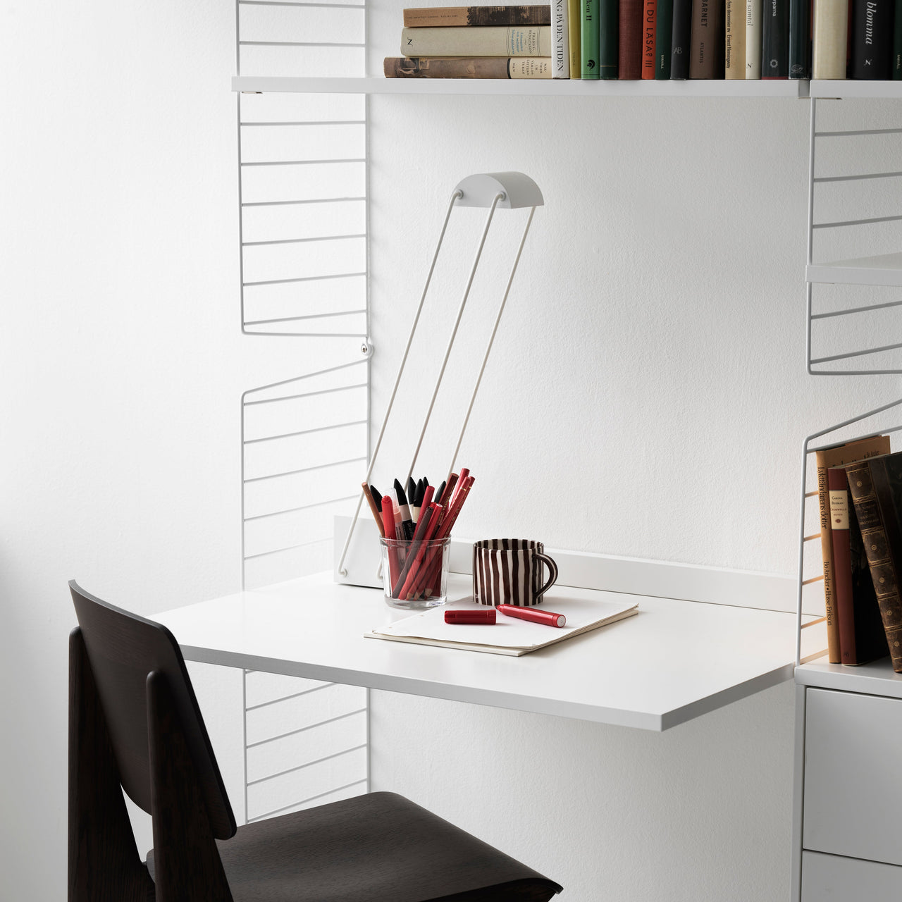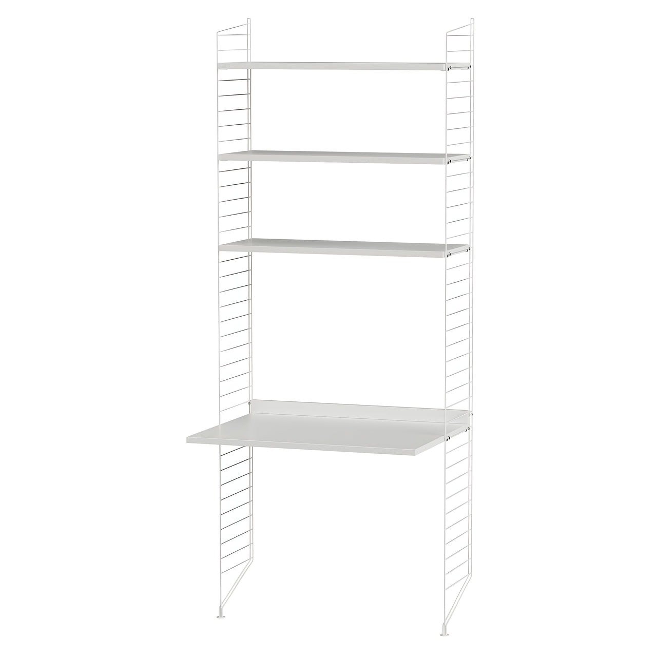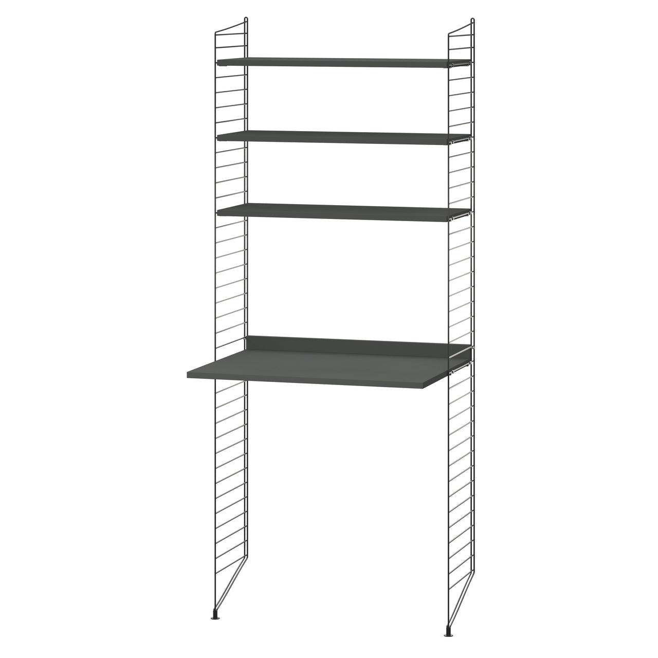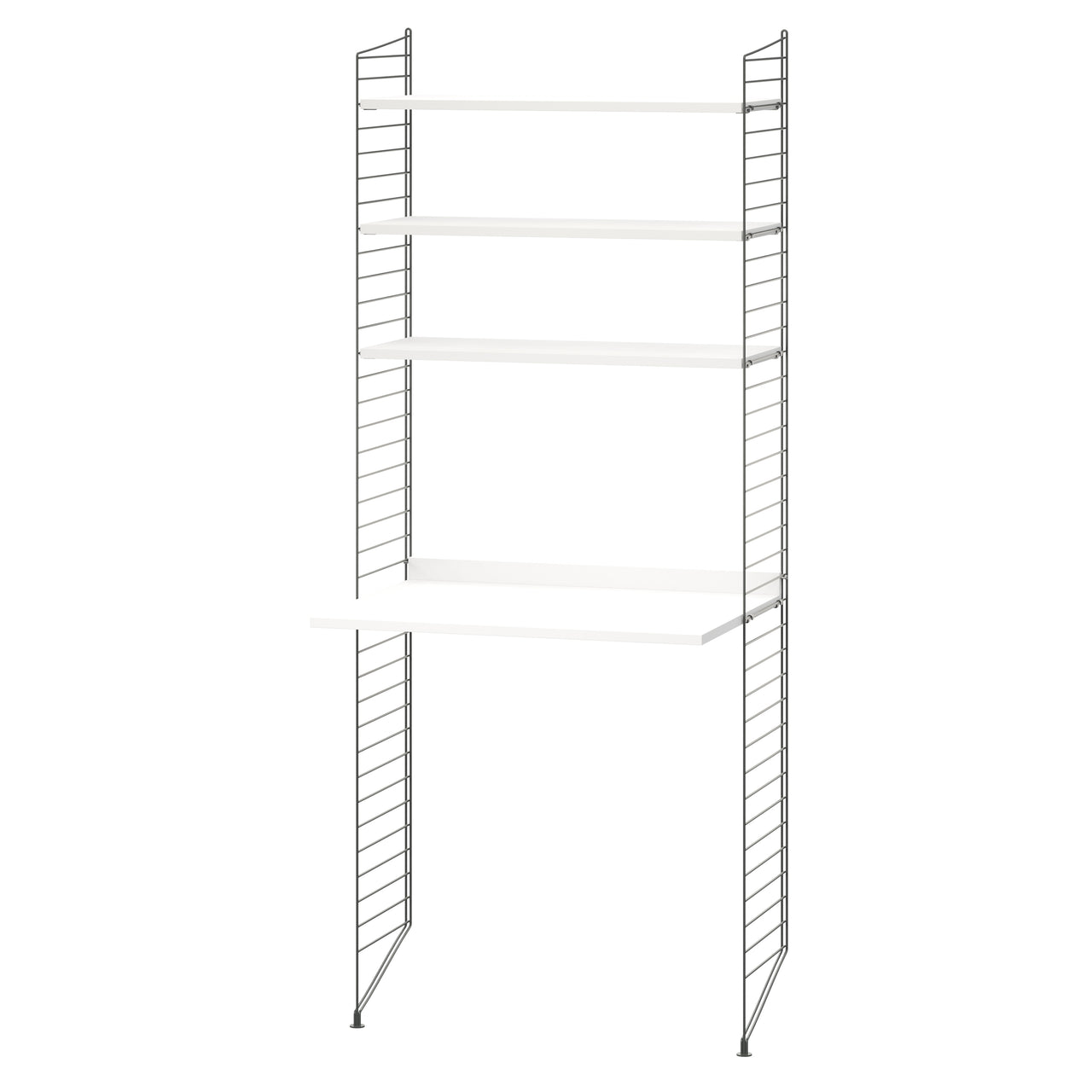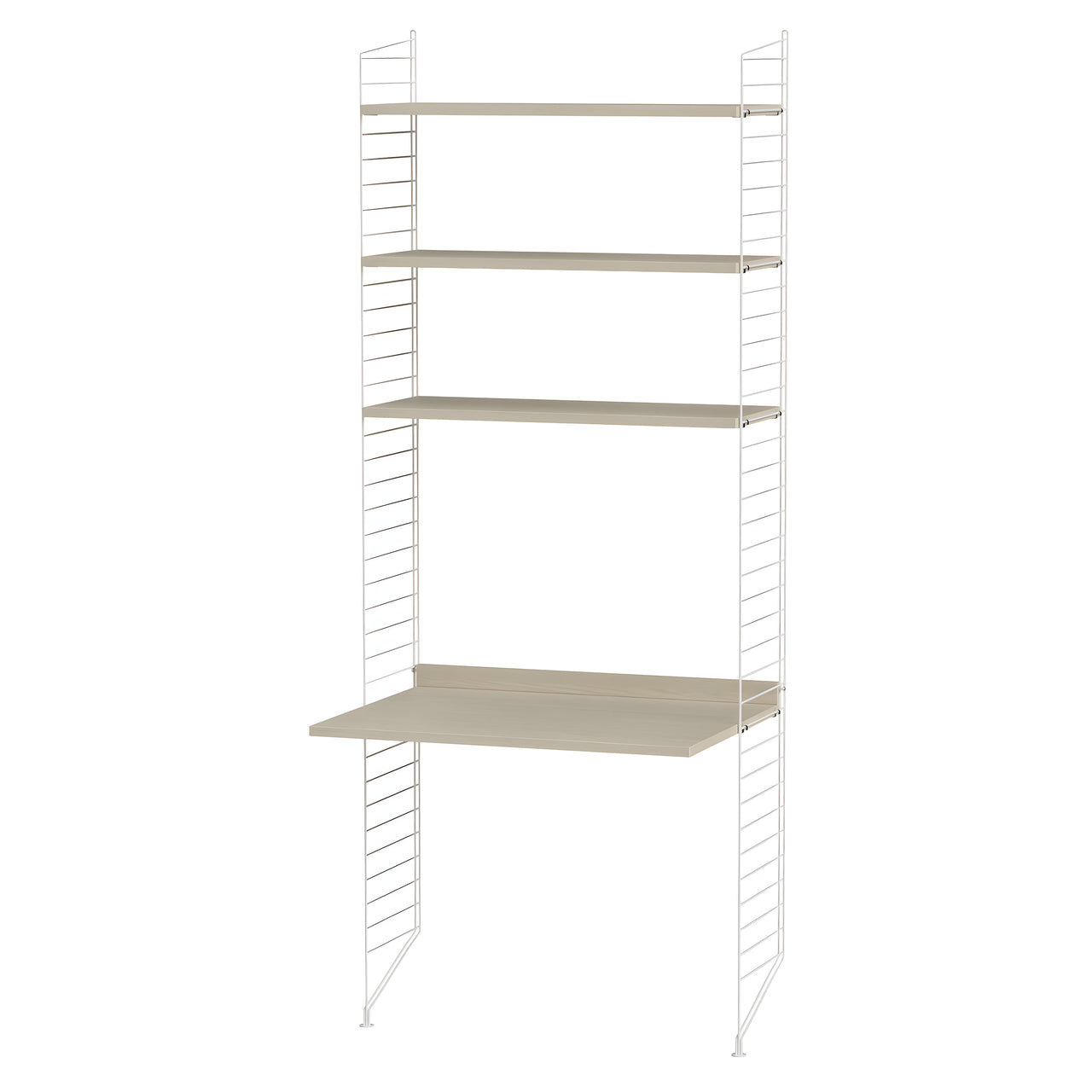 For office or home, this floor-mounted String single bay maximizes a limited workspace. Combining 3 spacious upper shelves and an extended desktop in the familiar coated-wire structure, it's available in the collection’s full range of woodgrain veneer and painted finishes. String's series of pre-arranged bundles is also infinitely expandable as needs change in the future—another testament to the genius of Nisse Strinning's enduring 1949 modular system.