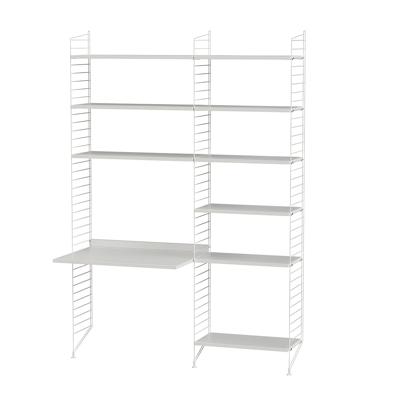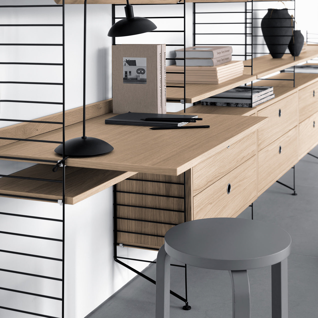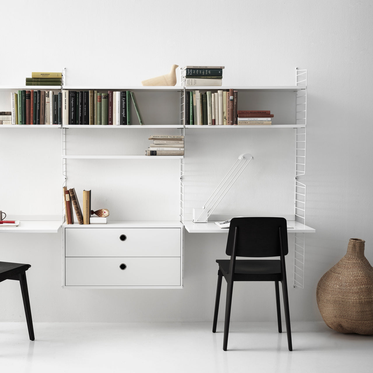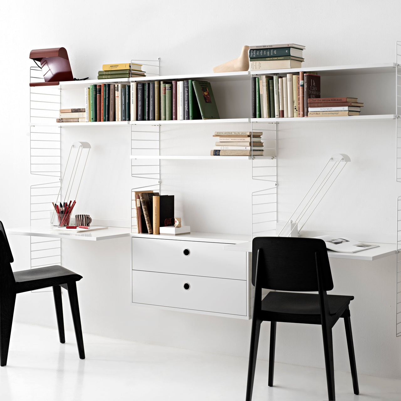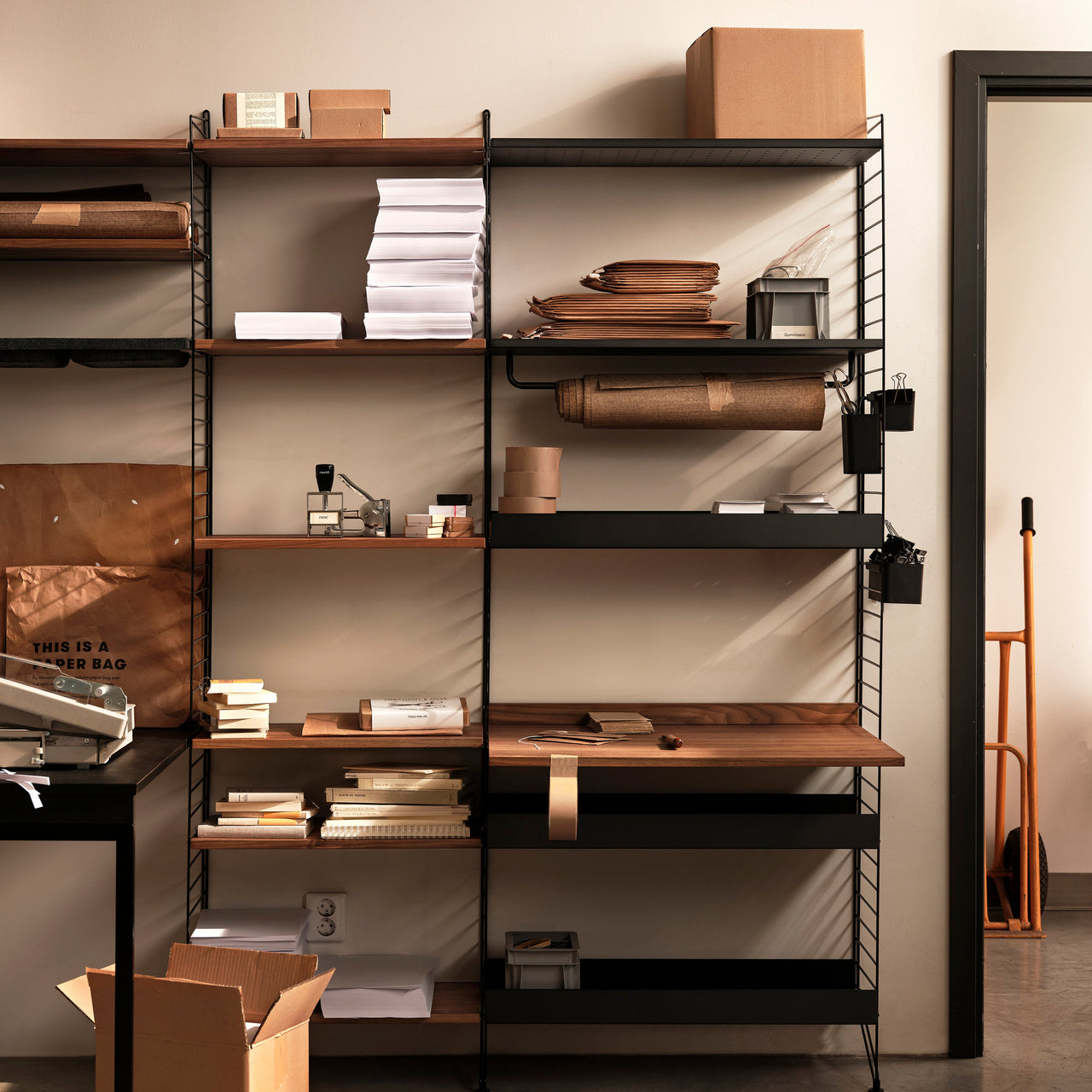 String doubles up in 2 floor-mounted bays with multiple shelves and an expanded desktop in this pre-selected composition for a home or office workspace. With storage for books or other record-keeping above, it also provides additional shelves within easy reach of the desktop. Available in woodgrain veneer or painted finishes with the signature coated-wire frame, String's bundles are also infinitely expandable for future needs, as generations of devotees have discovered since the 1949 debut of Nisse Strinning's innovative system.