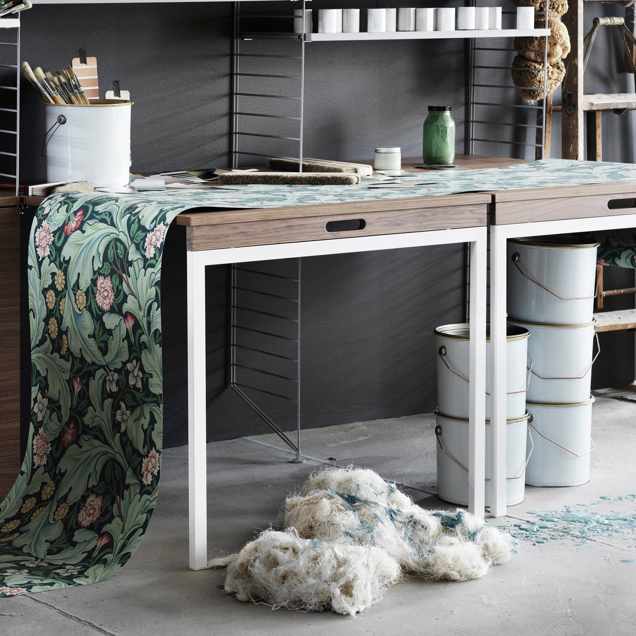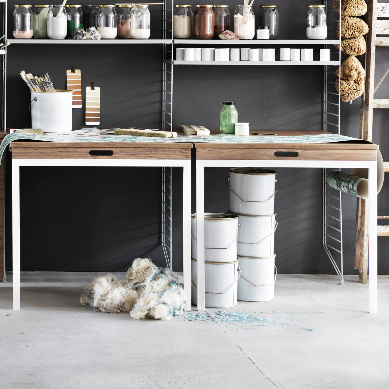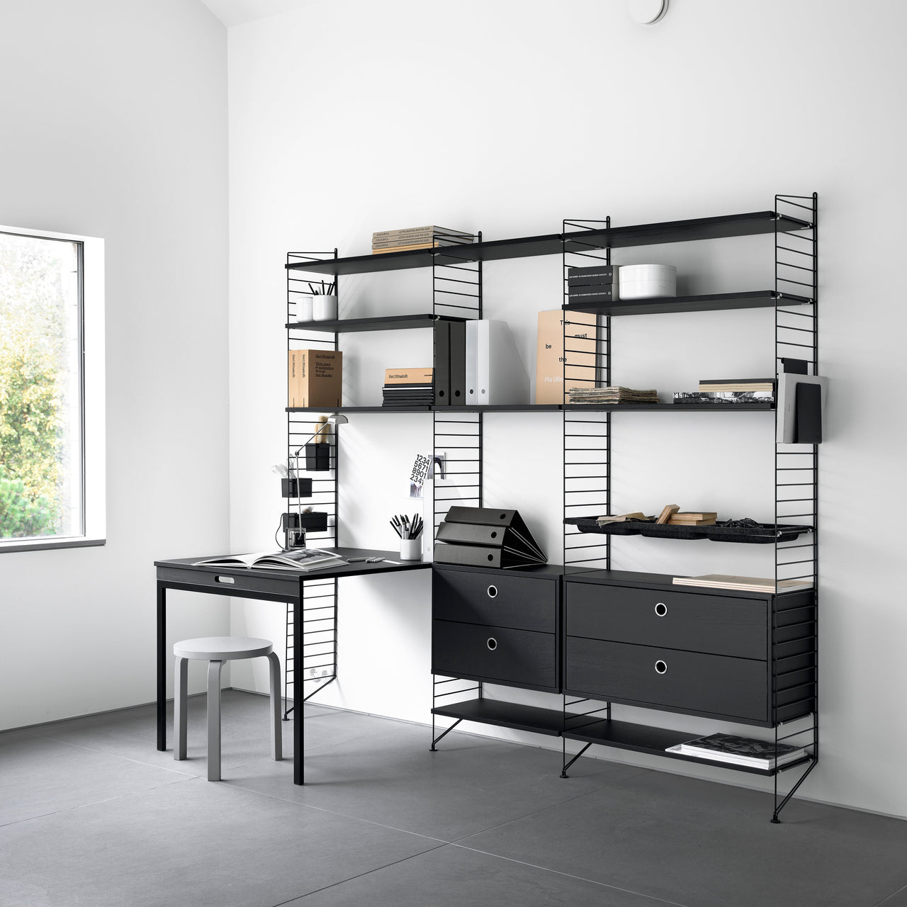 This pre-configured String unit offers the welcome opportunity to camouflage a home or office workspace. Along with the fold-down desk and a pair of clutter-concealing drawers, the double-bay coated wire frame also includes additional open shelving. Like all of String's select combinations, it’s compatible with all the elements of Nisse Strinning’s innovative system and can be readily expanded as needs dictate.