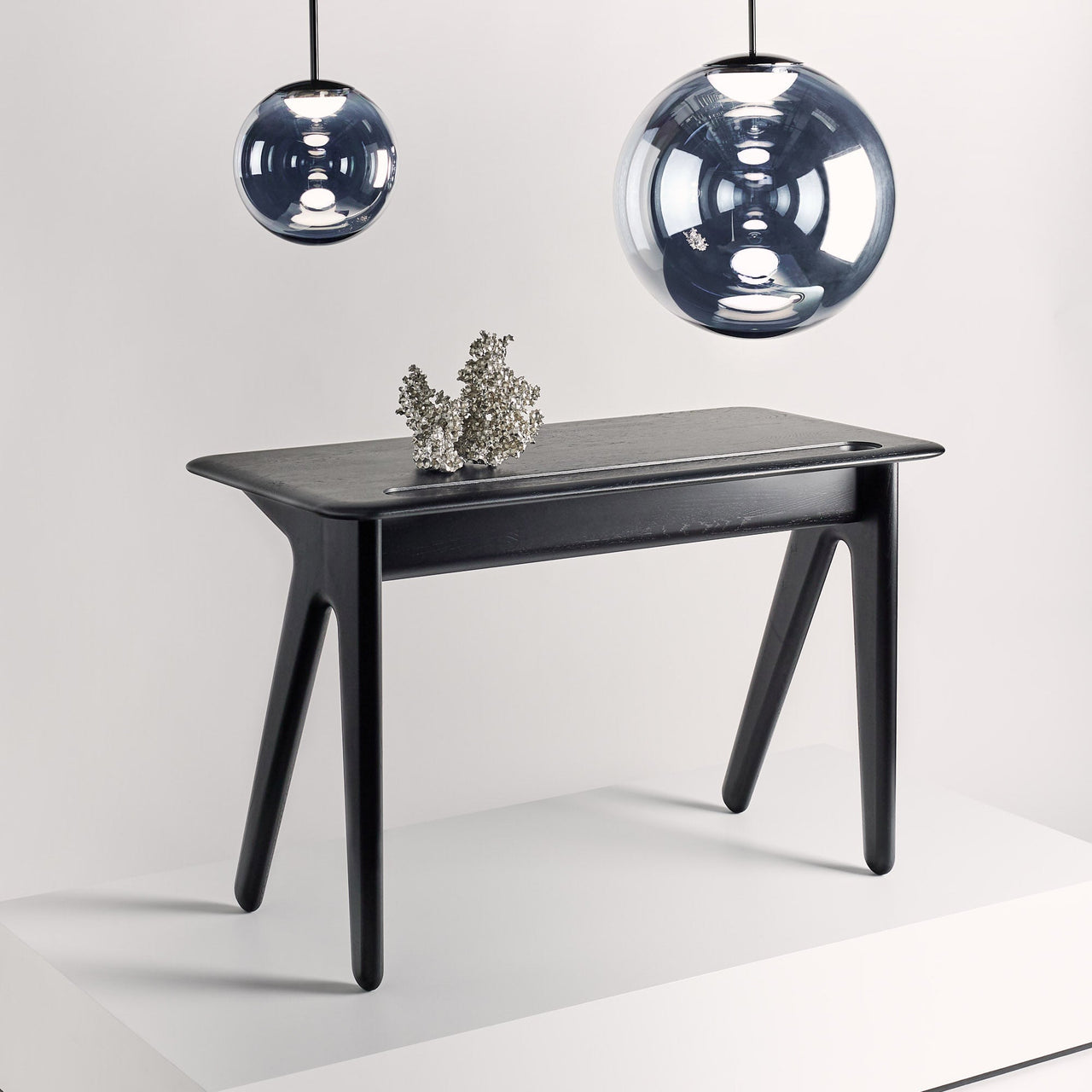 Tom Dixon reaches way back into England's past for a versatile contemporary work station based on a Victorian school desk. With softly rounded edges and sleeker proportions, Tom carries the idea through even to the traditional inkwell rethought as a cable management hole and a handy groove for pens and pencils. Slab's proportions also suit the limited space of a home office or placement in a hotel room—and it also makes for a wonderfully modern, non-frilly makeup table.