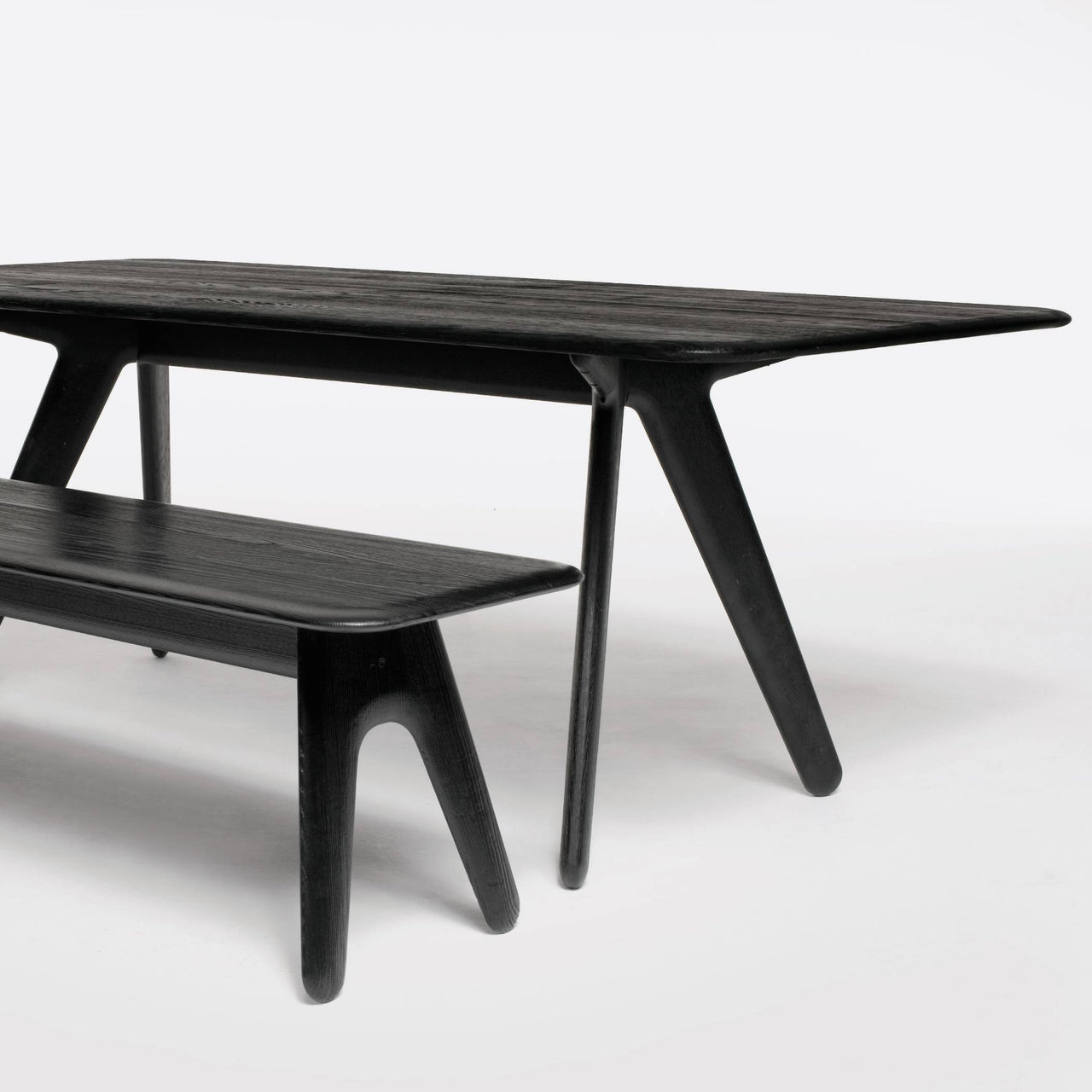 Reveling in the natural beauty of wood construction, Brit designer Tom Dixon offers a robust dining table with an angular look of inviting simplicity. Slab has generous proportions and a tabletop softened with a gentle radius edge and is completely made from solid oak, sourced from sustainably managed forests. The surface of the wood is deeply brushed to expose the characteristic grain, available in a natural finish, black lacquer or fumed oak.