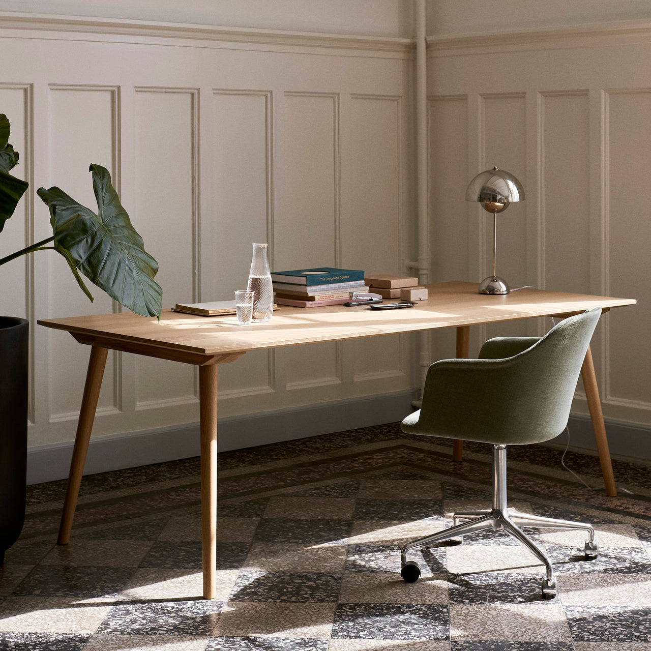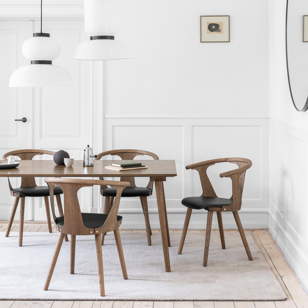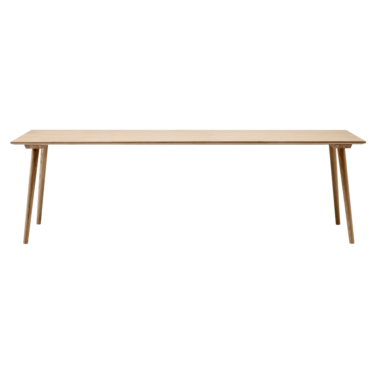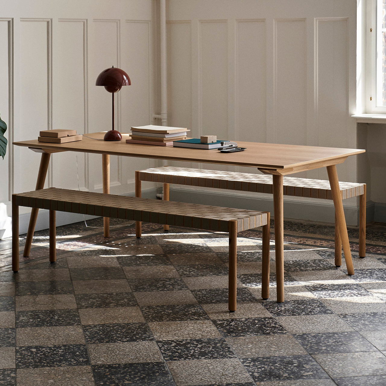 With his solid oak In Between Table, Finnish-born designer Sami Kallio explores how an object interacts with its surrounding space. The slim silhouette and absence of ornamentation make it an ideal match for any chair—and especially suited to his companion In Between Chair, as the legs of the table echo the angle of the front legs of the chair. Such faultless simplicity is achieved through a combination of traditional hand craftsmanship, involving compression molding and woodturning, and innovative modern veneer techniques. Rectangular version available in two sizes. Copenhagen-based &Tradition's Martin Kornbek Hansen lauds Sami's "uncanny ability to design an object so simple, it exudes beauty.