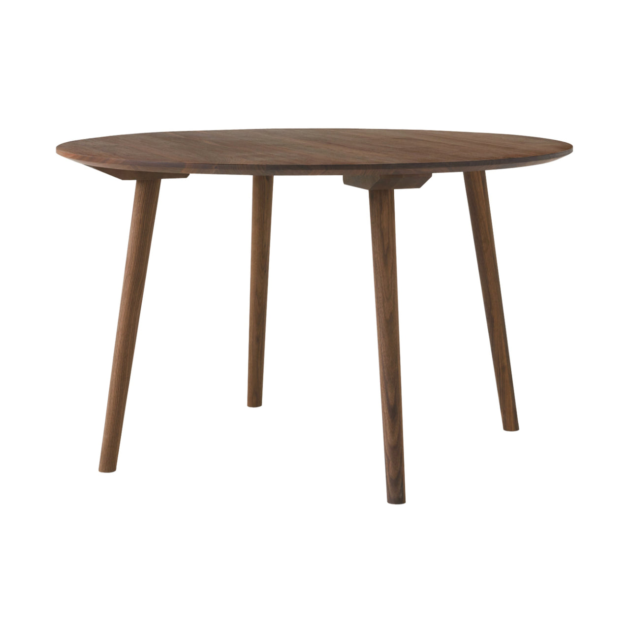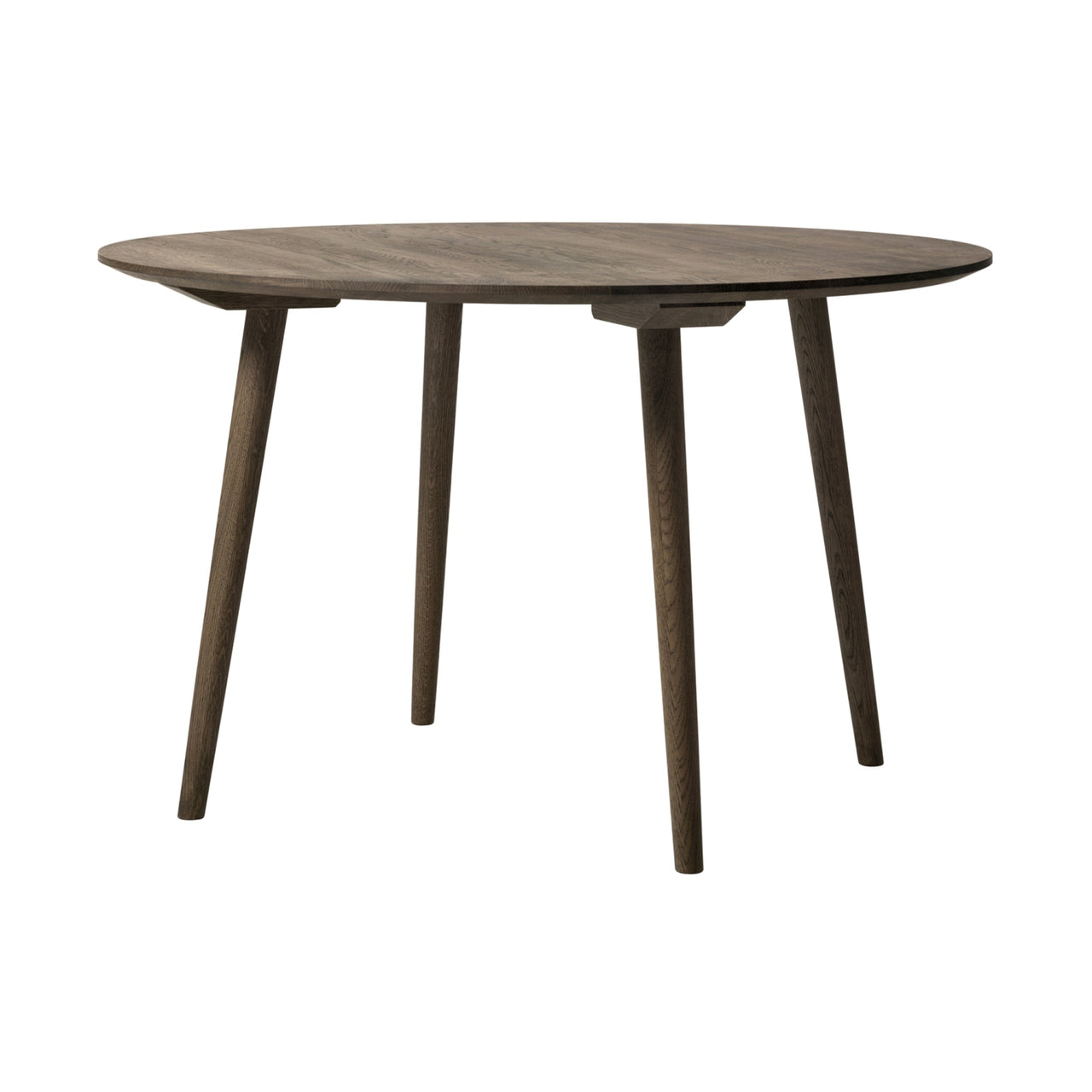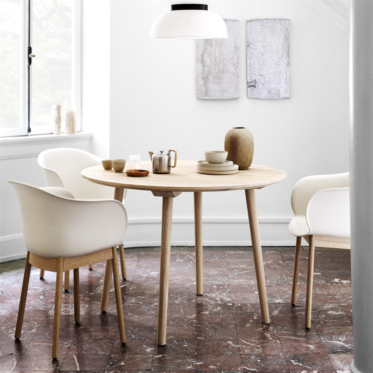 The traditional technique that uses a lathe to shape wood—known as woodturning—is part of the fabrication of the slender, solid oak legs that hold up the round plank top. The legs also echo the angle of the front legs of its companion chair in the In Between series by Sami Kallio. It's "so simple," remarks Martin Kornbek Hansen, founder of &Tradition, which produces the collection in Denmark, "it exudes beauty. Sami's approach couples old school craft and modern considerations: compression molding and innovative veneer techniques are also part of the production process; and the table comes disassembled as a flat pack, addressing both environmental sensitivities and ease of transport. Like its rectangular sibling, the round version is available in two sizes.