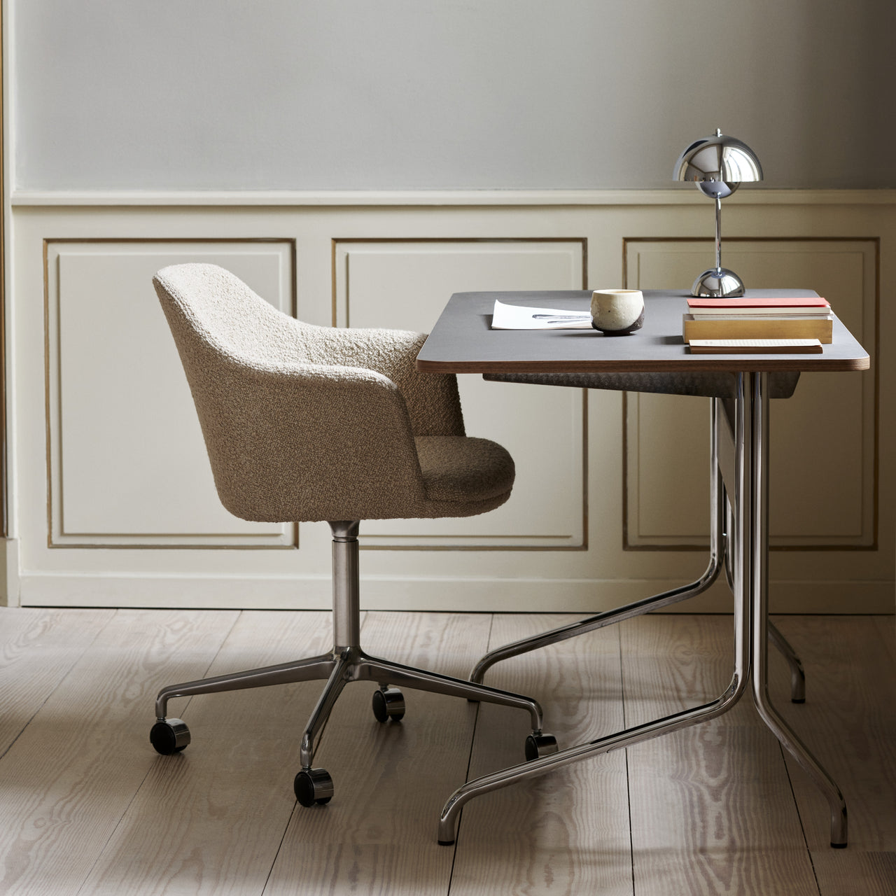 Anderssen & Voll take a design cue from Copenhagen’s circa-1958 waterfront Langelinie Pavilion for a compact desk to suit office and home spaces. Both graceful and practical, it echoes the modernist landmark with a slender but sturdy framework of bent steel tubing. In a choice of standard and high models, the desktop is surfaced in linoleum with the backboard made from form-pressed veneer; the frame comes in a complementary choice of metal finishes.