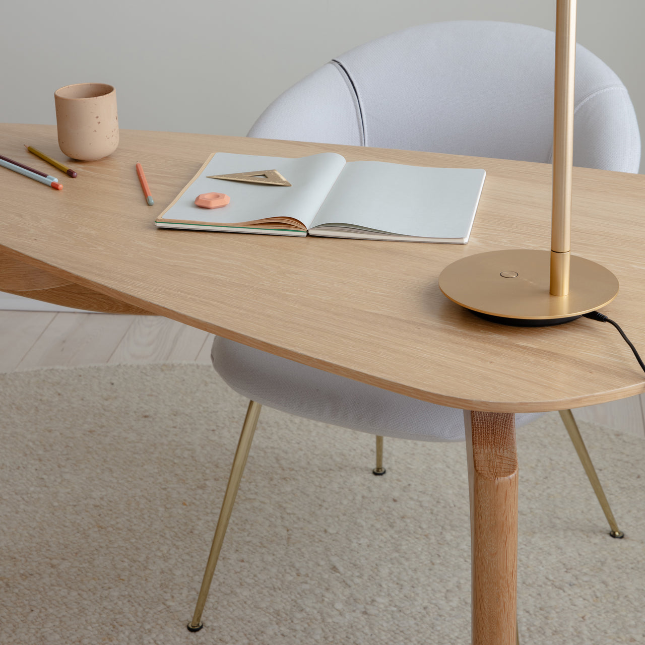 The Duende Desk offers a spacious workspace with a soft triangular tabletop and a discreet drawer beneath for convenient storage. Designed by Anders Klem, known for his focus on organic shapes, the desk's oak veneer construction adds a natural touch to any room. Its airy design allows it to fit gracefully into various settings, whether placed in a corner or as a centerpiece in an office.