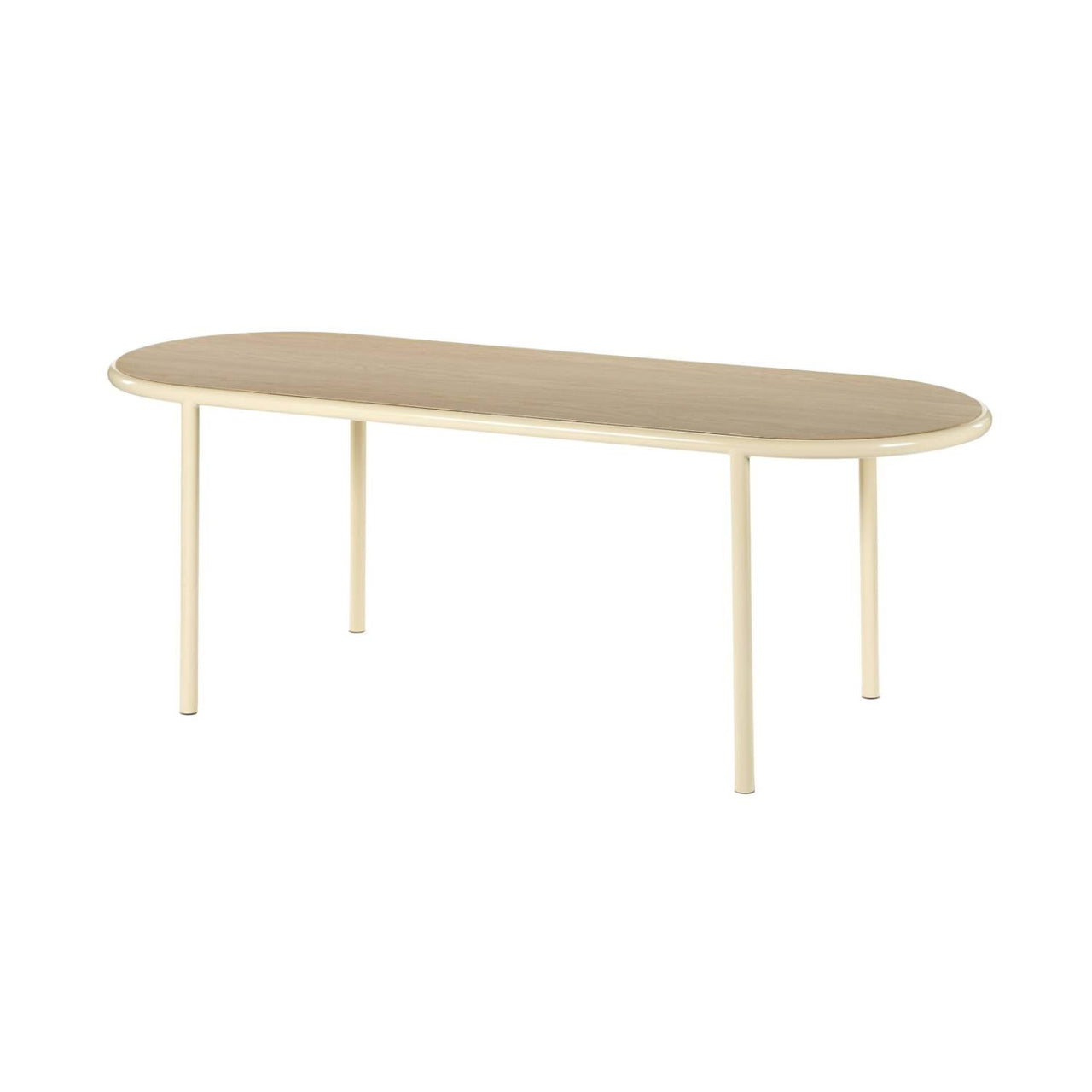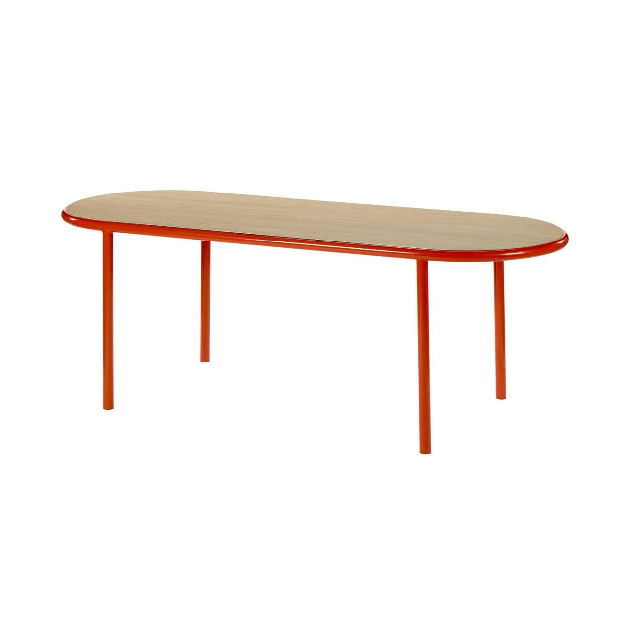 A roomy variation with rounded corners expands design duo Muller Van Severen's distinctive take on a wood table for Belgian label Valerie Objects. In a turnabout, the frame and legs consist of rounded steel tubing with a glossy powder-coat finish. An inset tabletop comes in a choice of 4 different timber varieties—light birch, classic oak, rich walnut and a darker cherry—creating either a subtle interplay or a defined contrast depending on the choice of metal colors and the warm wood.