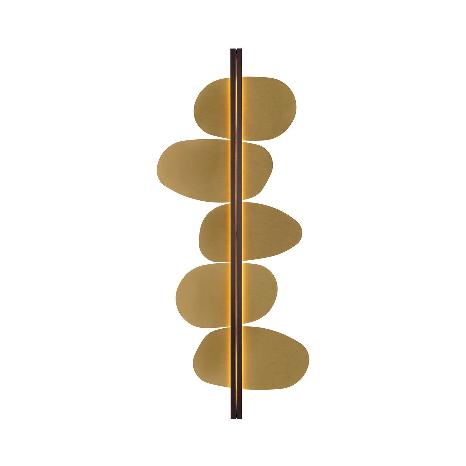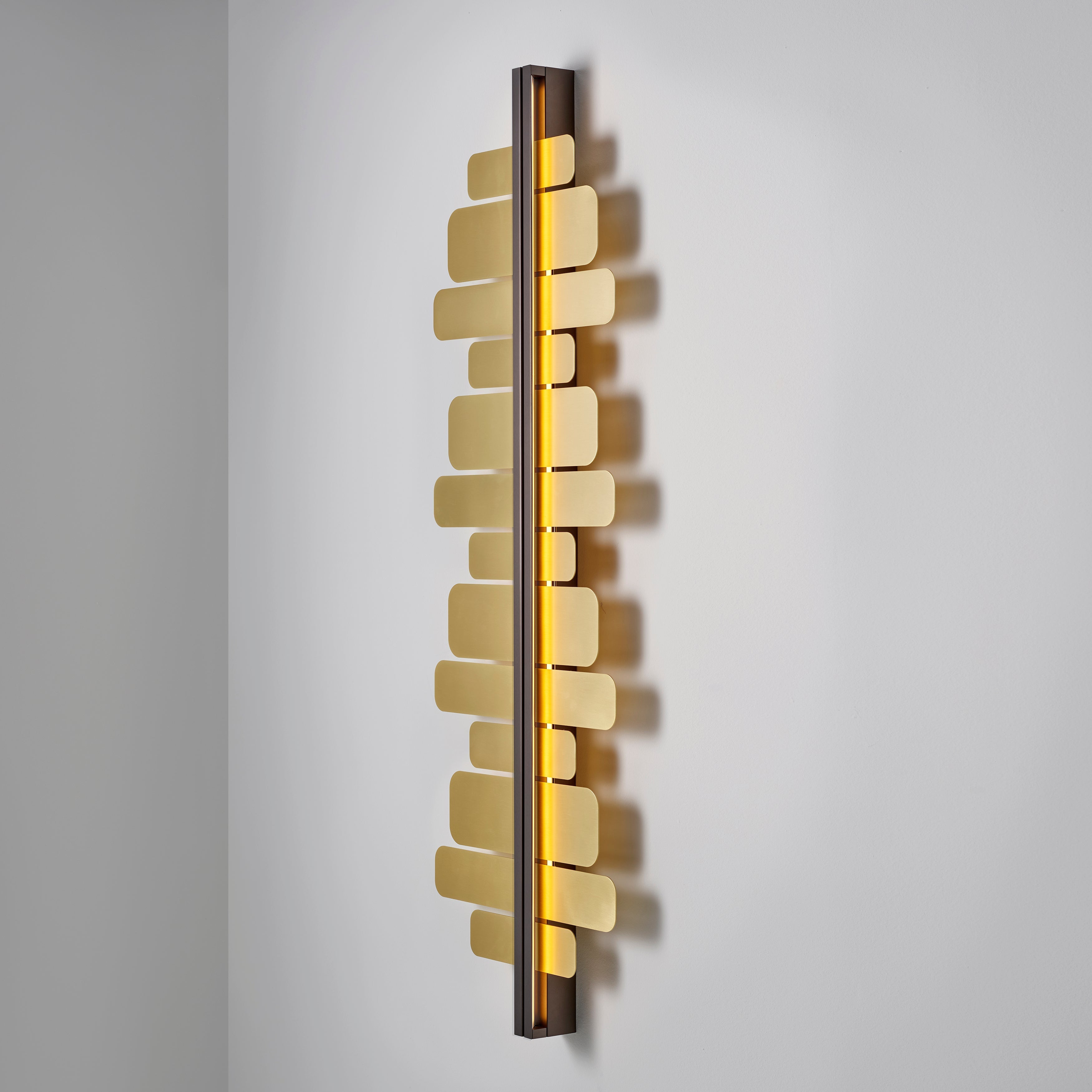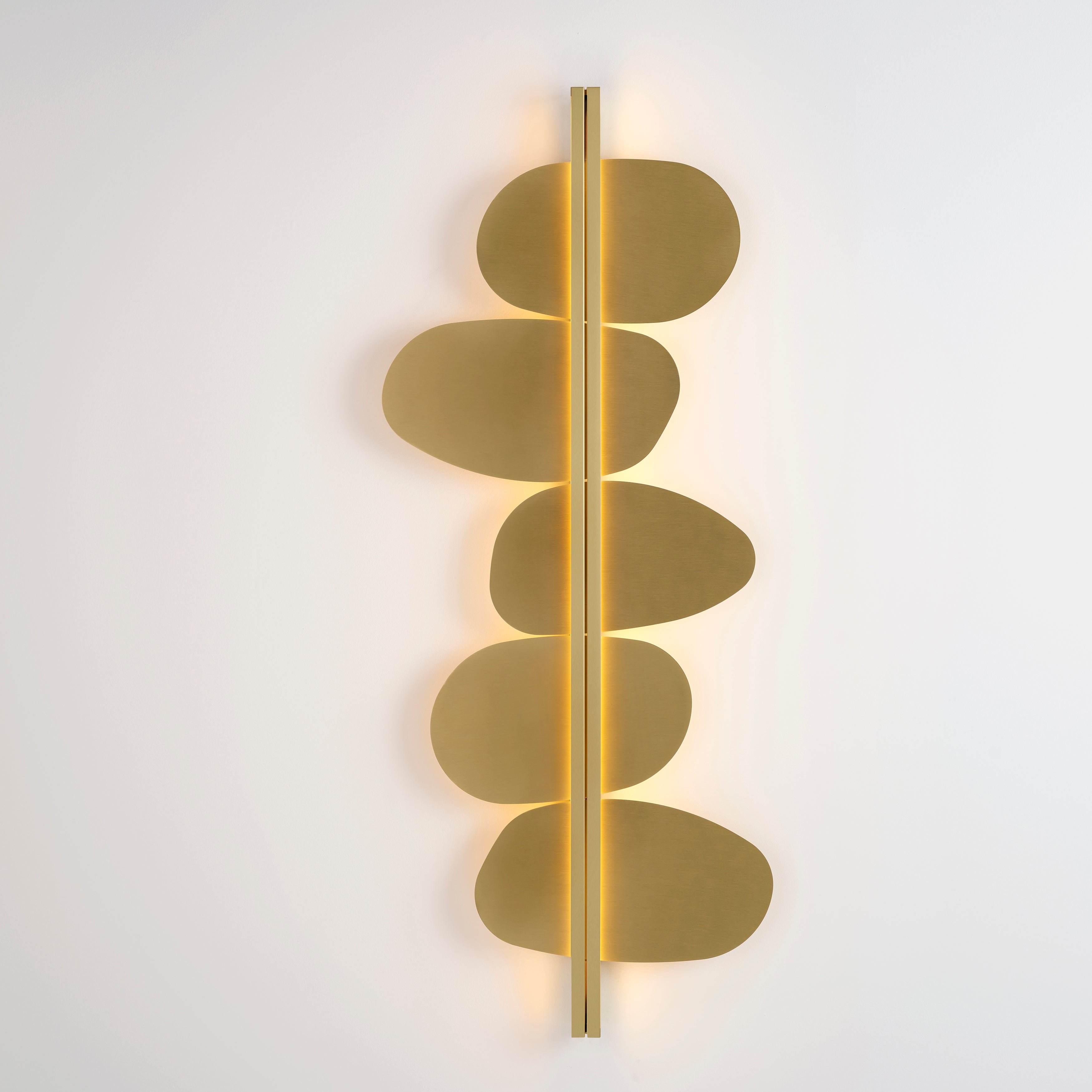 A fabulous focal point in any setting, Strate takes form as a grouping of abstracted shapes linked by a luminous line. CVL’s Émilie Cathelineau tips between wall light and authentic sculpture with multiple stylistic variations of the piece, each to be oriented either vertically or horizontally. Warmly diffused illumination from the integrated LED is reflected in the solid-brass structure handcrafted in France with varied satin finishes of brass, graphite, nickel and copper.