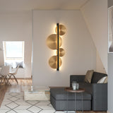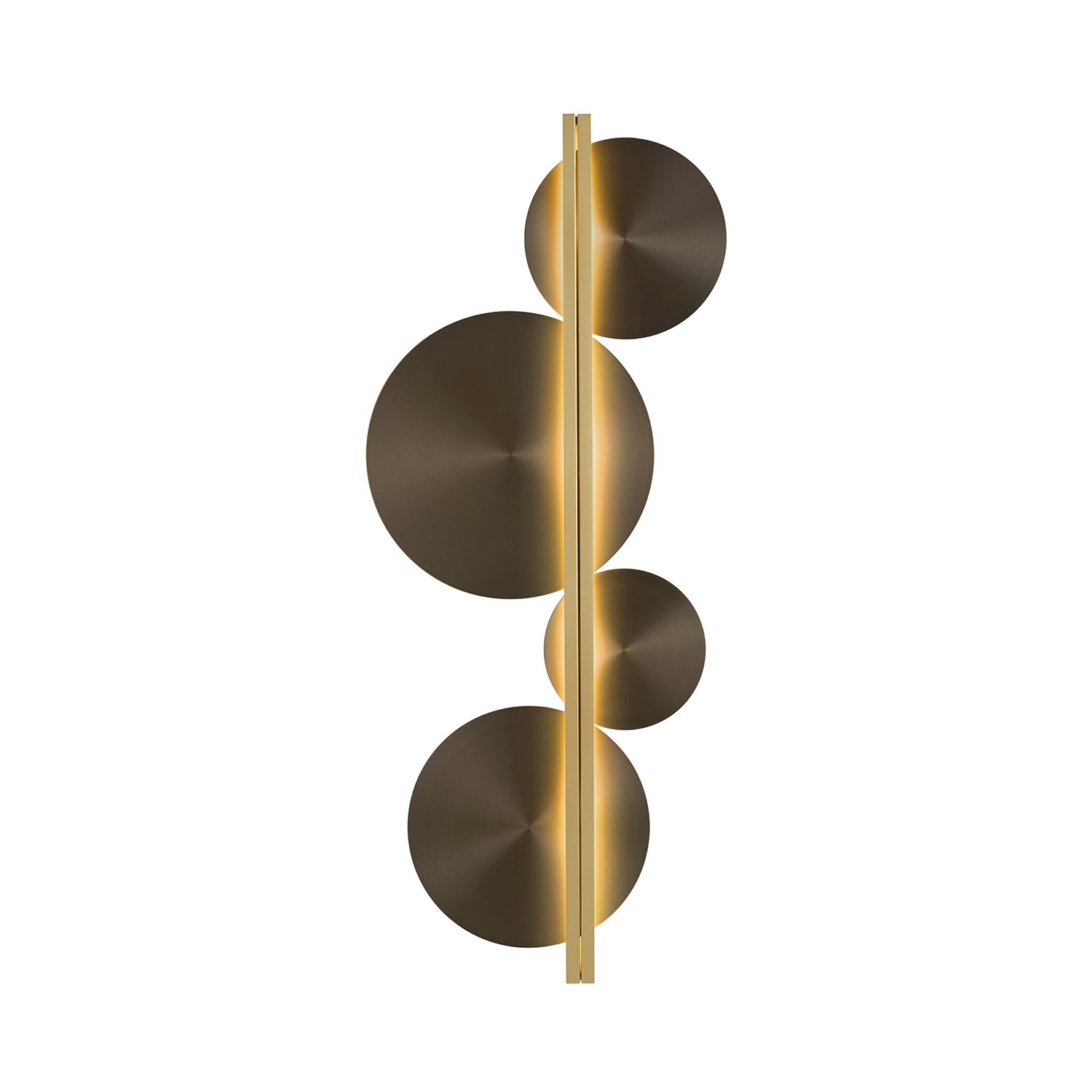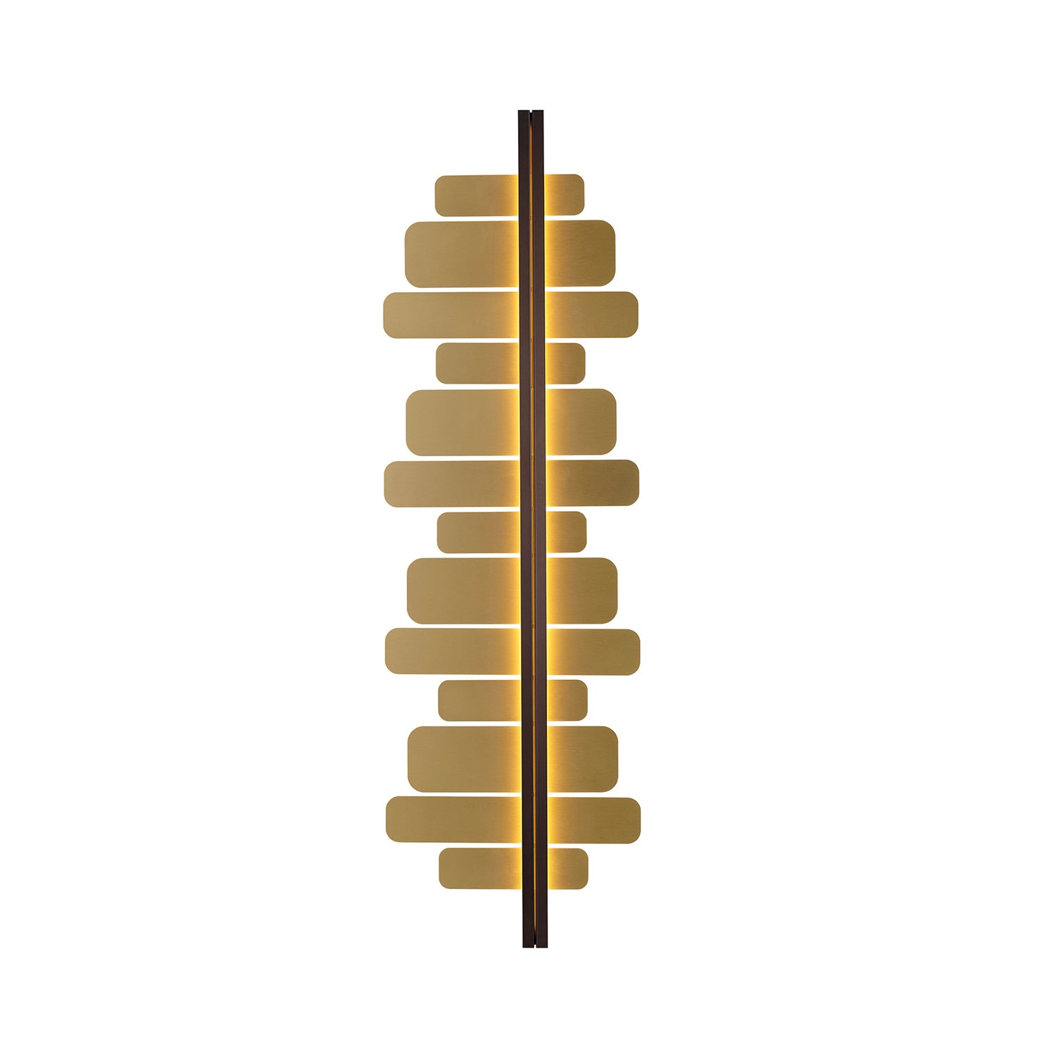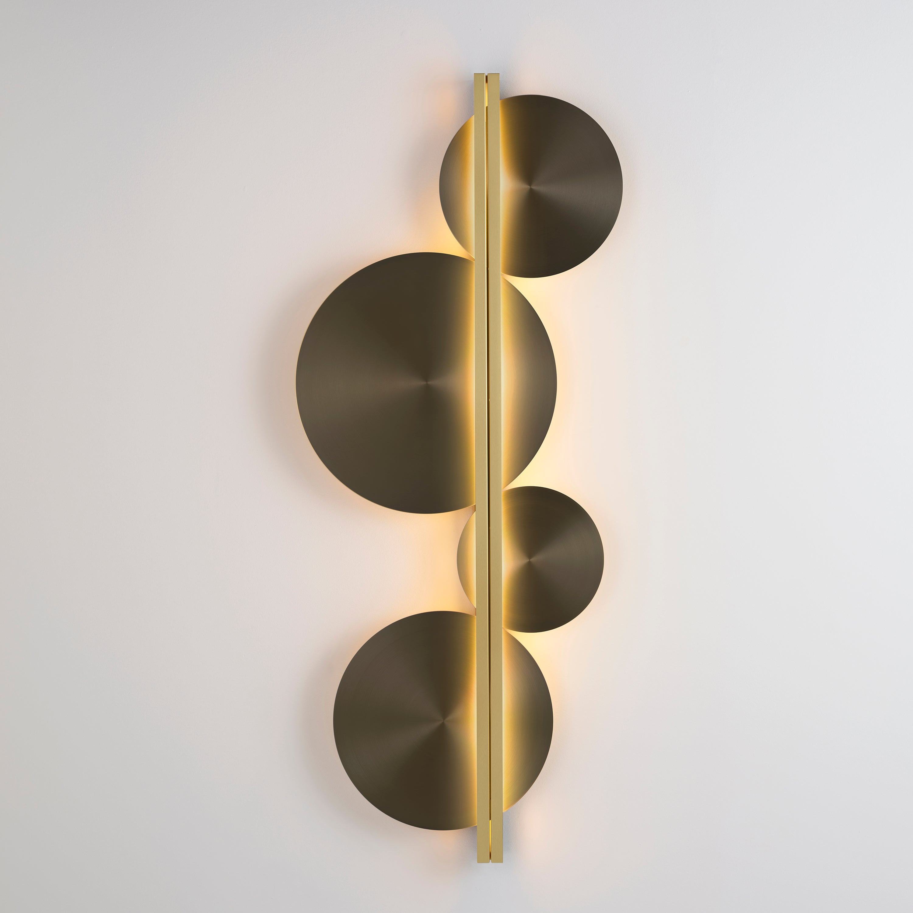 A fabulous focal point in any setting, Strate takes form as a grouping of abstracted shapes linked by a luminous line. CVL’s Émilie Cathelineau tips between wall light and authentic sculpture with multiple stylistic variations of the piece, each to be oriented either vertically or horizontally. Warmly diffused illumination from the integrated LED is reflected in the solid-brass structure handcrafted in France with varied satin finishes of brass, graphite, nickel and copper.