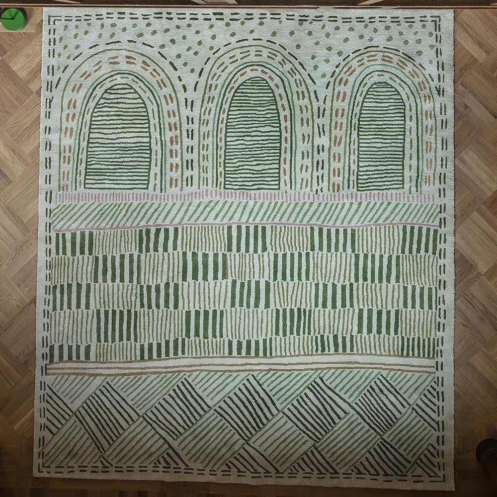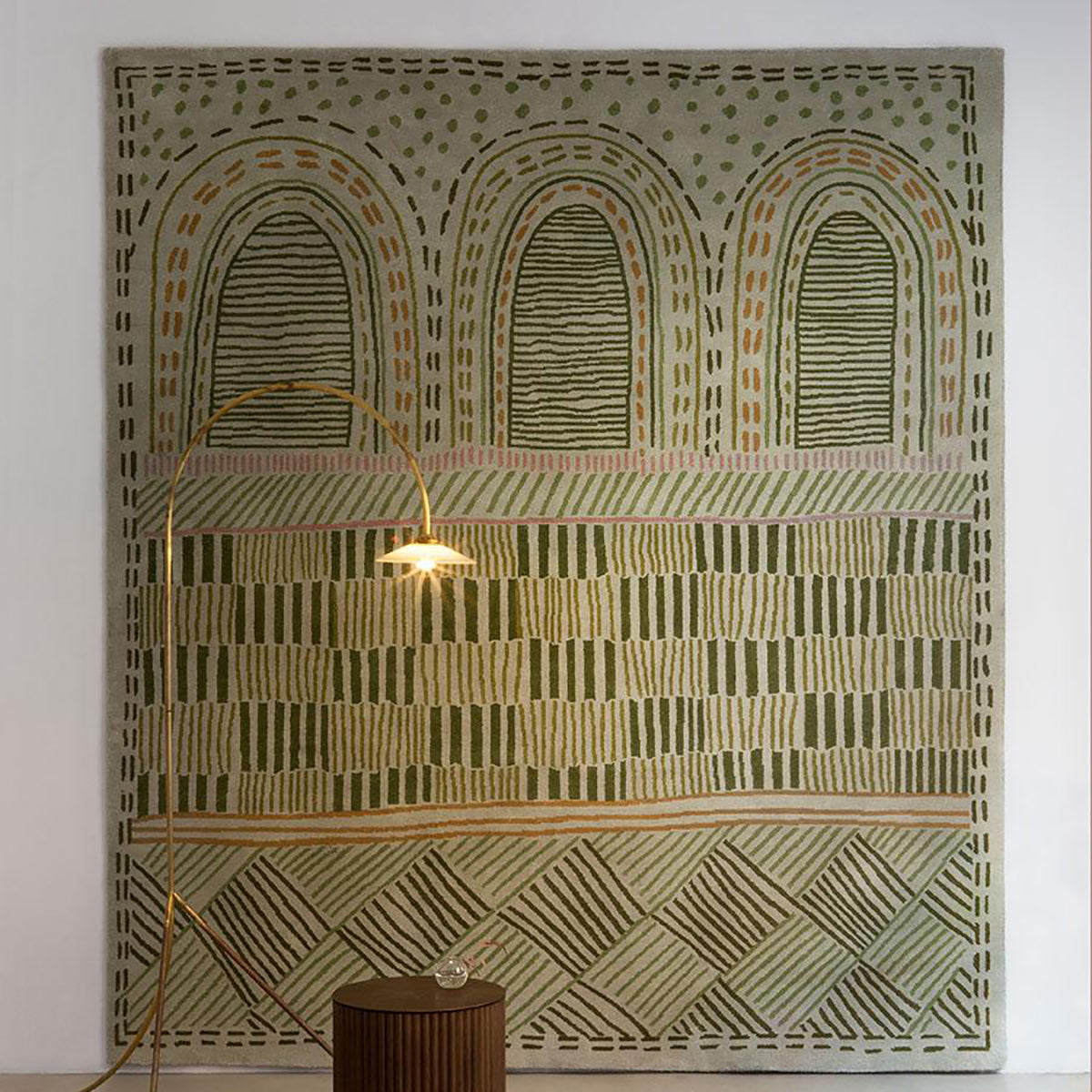With the look and typical green color of reading rooms, Biblioteket was suggested by Emma Olbers' redesign of the Old Library in Stockholm’s National Museum, down to the arched windows, rows of books and oak parquet. Hand-knotted in 50% wool and 50% Tencel from Asplund’s Tibetan Thin range, it features a shorter pile and more delicate cut to suit intricate patterning.