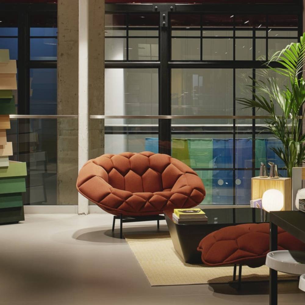 "Quilt is like a superhero, you can see its muscles exposed through the stretch fabric," says Erwan Bouroullec, who with brother and design partner Ronan conceived the generously proportioned seating. "You don’t need to hold your head up, you can rest and the sides are wide enough to support your arms," he adds. "Because the seat is one-and-a-half size, you can turn within it, you can use your computer, your kid can sit there with you." The honeycomb-like upholstery in bright, stretch fabrcs adds a pop of color that suits both residential and contract settings. Sitting on a powder-coated steel base, the oversize lounge chair has a glass-reinforced polyester core with individual foam inserts in the plumped-up covering.