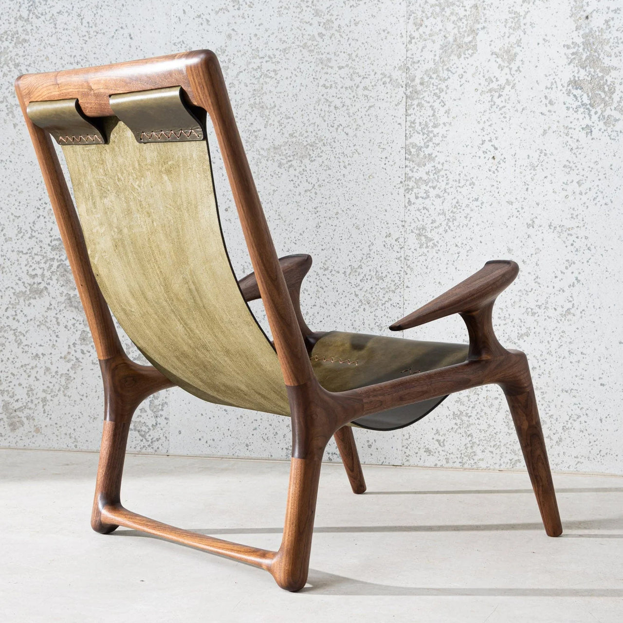 The Sling Chair by Fernweh Woodworking combines handcrafted quality with a design inspired by Danish and Scandinavian aesthetics. Its frame, meticulously hand-shaped, is available in high-quality Walnut, White Ash with a Danish Soap finish, or Charcoal Ash. The comfortable leather sling is available in black, brown, or olive, each hand-stitched to ensure durability and comfort. This award-winning chair was the inaugural piece from Fernweh Woodworking, designed by founder Justin who drew inspiration from renowned designers like Sam Maloof.