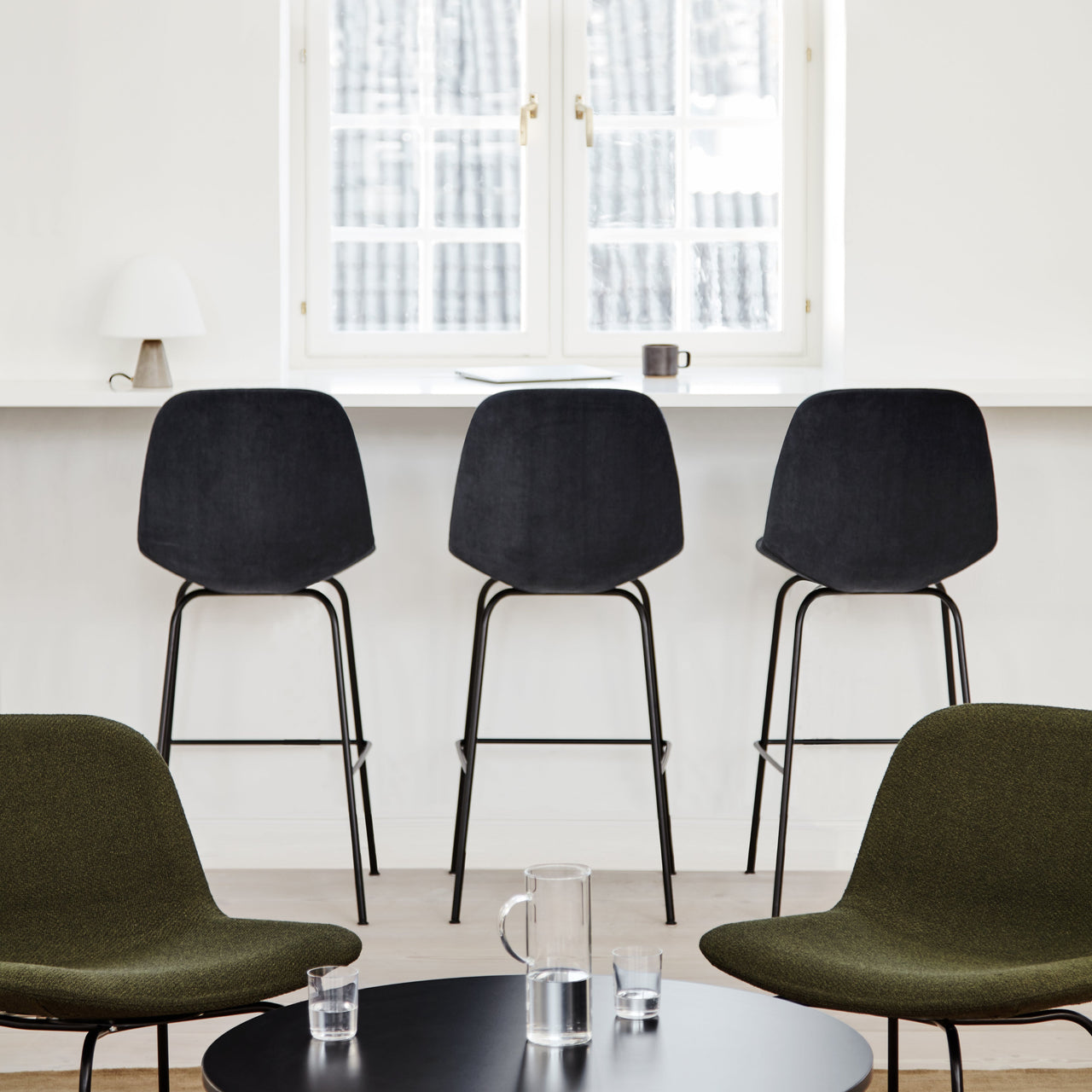 With its sculpted shell and slender steel base, the Eyes 4-Leg Barstool offers ergonomic support and a refined silhouette. The seat is constructed from moulded cold-cured foam reinforced with steel, fully upholstered in fabric or leather. Suitable for both bar and counter settings, it balances comfort and versatility.