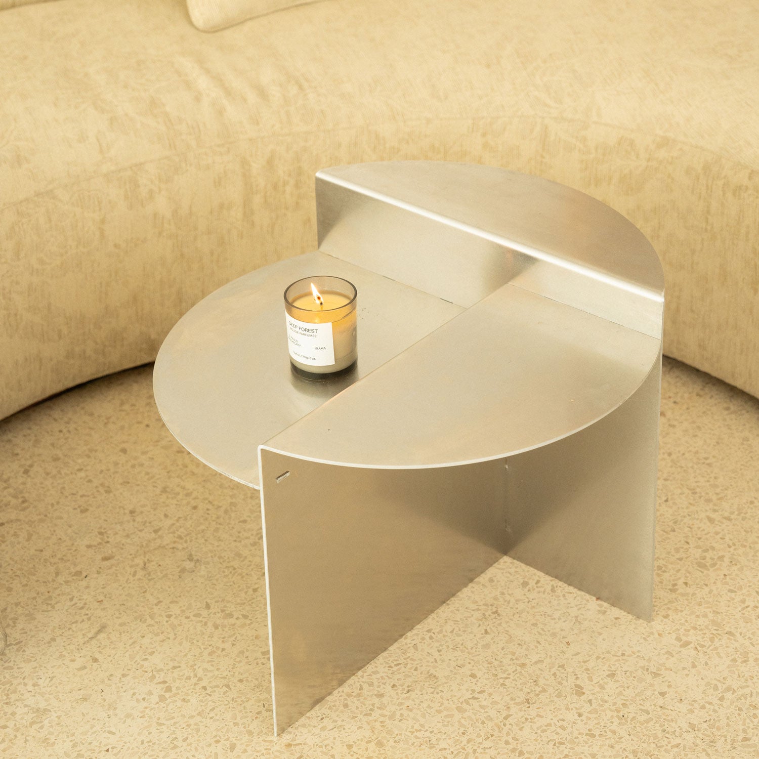 Level up with Frama's aluminum side table that features a circular top comprising 3 stepped heights. Jonas Trampedach's design has an honest industrial character, fashioned with laser-cut, raw aluminum sheets joined together by hand in a small workshop with a hammer tool in a process known as riveting. A standout display surface or versatile side table, each piece is unique given the unfinished nature of the metal surface with its natural abrasions and irregularities.