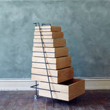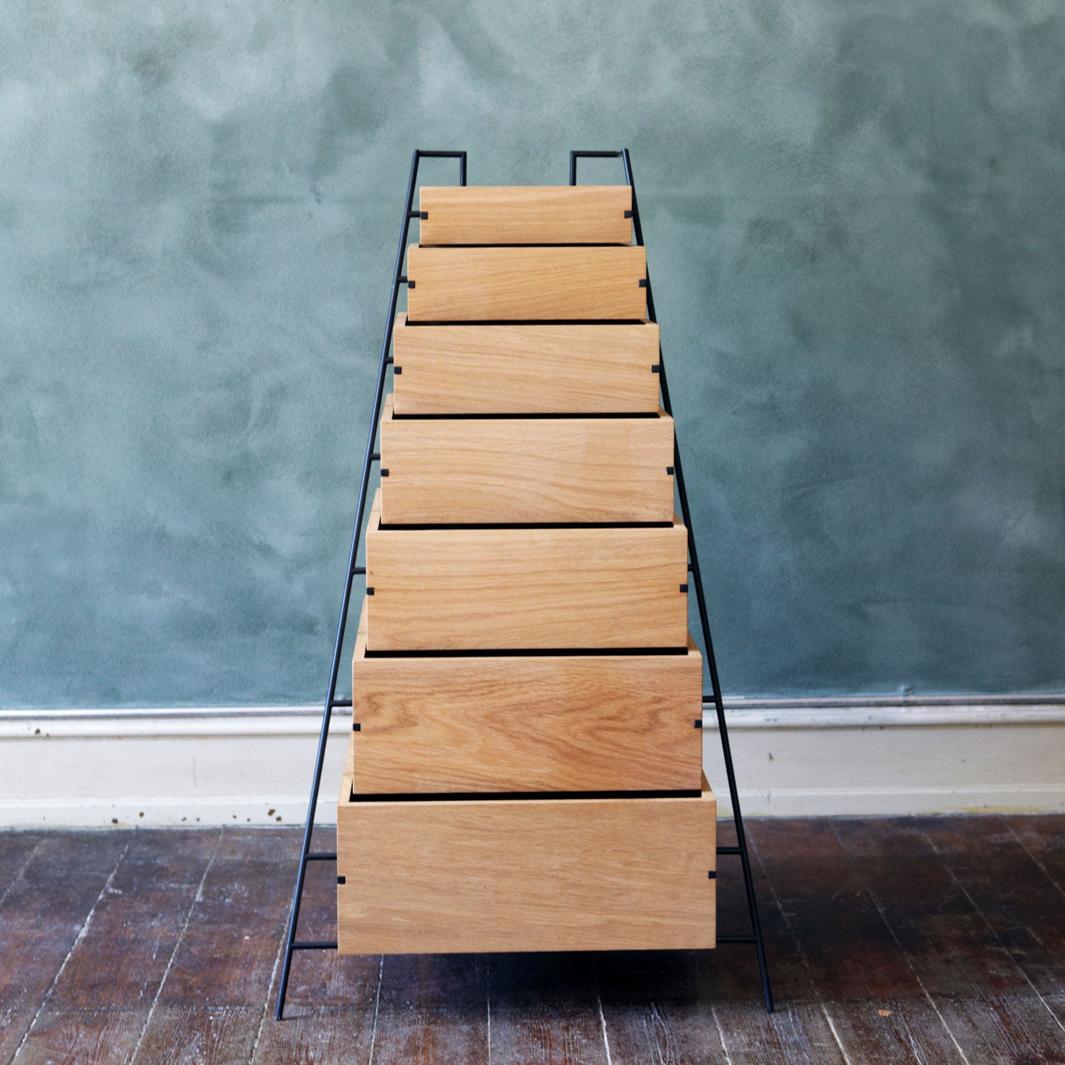Taking its name from the Japanese word Sutoa—“to contain”—Frama’s statement storage also celebrates exacting craftsmanship. Defined by a minimal steel frame and stackable wood drawers of descending sizes, Tokyo designer Keiji Ashizawa combines a meditative structure with welcome functionality, providing 7 boxes for storage and organizing. Easily movable with its handles and wheels, Frama’s versatile piece is fashioned in solid oak or walnut.