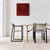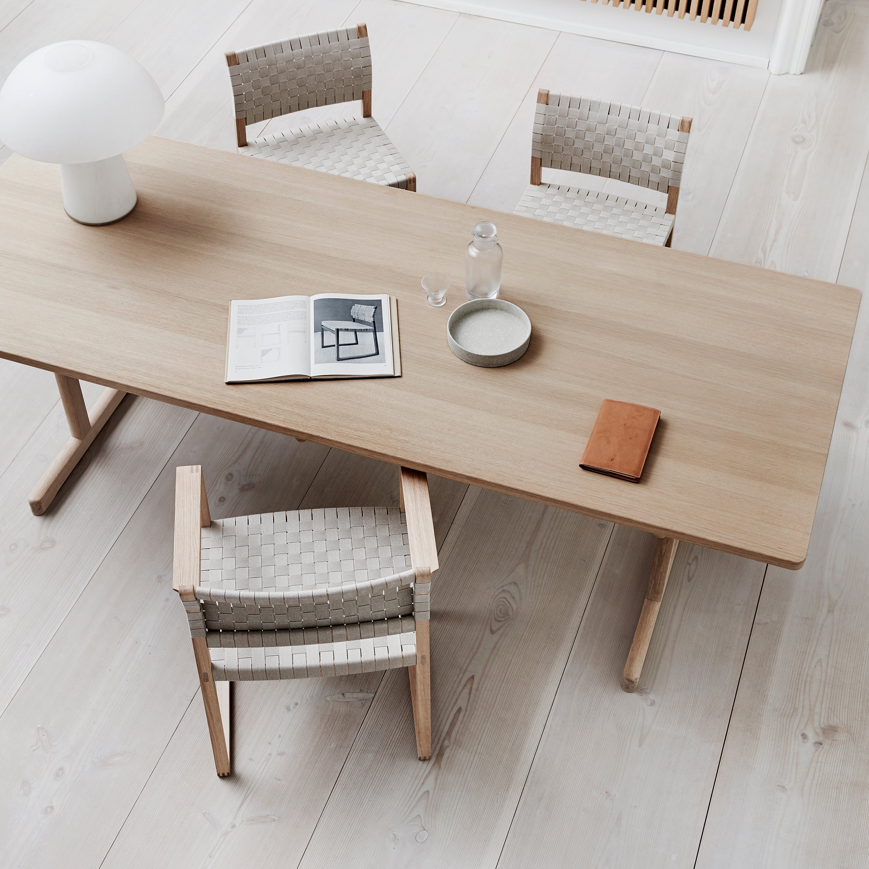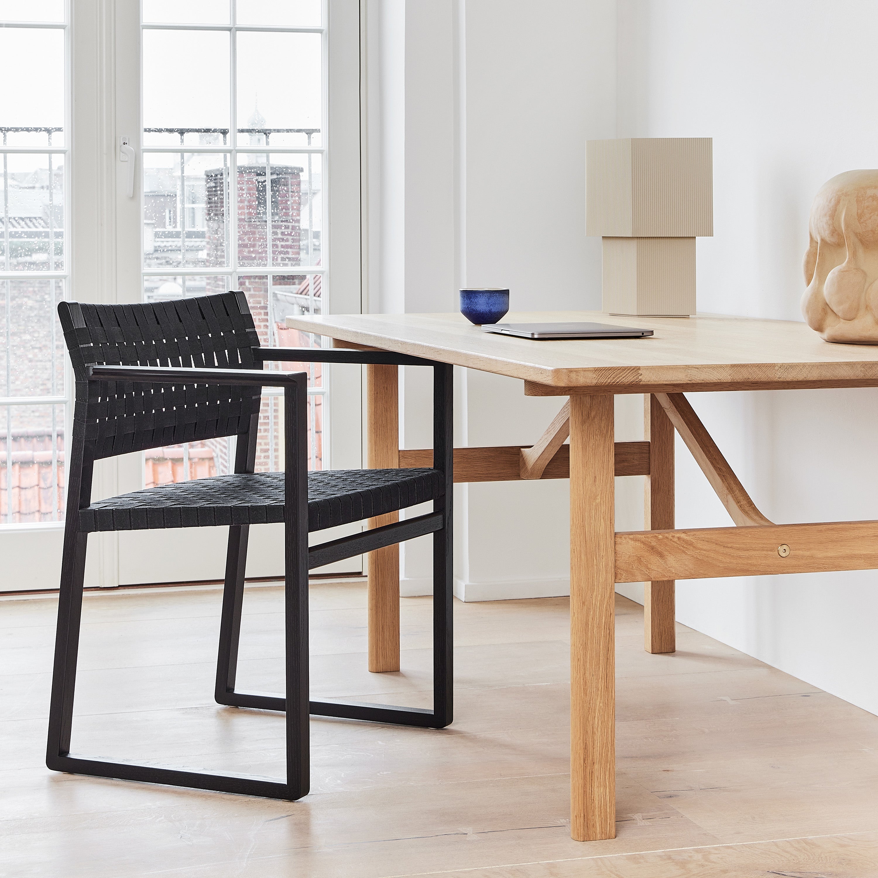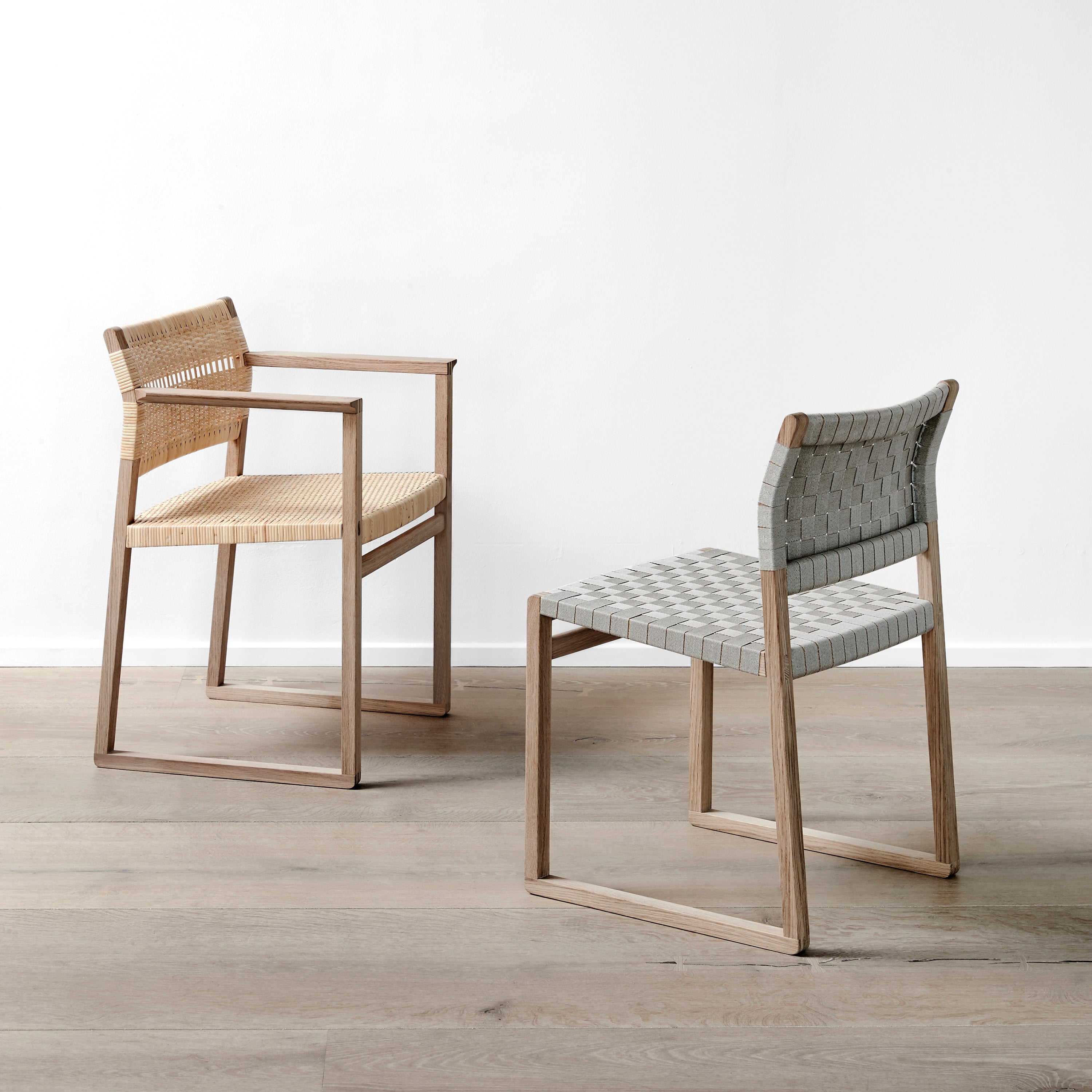 Linen webbing for the seat and back teamed with a solid-oak frame signal a clean-lined elegance in Børge Mogensen's slim and sturdy 1958 dining chair, available as the armless BM61 or armchair BM62. With the structure in solid oiled or lacquered oak and webbing in either natural or black, the seat comfortably angles precisely where optimal support for the back is needed while the lower section supports the small of the back. Finely crafted elements include exposed finger joints and runner legs that make it particularly suitable for use on carpets or with included gliders on floors.