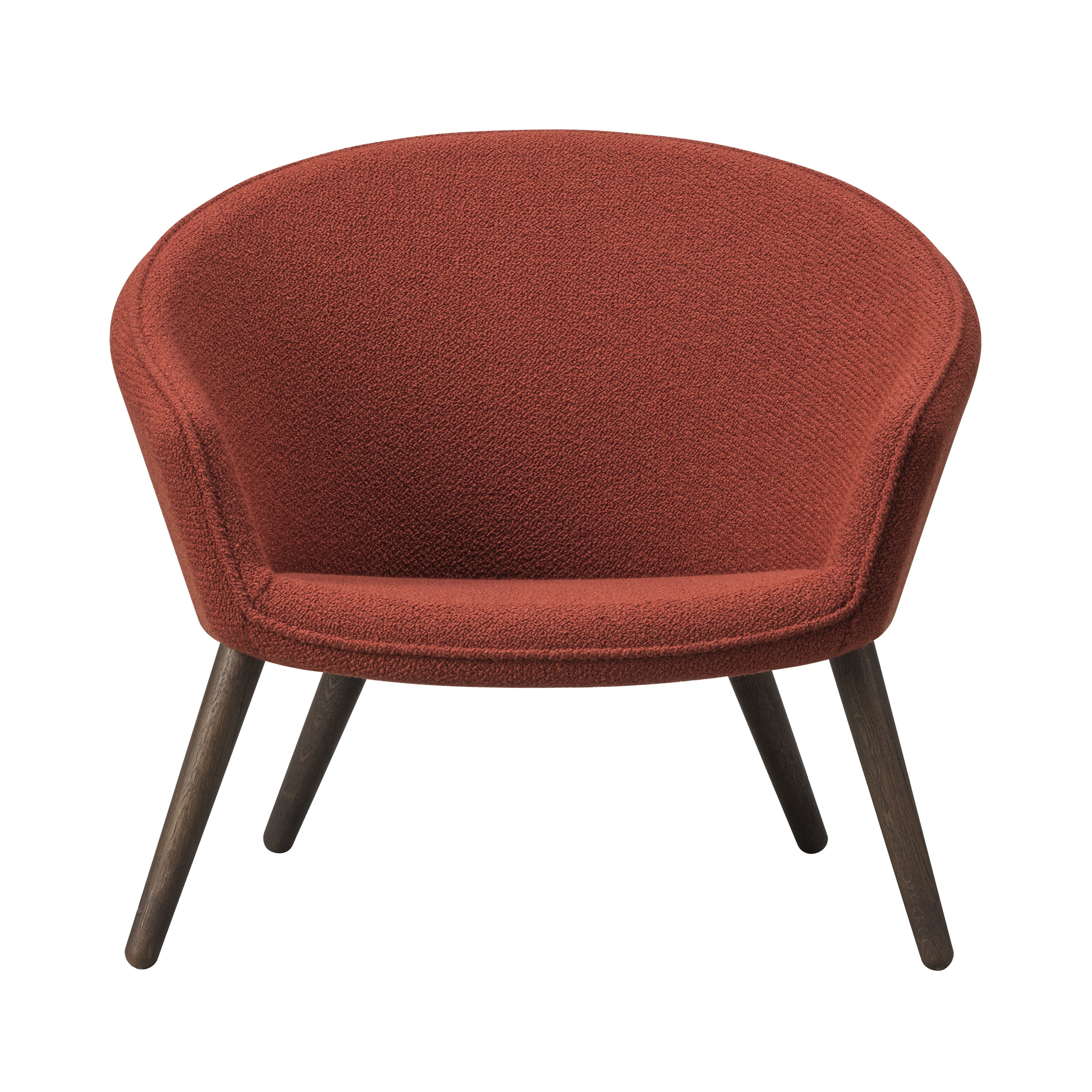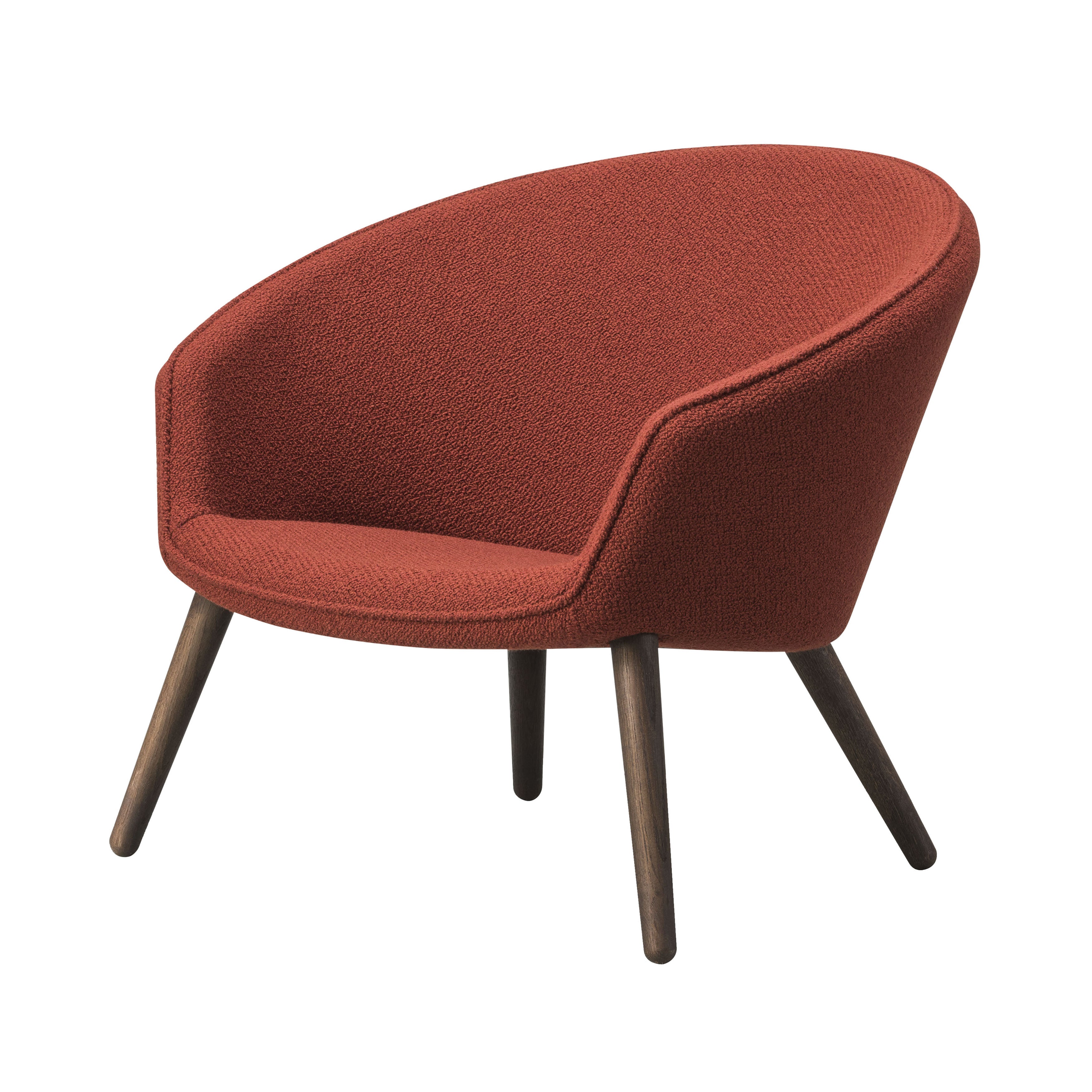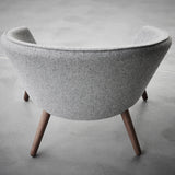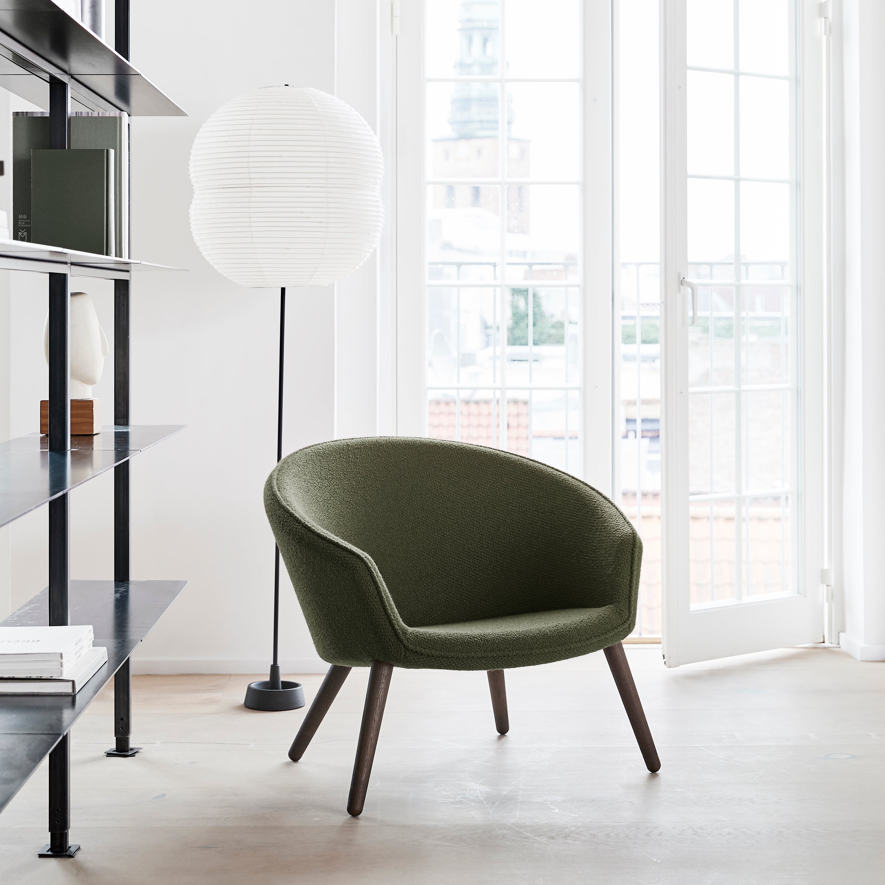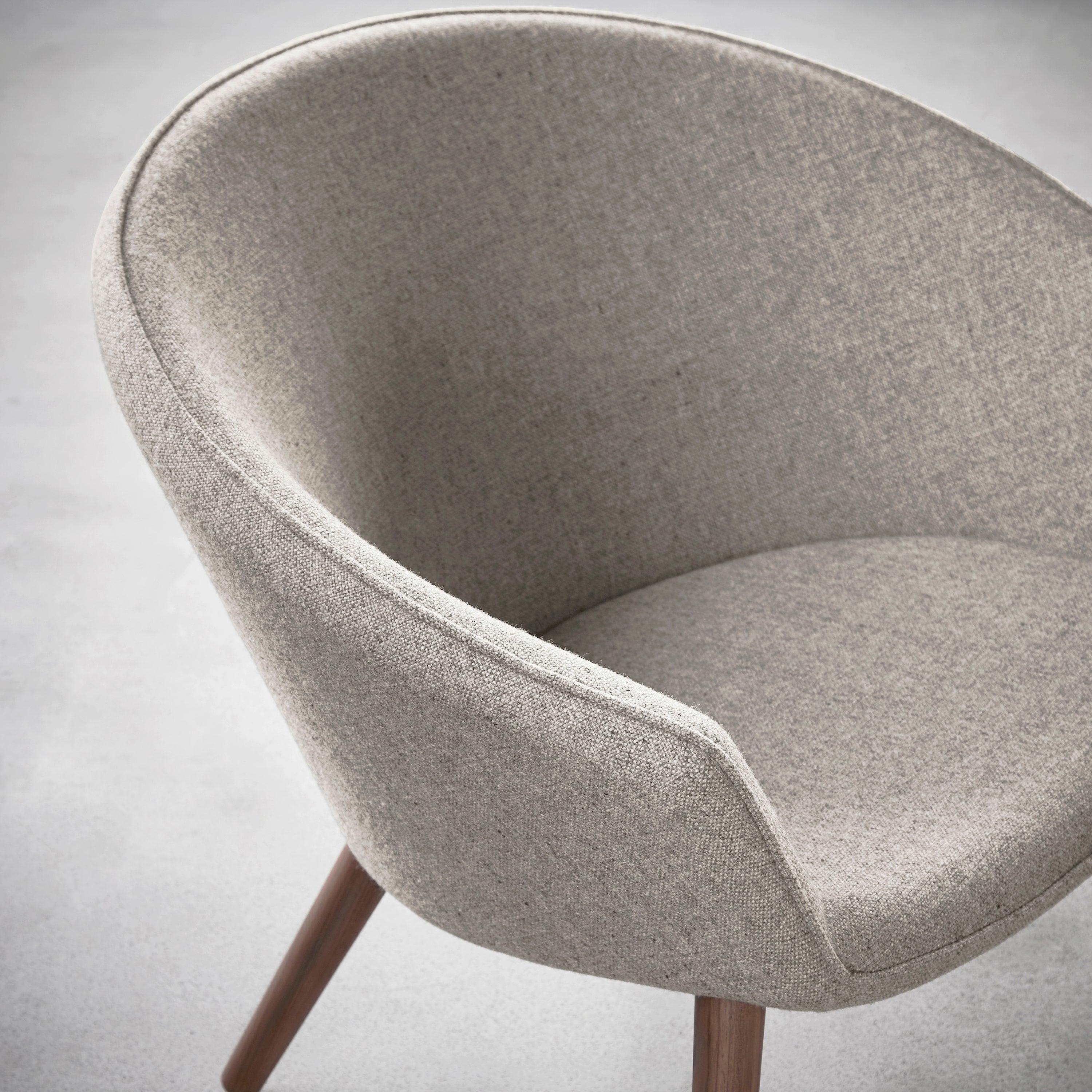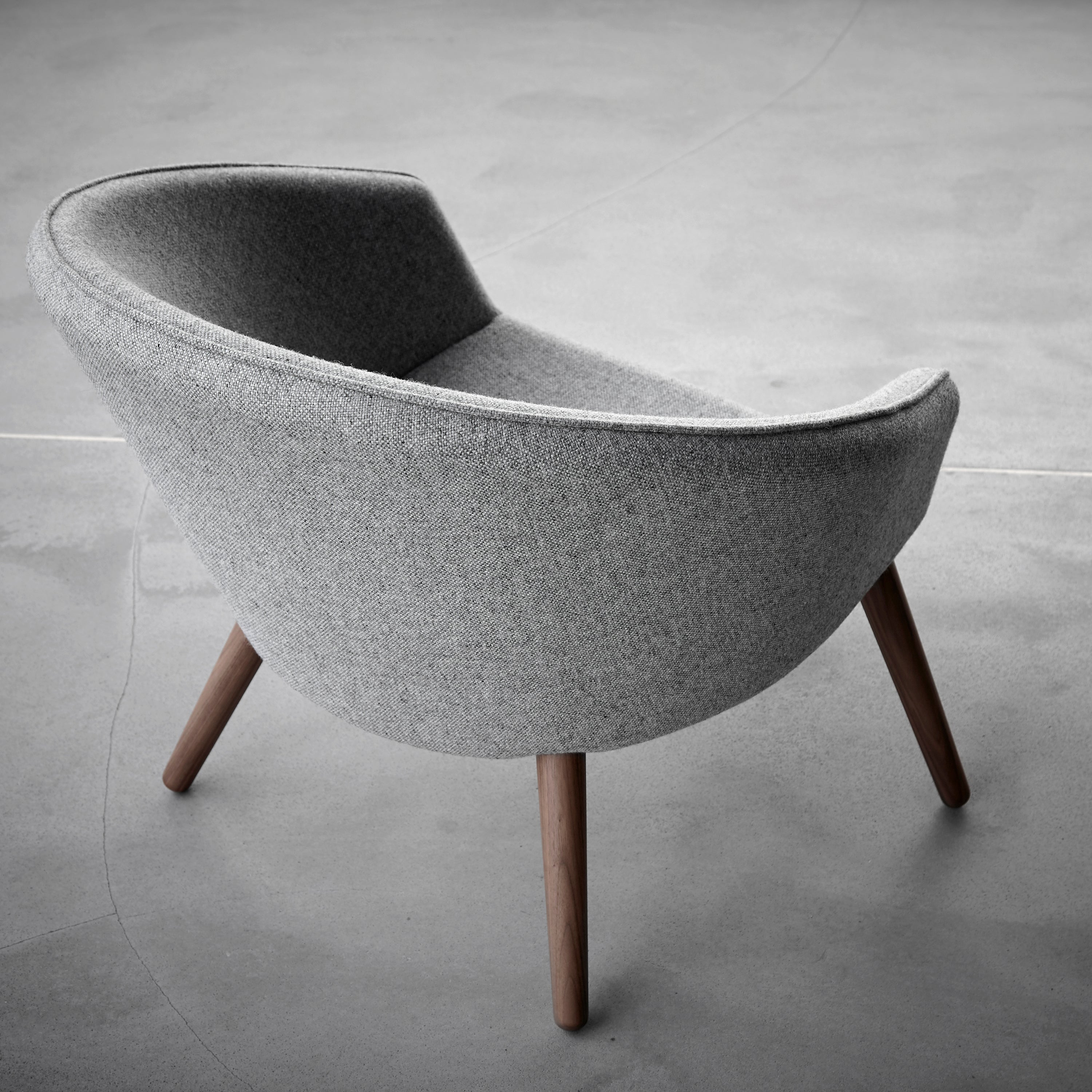 Designed by Nanna Ditzel and Jørgen Ditzel in 1953, this modern take on the traditional easy chair is amply proportioned for comfort with the slightly curved back extending to its armrests. A looker from any angle, the seating features a sculptural, organic silhouette balanced by splayed wooden legs as a playful touch. The high-pressured PUR-foam shell is enforced with a steel frame and upholstered in a choice of exclusive fabrics and the chair has achieved Greenguard Gold Certification.