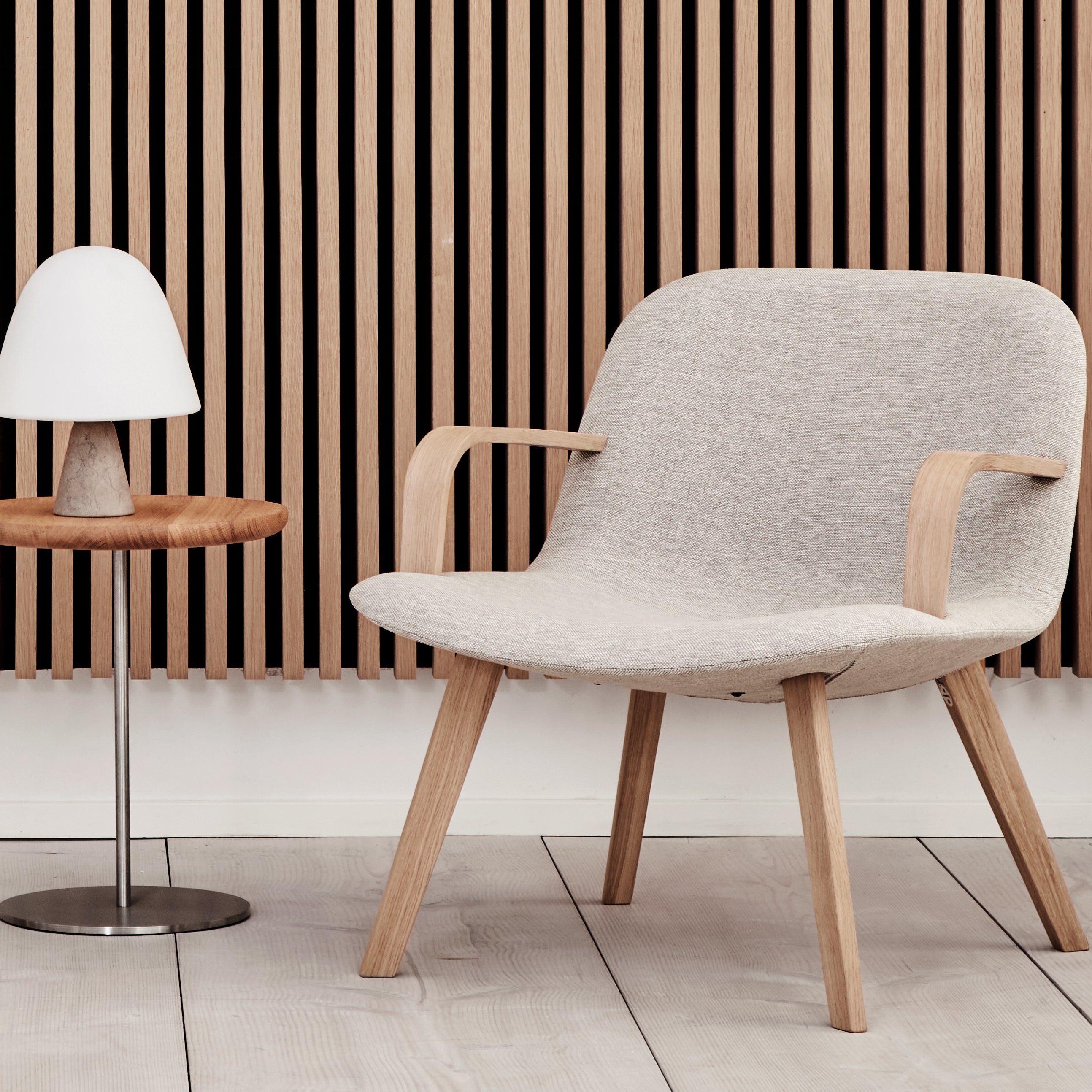 The Eyes Lounge Armchair features a curved seat and gently angled backrest that provide a comfortable and supportive sit. Its shell is made from cold-cured foam with a hidden steel frame, fully upholstered for a smooth, seamless look. The chair is supported by a solid wood base with armrests offered in different finishes to complement the overall design.