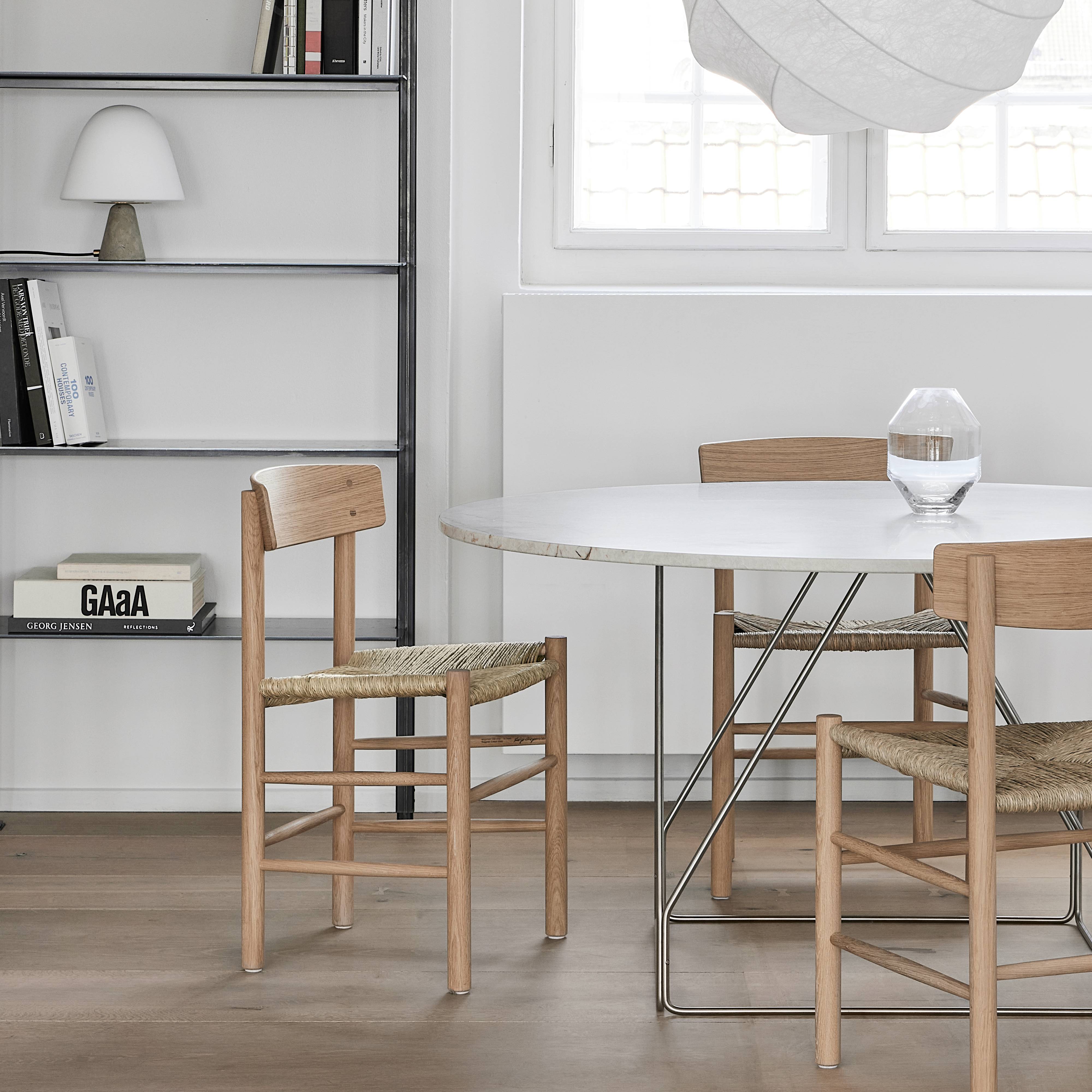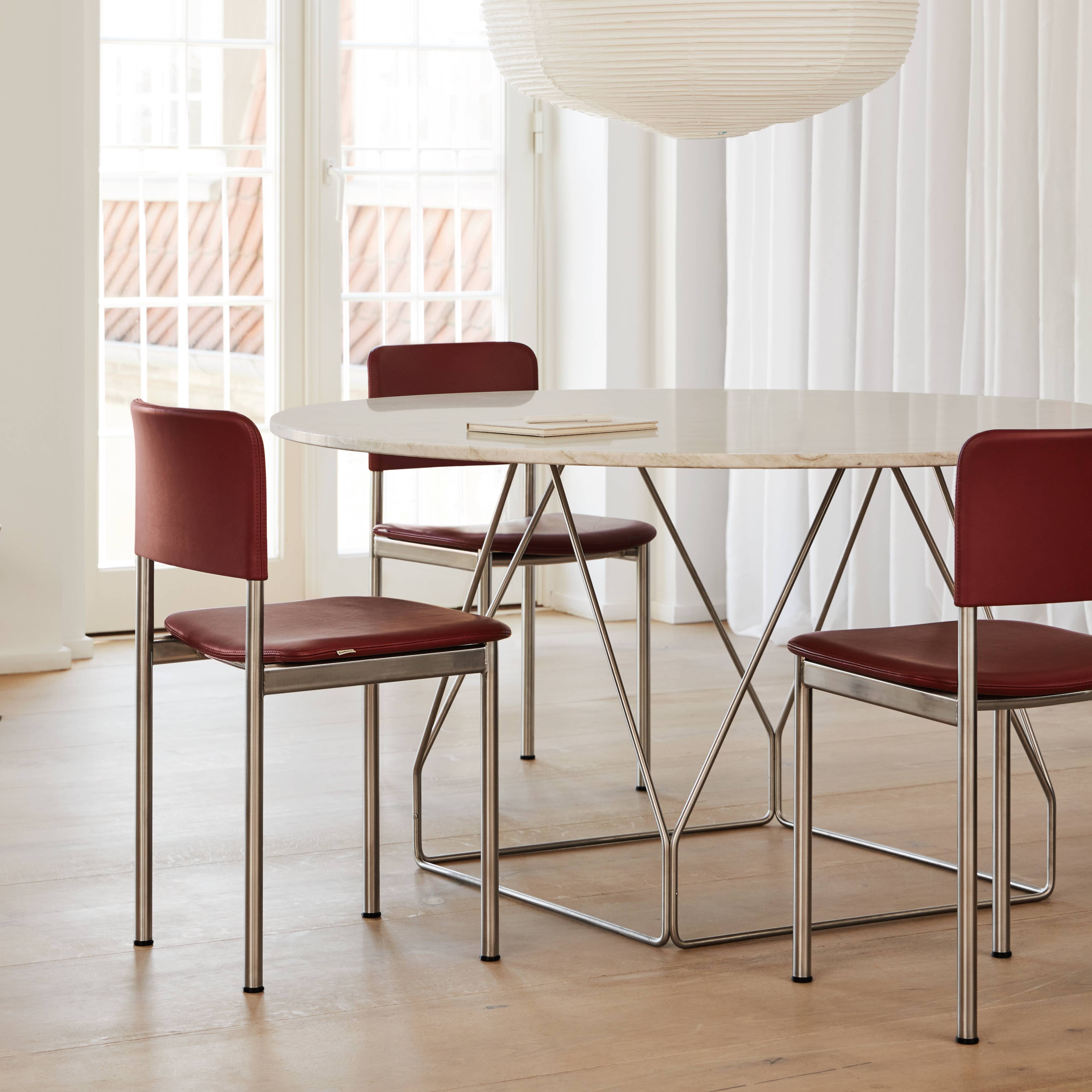 Jørgen Gammelgaard’s enduring 1984 design reflects his desire to create a simple, elegant piece with a supportive structure that would not limit the seating around the table. Providing remarkable stability as well as an intriguing graphic aesthetic, JG Table features a base in stainless steel or powder-coated finish with the choice of a round or square tabletop in varieties of solid stone or in a durable matte linoleum.