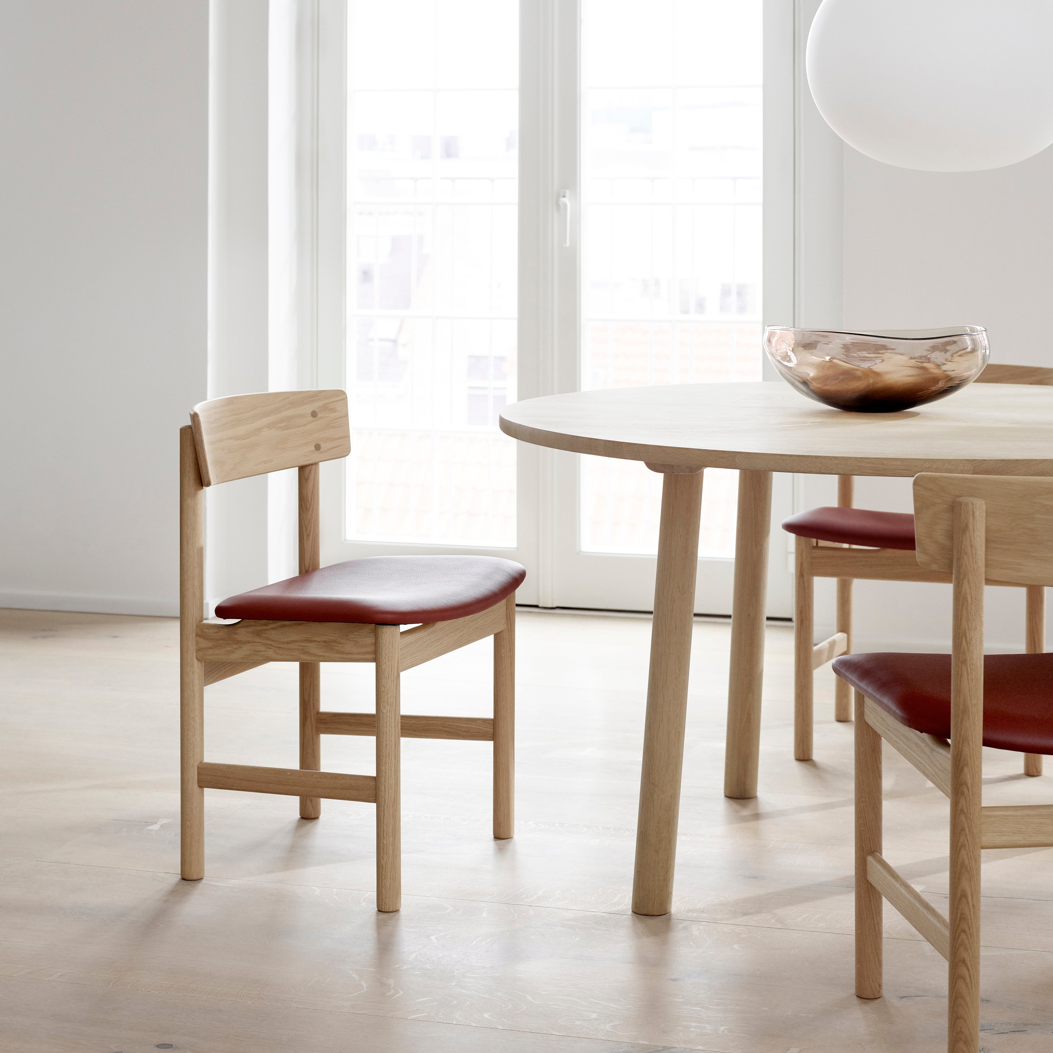 Heading up design at Fredericia in the 1950s, Børge Mogensen debuted 3236 Chair with his preferred simplified lines and working with refined yet rustic natural materials. Perfectly proportioned in solid oak with with a stable, sturdy mien, it allows for hours of comfortably sitting with its upholstered seat characterised by a simple curve. A modern classic, this modest but self-confident side chair comes in a range of appealing wood treatments and premium upholstery selections.