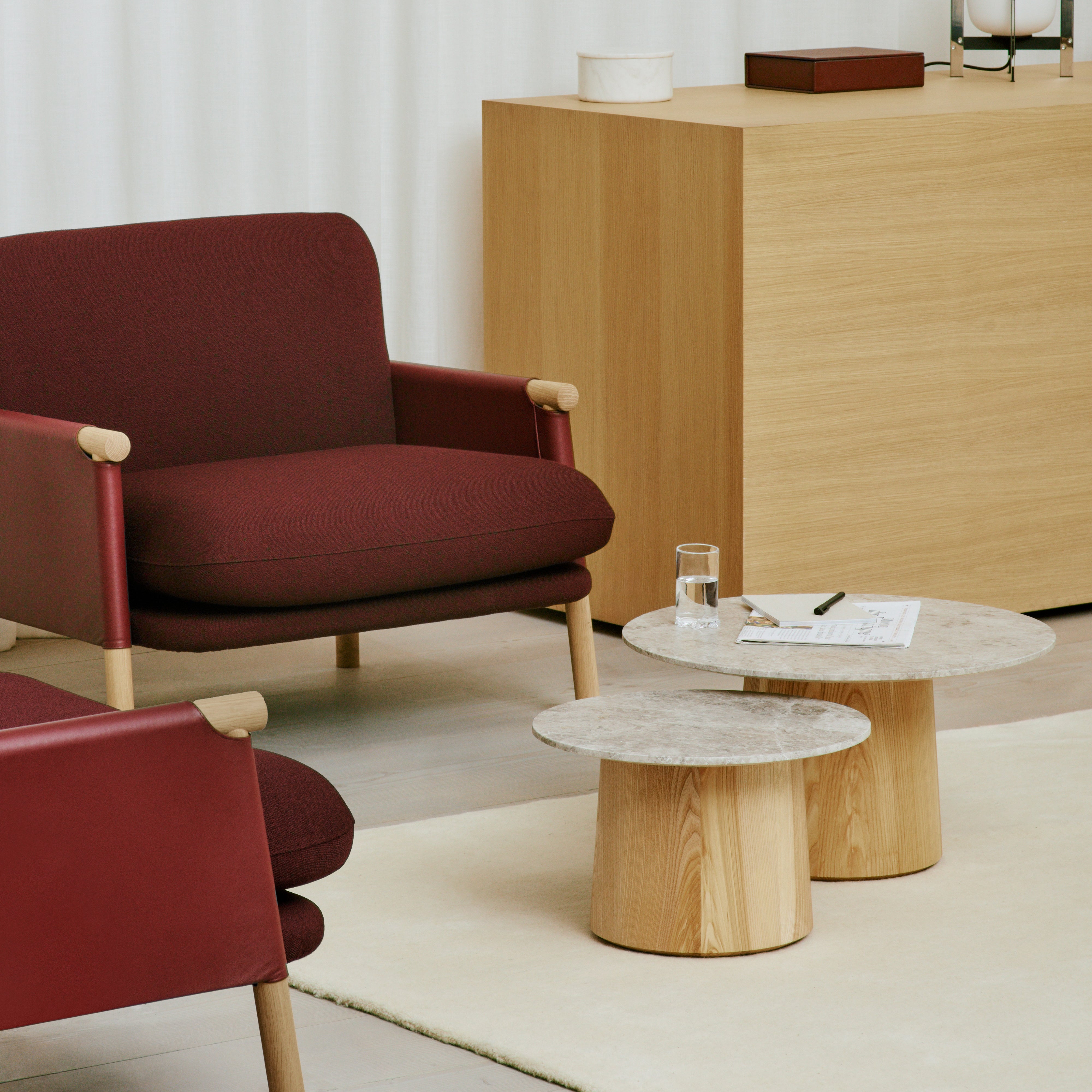 The Niveau Coffee Table pairs a smooth marble top with a lightweight, open ash wood base, creating a sense of balance between solidity and lightness. The table’s circular surface is set in contrast with the warmth of wood, emphasizing the tactile qualities of each material. With a variety of sizes and heights, the pieces can stand alone or be grouped to create layered arrangements.