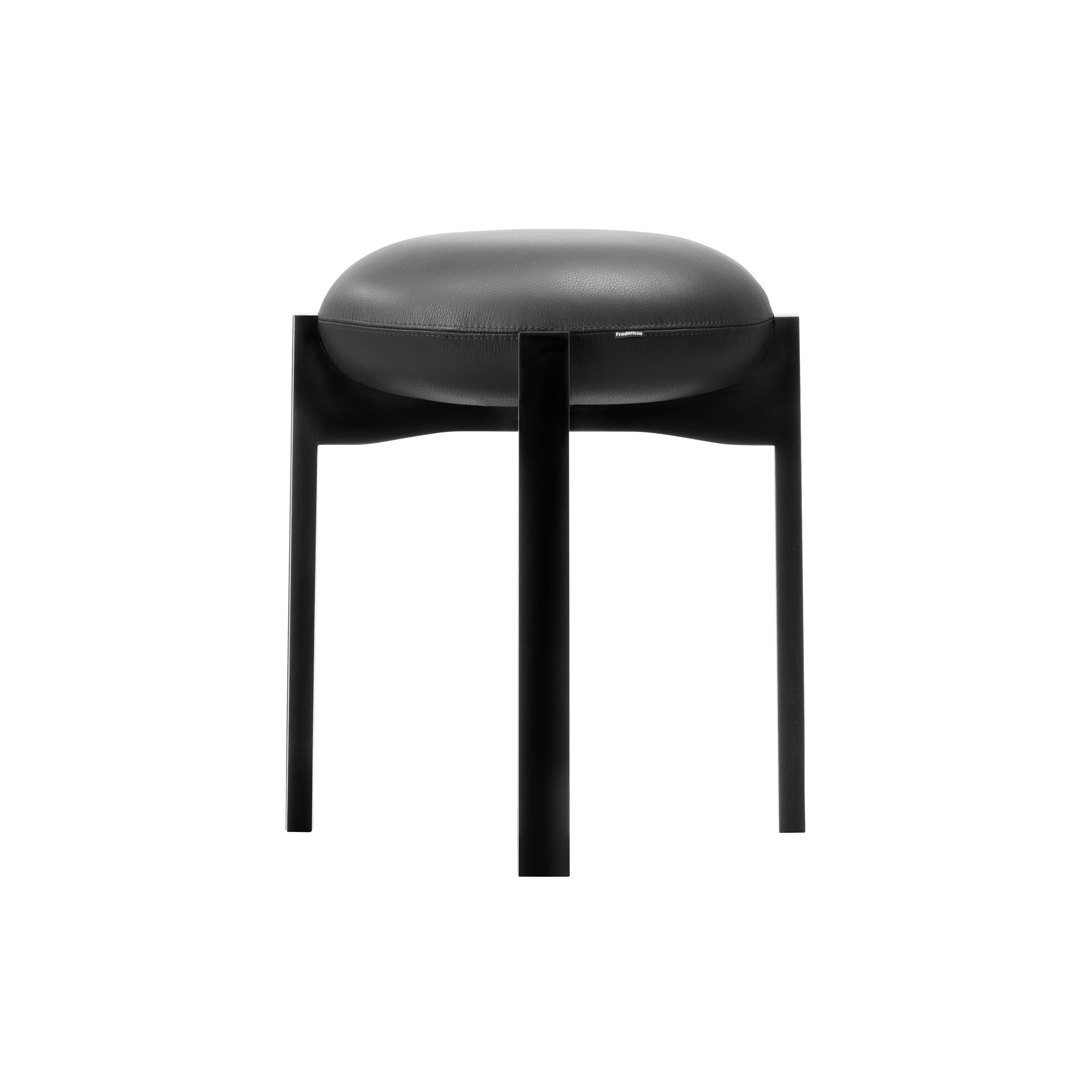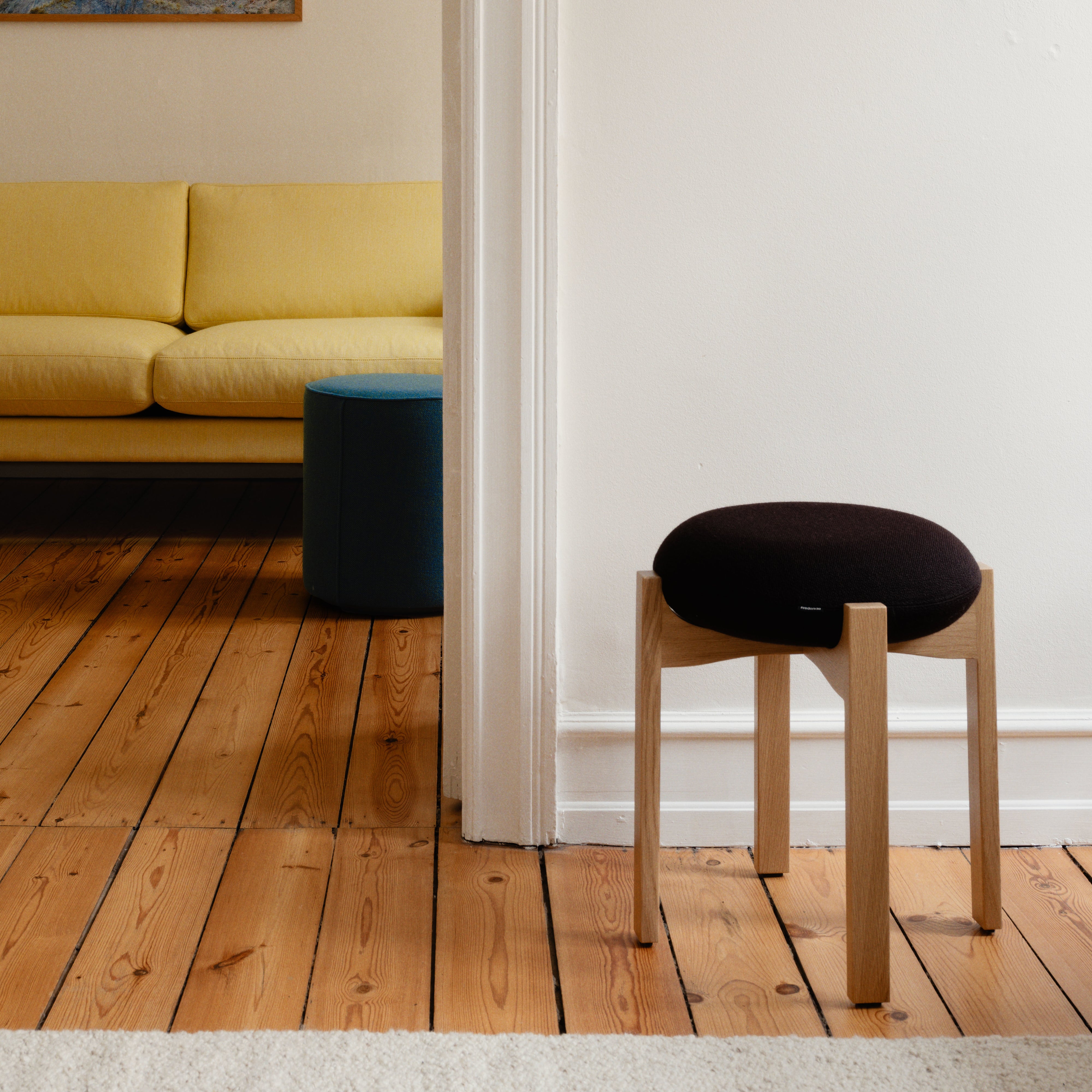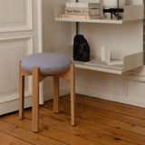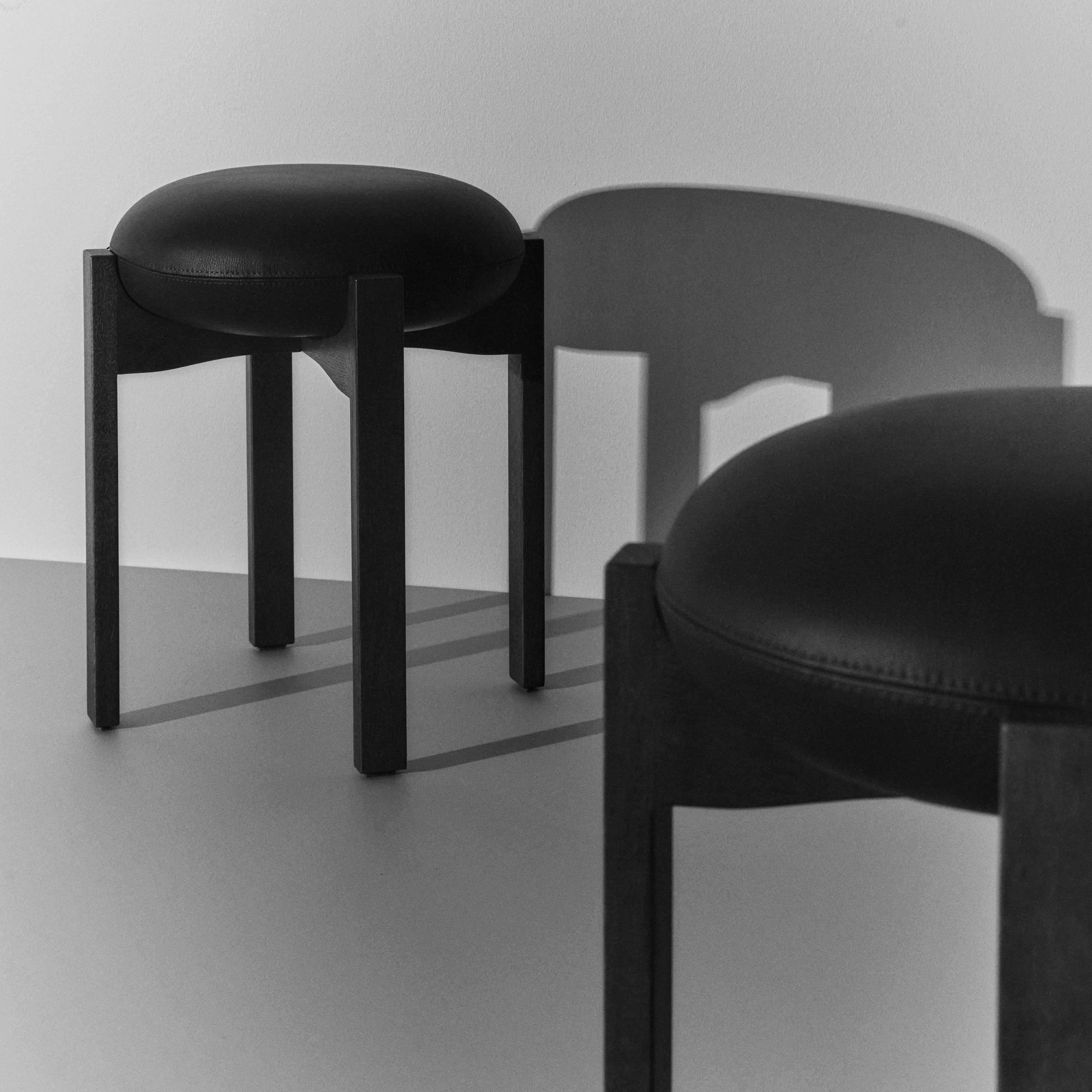 The Pioneer Stool combines a soft, round seat with a sensual wooden frame. Designed by Maria Bruun, a Danish designer known for her sculptural minimalism, the stool's four vertical legs unite in a cross composition with elegant indentations, supporting the upholstered seat cushion. Available in various finishes and upholstery options.