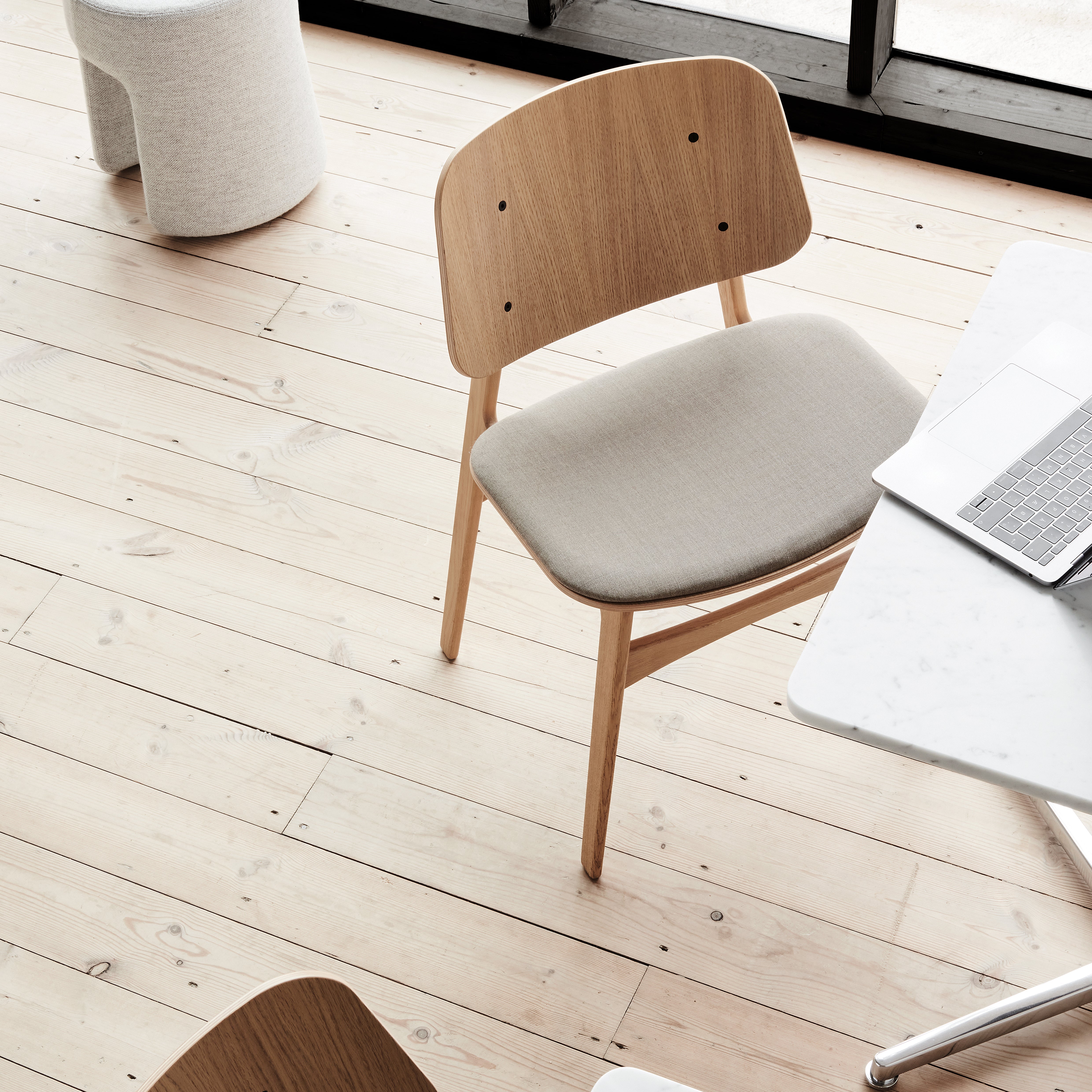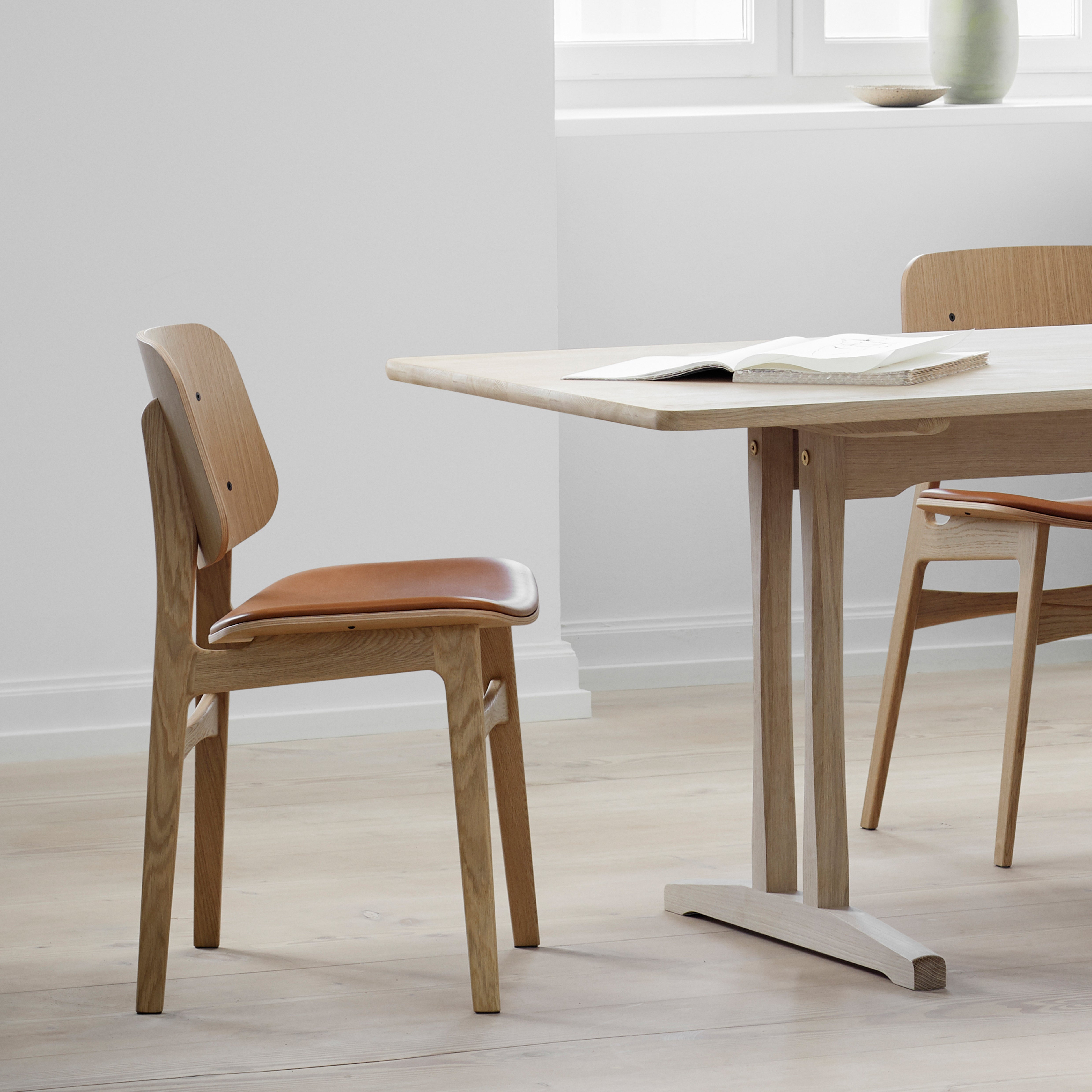 Søborg’s generous proportions gain added comfort with an upholstered seat to complement Børge Mogensen’s original version introduced in 1950 in walnut or oak variations. With a solid-wood framework and distinctively curved molded-plywood seat and back, the chair is equally suitable for restaurants as well as meeting rooms, casual workspaces and private homes.