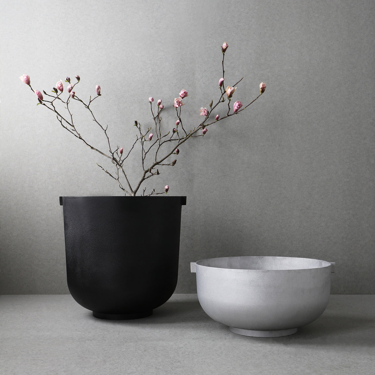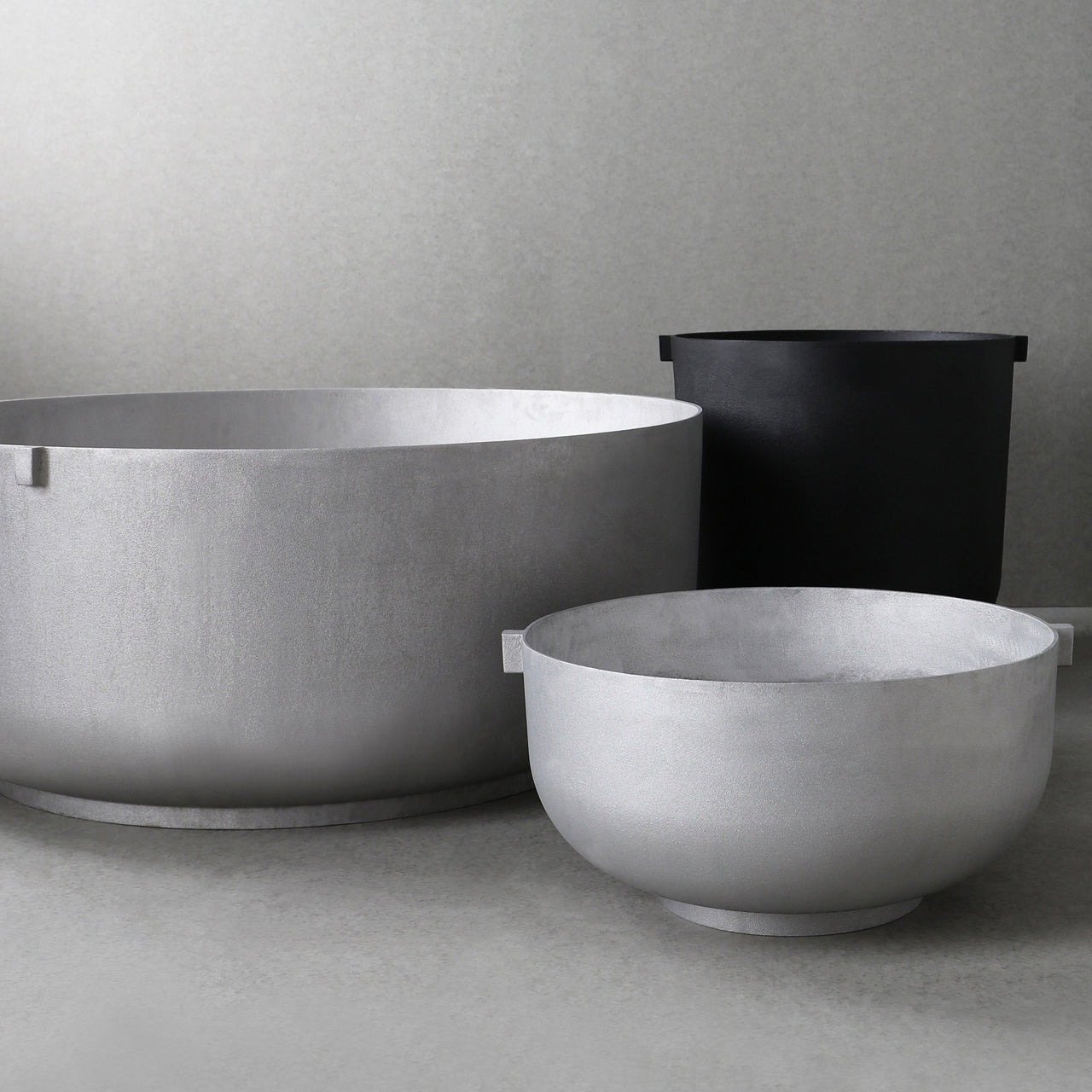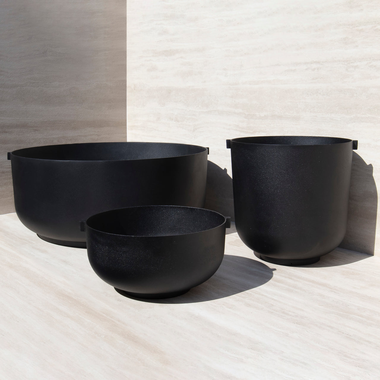The Castle Planters are crafted from sand-cast solid aluminum, offering a modern interpretation of classic antique vases. Designed with sculptural simplicity, these planters are suitable for indoor and outdoor use. Available in 3 sizes and 2 finishes, raw aluminum and UV-resistant black powder-coated option. Each planter is uniquely hand-cast, resulting in a distinct surface texture.