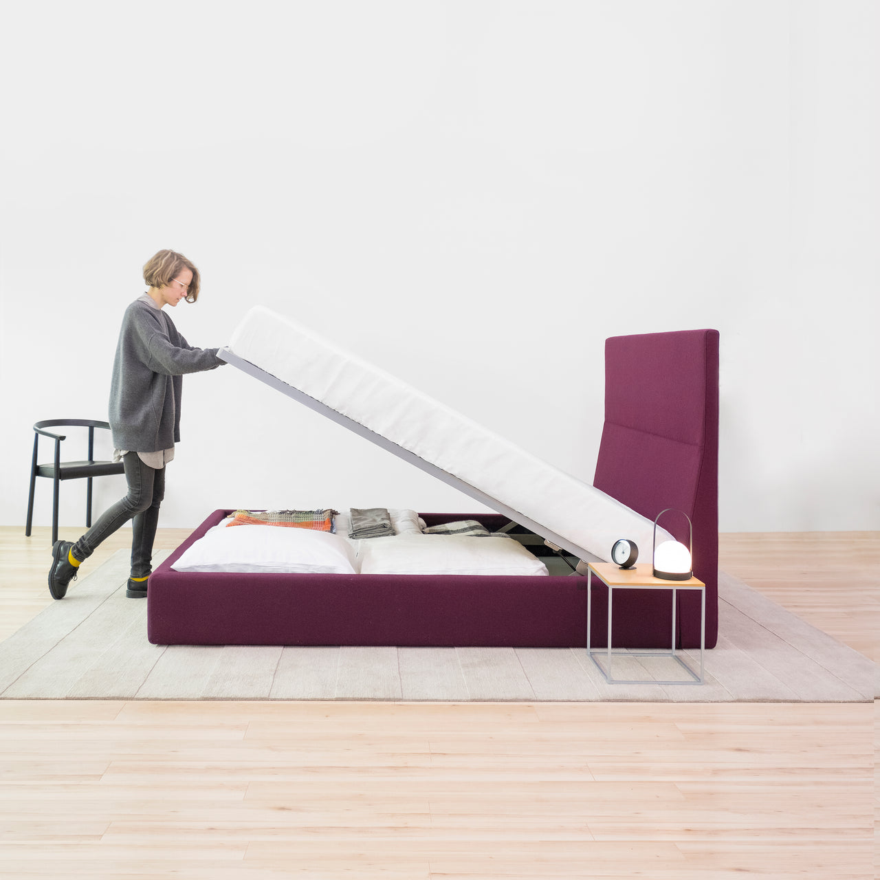 Everest melds inspired design with thoughtful functionality. With a concealed storage area accessed by hydraulic lift, it fits any queen-size mattress. The integrated steel frame eliminates the need for a box spring, replacing it with wooden slats that can be adjusted for desired lumbar support. The strikingly angular headboard is purposely tall to rest the head while sitting up in bed while the gentle wedge of the lower half offers essential lumbar support.