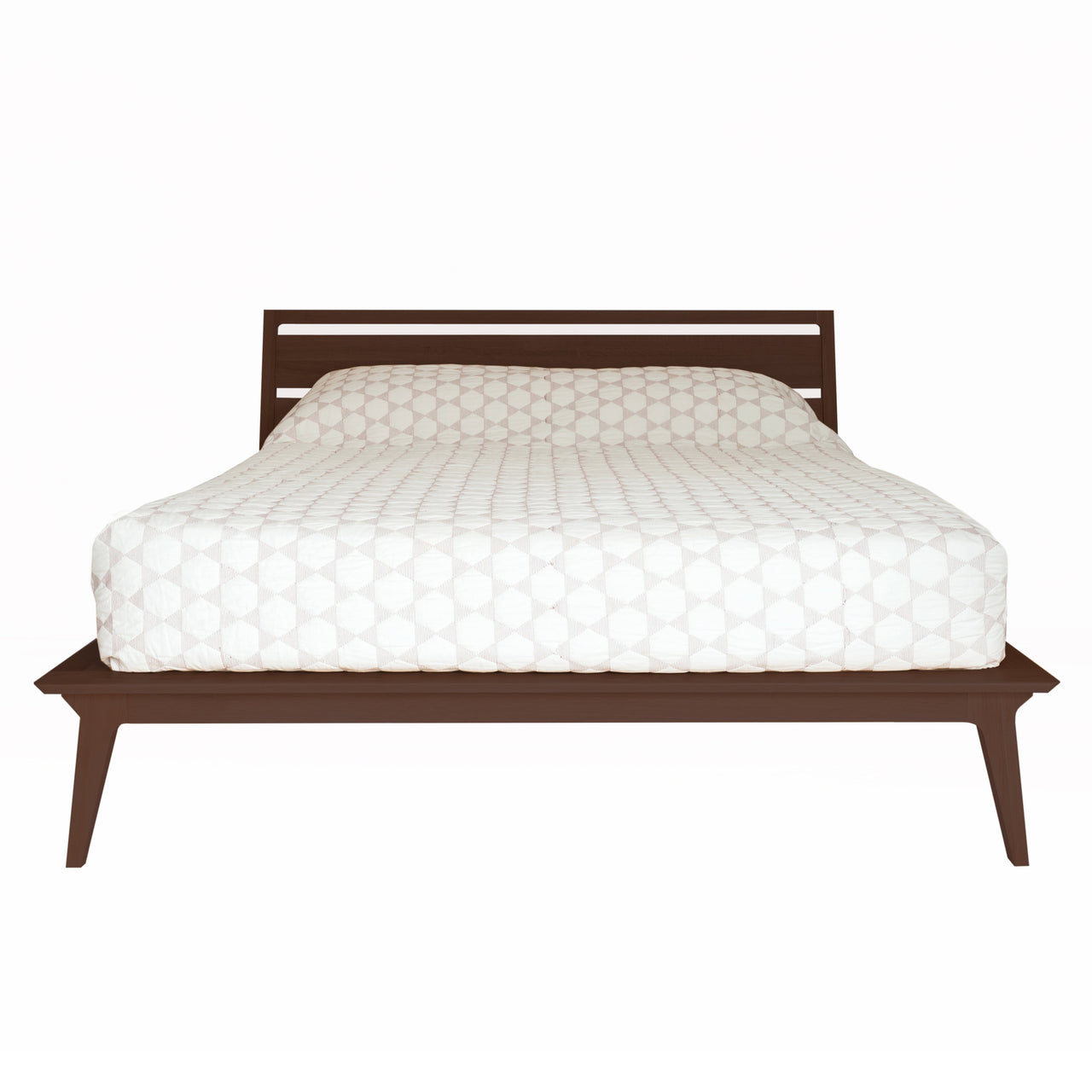 The Valentine Bed features a solid wood base and slatted headboard, showcasing gently tapered legs that point outward for visual balance. Available in finishes oak, stained walnut, or black stain, each treated with clear polyurethane lacquer for durability. The bed includes a birch spring slat kit for optimal mattress support.