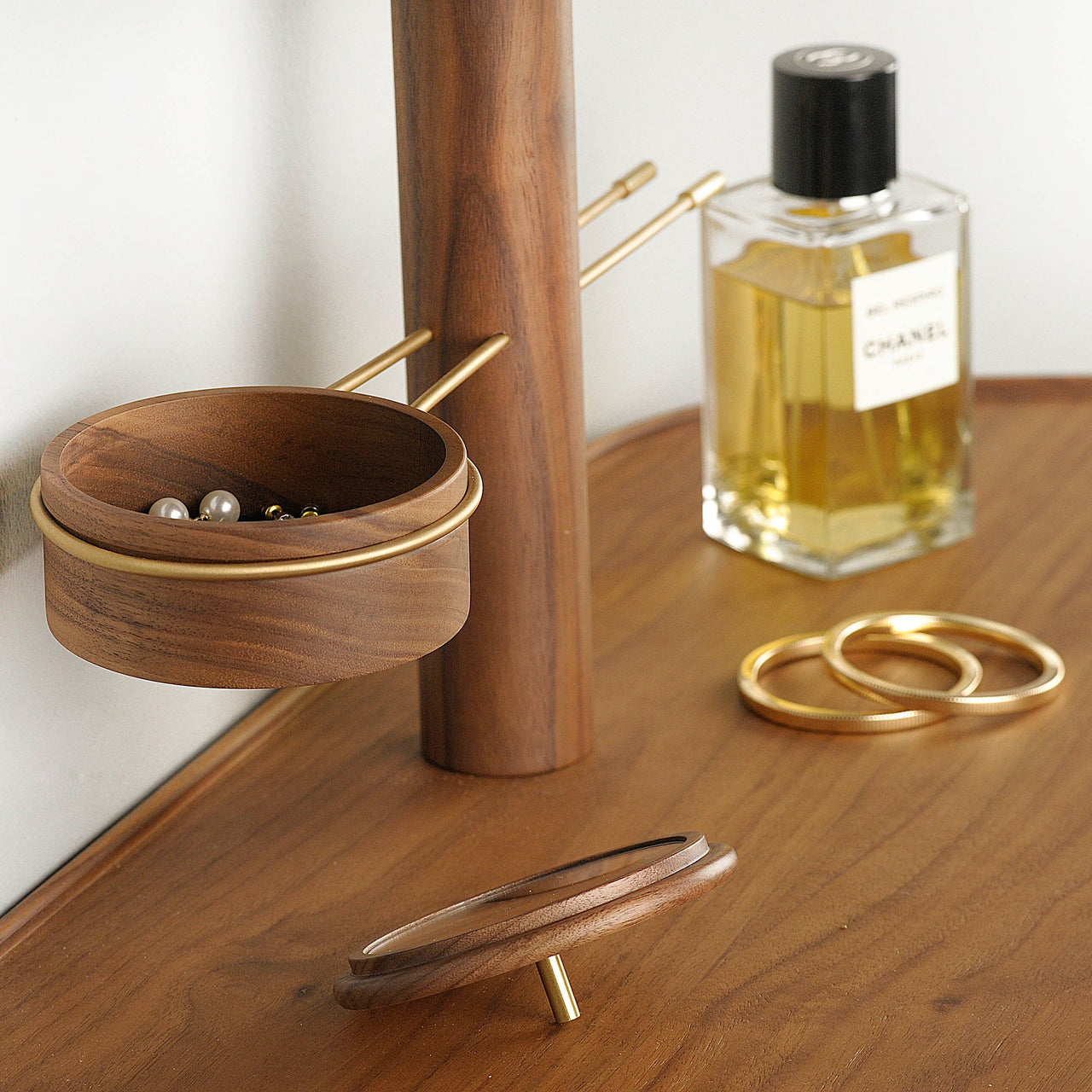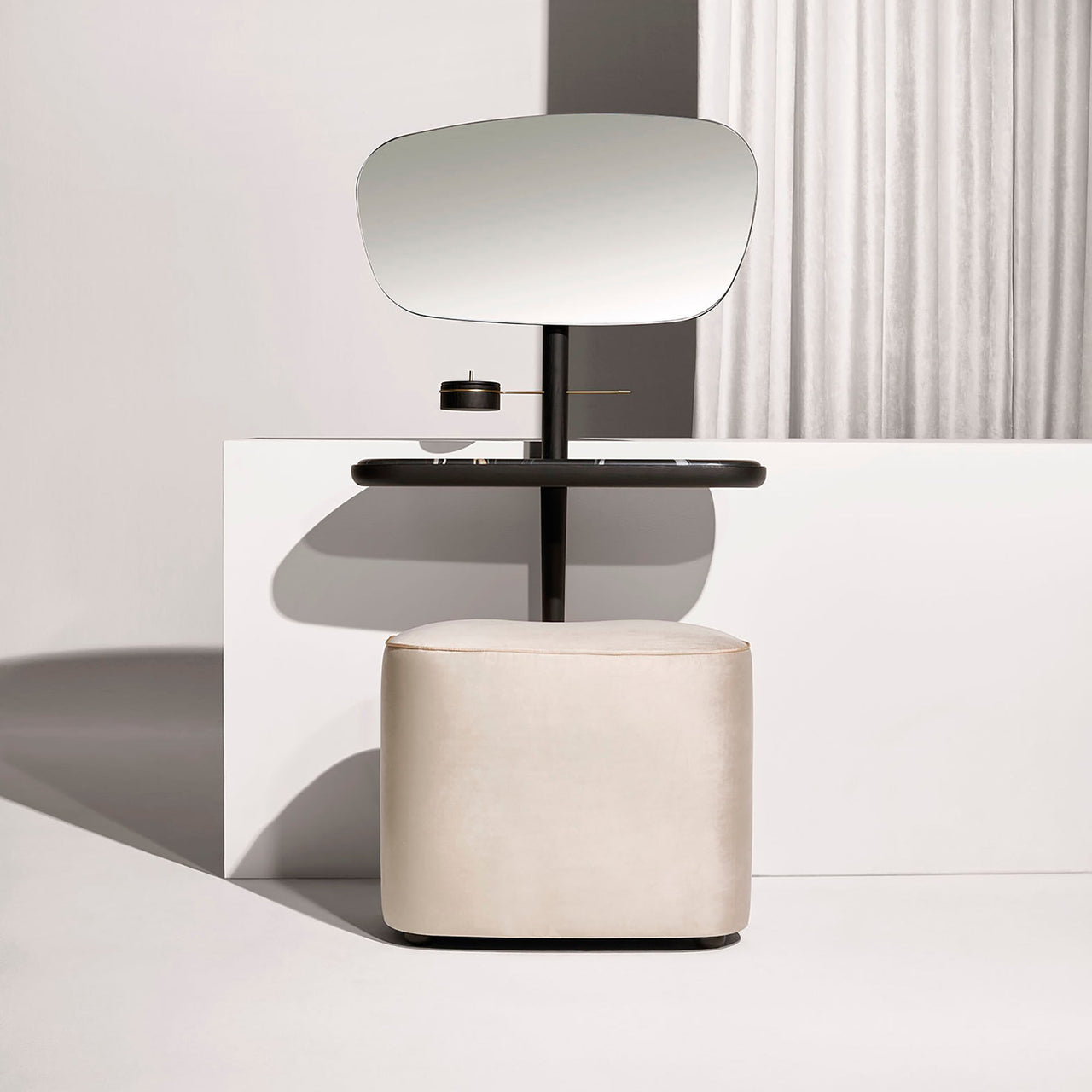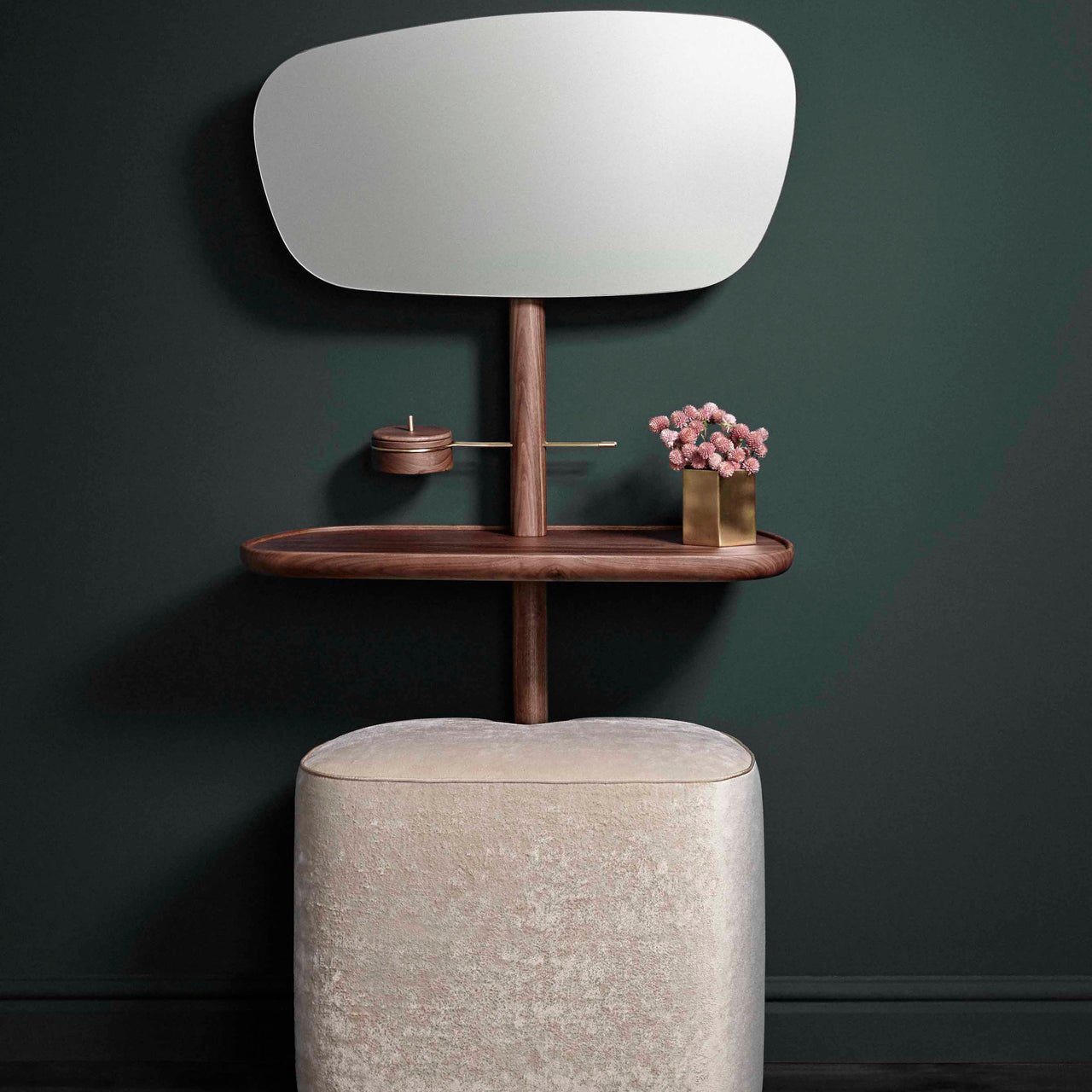 Barcelona's Nomon Home brings an elegant functionality to a woman's daily ritual with this gorgeous solid-walnut dressing table. Sensual rounded shapes dictate Tocador's appeal, with its tabletop rendered in either the woodgrain or luxurious marble and the complementary mirror that adjusts to 2 heights and 2 positions. Delicate brass bars can hold earrings or bangles while a lidded jewelry box secretes other treasures.