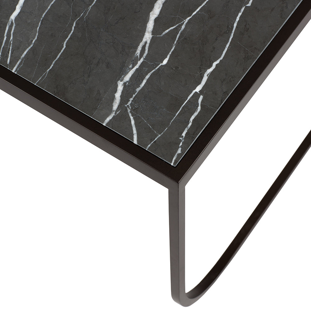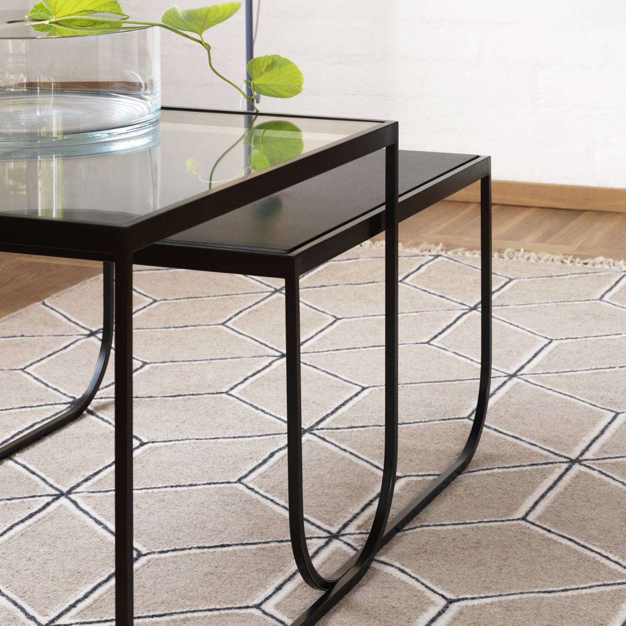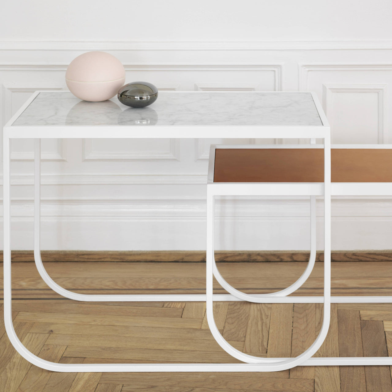 Swedish designers Mats Broberg and Johan Ridderstråle extend their airy linear collection named for legendary French filmmaker Jacques Tati with a pair of slim occasional tables. The smaller, higher version follows the collection’s signature curves and lyrical metal framework and can be used singly or slid together with its longer, lower counterpart. Tabletop choices in transparent and lacquered glass or genuine limestone and marble are available to go with the range of lacquered frame colors.