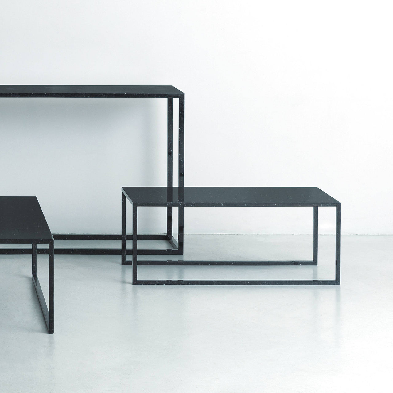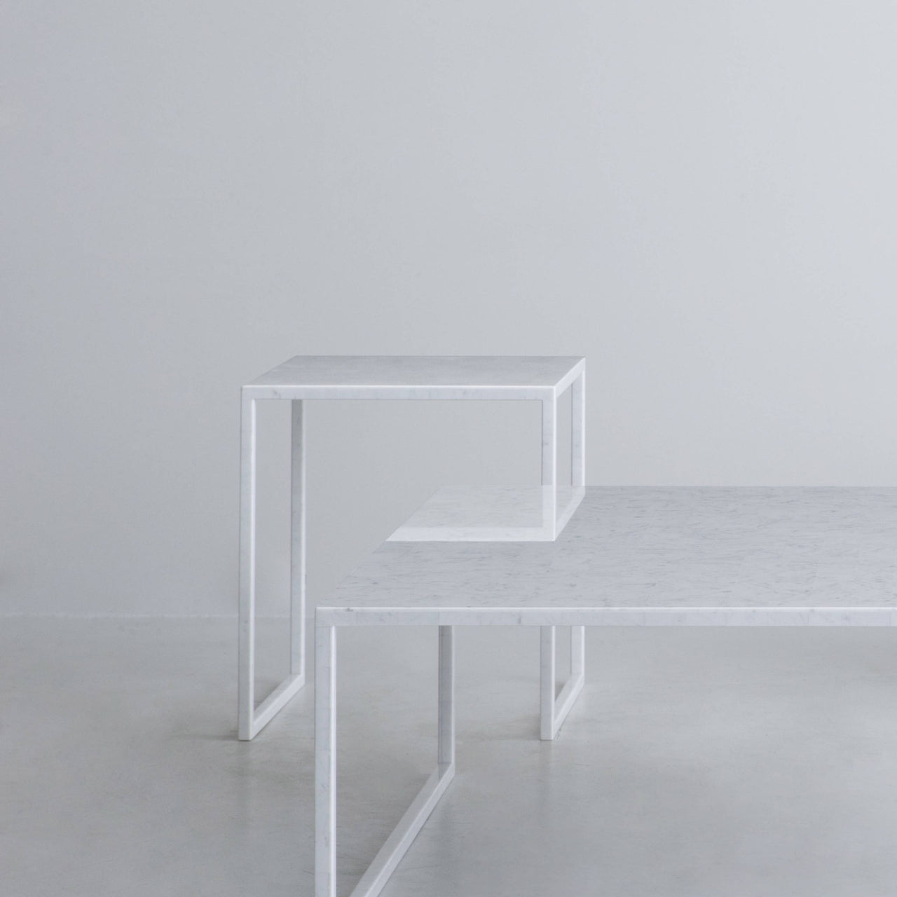 Virtuoso artisan skill suffuses By Interiors’ allover marble occasional table with its striking light and clean shape. BK has a timeless geometric profile, down to its astonishingly thin legs—all achieved with the stone painstakingly inlaid in a steel frame. Choose from either the lower coffee table or higher side table in creamy Carrara, inky Marquina or honey Emperador varieties.