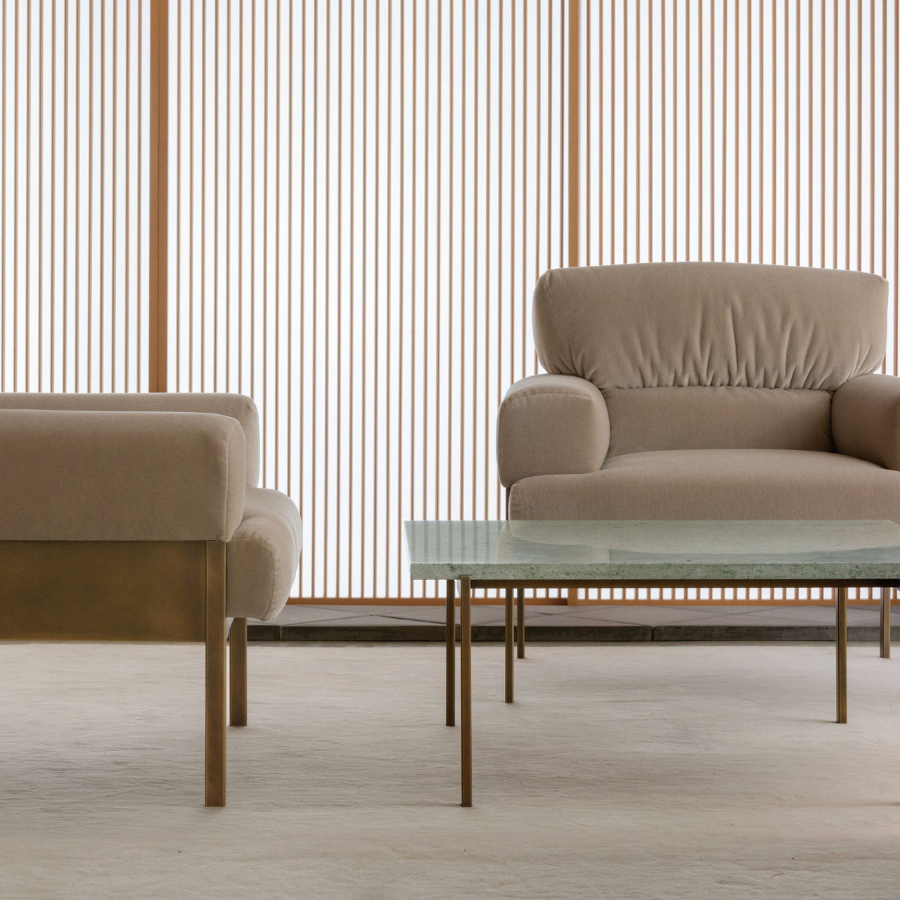 Here in a majestic but spare coffee table version, Tomoyuki Sakakida plays on Suki’s meaning as "to like," which the designer interprets as a tightly edited use of materials. A simple steel frame, in a choice of brass-plate or black powder-coat finish, grasps its respective slab tabletop in variegated Towada stone or an inky Urushi lacquer finish. In a pleasing nearly square shape, the table updates the Japanese idiom of eloquent simplicity to complement any seating area.