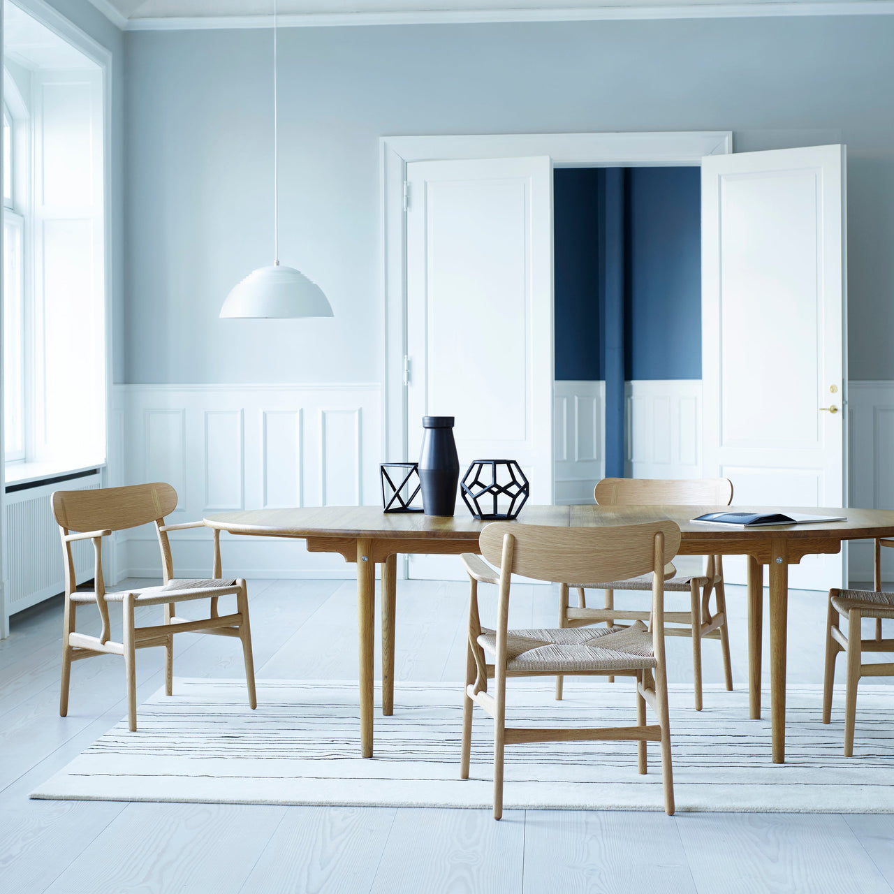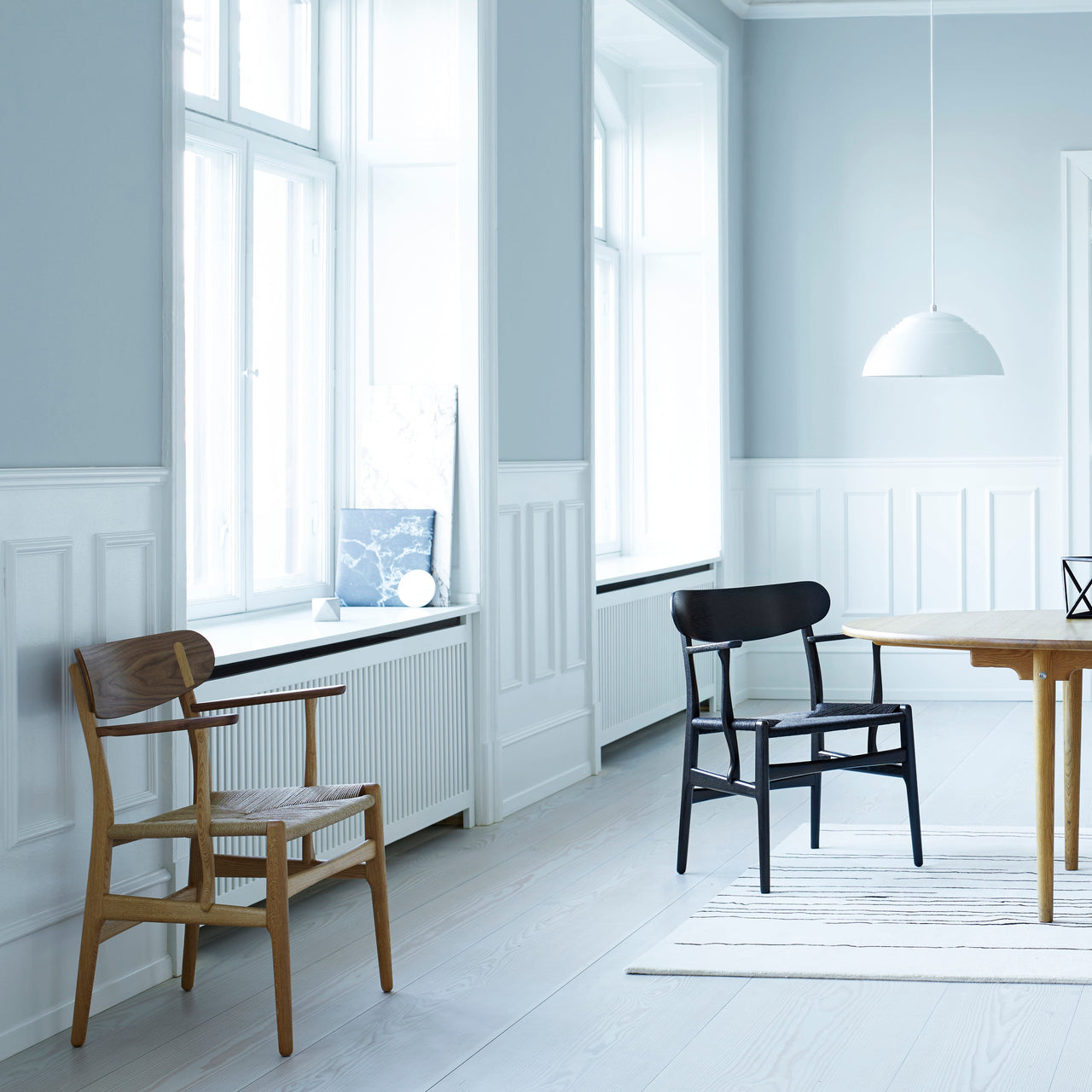 Riffing on his 1950 lounge chair, Hans J. Wegner's dining chair with similarly curved organic shapes and a woven seat went unproduced until now. CH26 features comfortable ergonomics, a sturdy construction and characteristic curved armrest supports and serves equally well as a dining chair and desk chair. Fashioned in solid oak, walnut or a combination of the 2 woods with a form-pressed veneer back, it also offers a range of finishes. The seat is available in natural or black paper cord.