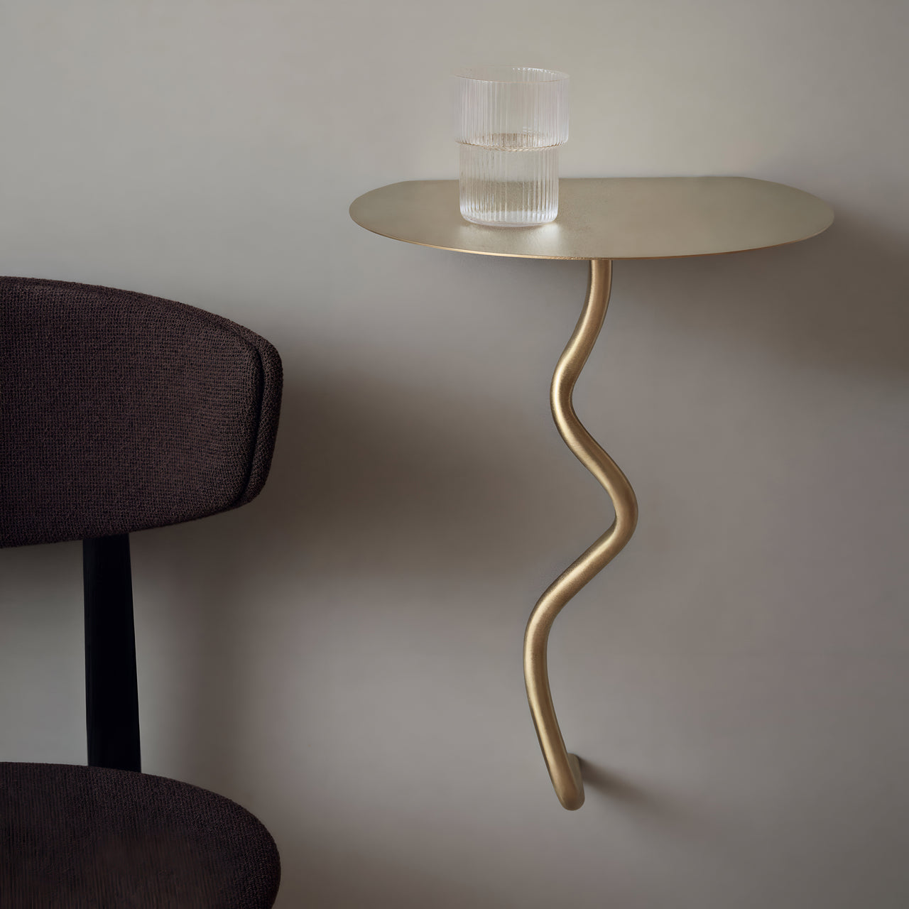 The Curvature Wall Table blends delicate, whimsical curves with solid brass construction, providing a decorative surface ideal for small spaces. Inspired by jewelry design, this wall-mounted table is a bedside stand or a convenient spot for keys and essentials in a hallway. Handcrafted with either a matte or black patina finish, each table is unique. Over time, the brass material will develop a natural patina, adding character to the piece.