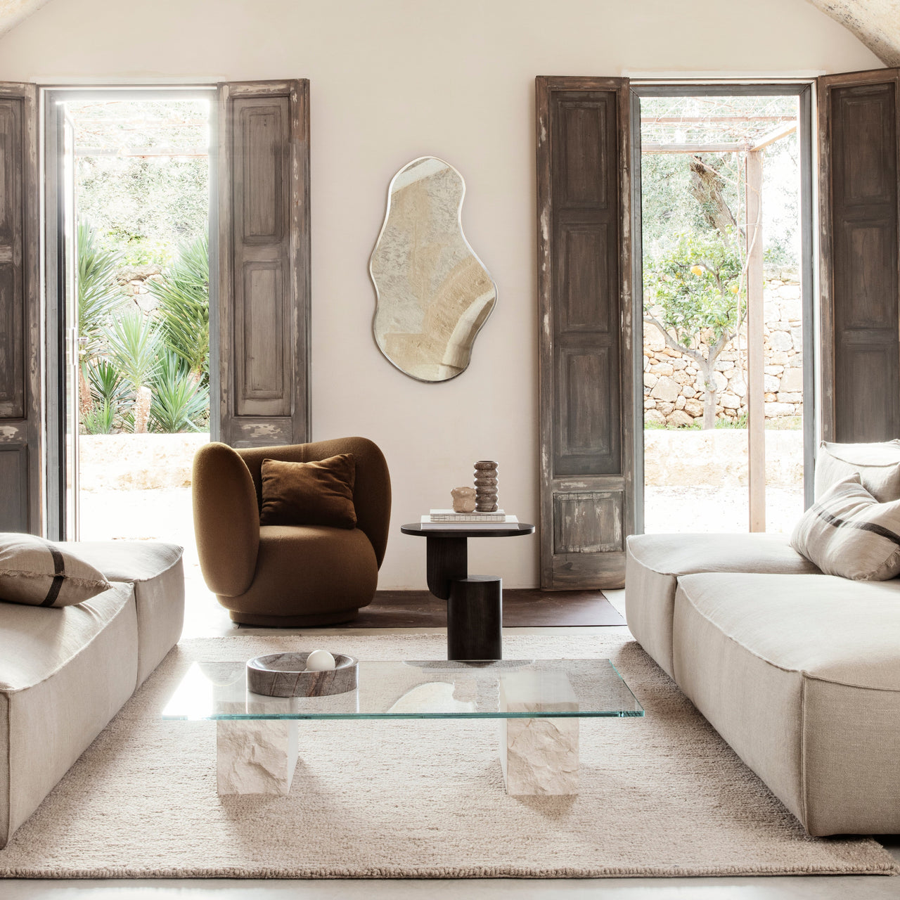 Ferm Living’s mixed-media coffee table offers a gutsy, naturalistic take on luxurious materials. Mineral Coffee Table showcases the intriguing beauty of marble in both its polished and raw states. A clear rectangular glass top is placed on a base of dual stone blocks—each with an end which is left unfinished for a bracingly textural contrast.