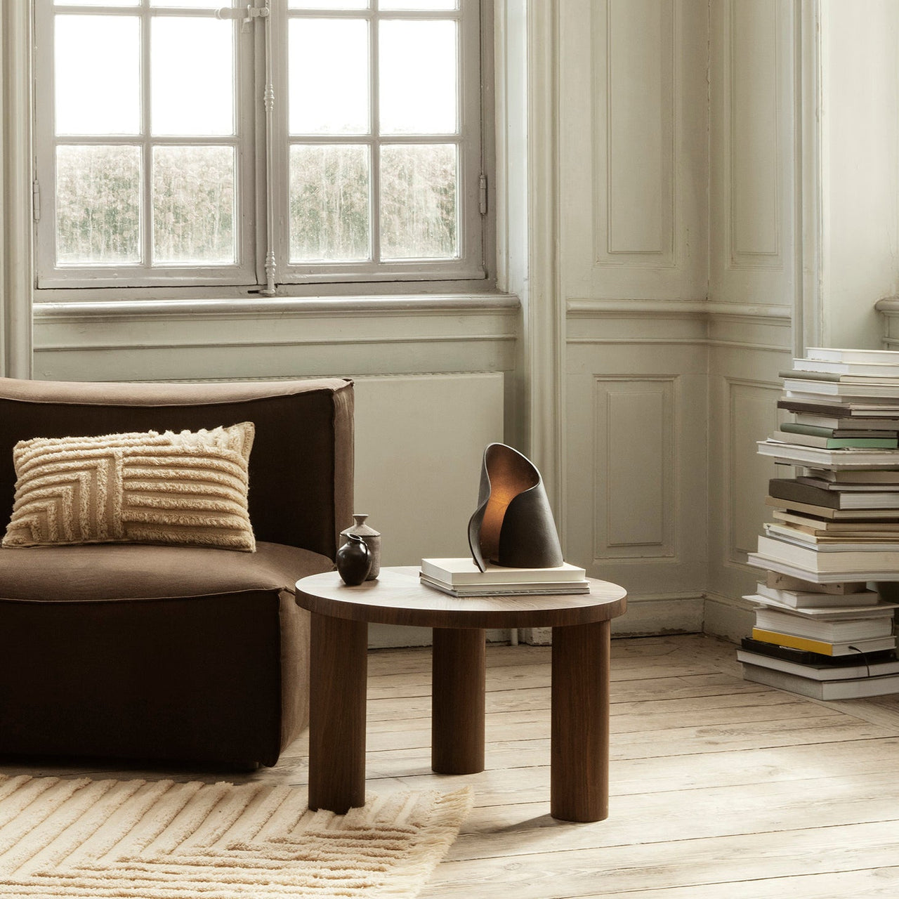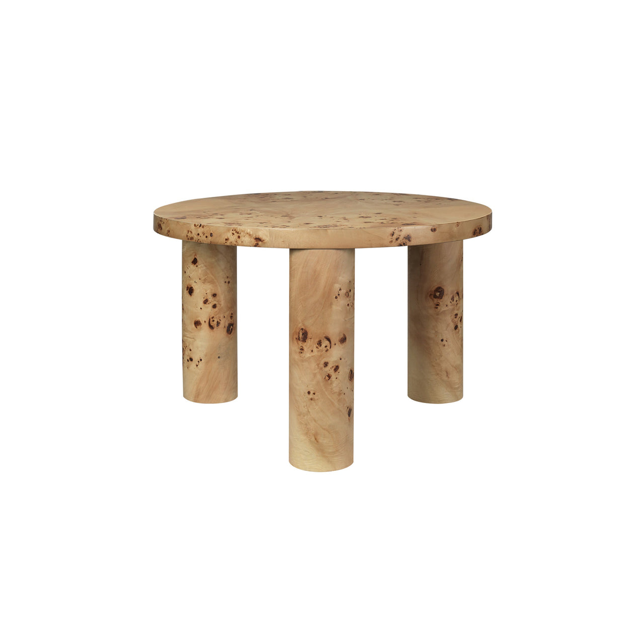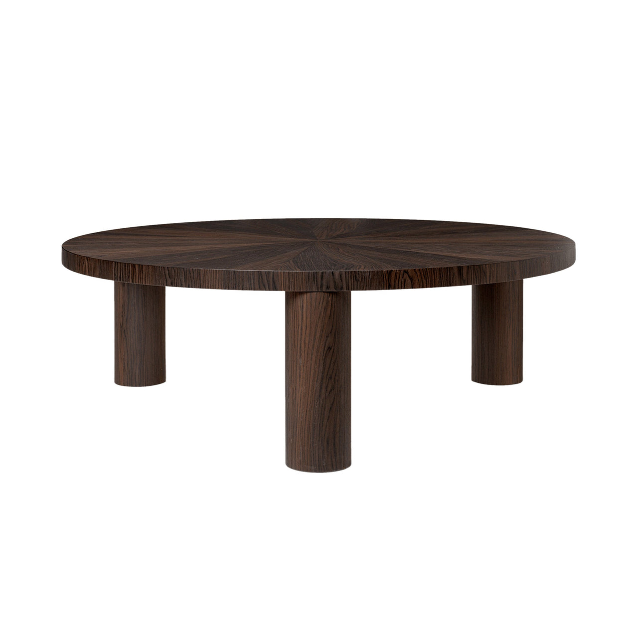 The legacy of Brutalist architecture meets Scandinavian refinement in Ferm Living's solidly proportioned wood coffee table tempered with intricate detailing. Sustainably crafted from FSC-certified timber, Post has three robust cylindrical legs and is embellished with hand-assembled inlaid marquetry. The smaller, higher model features a tabletop with a starburst pattern in spherical sectors while the larger, lower table has striped veneer marquetry legs. Each one is striking on also its own or they can be grouped in an impressive pairing.