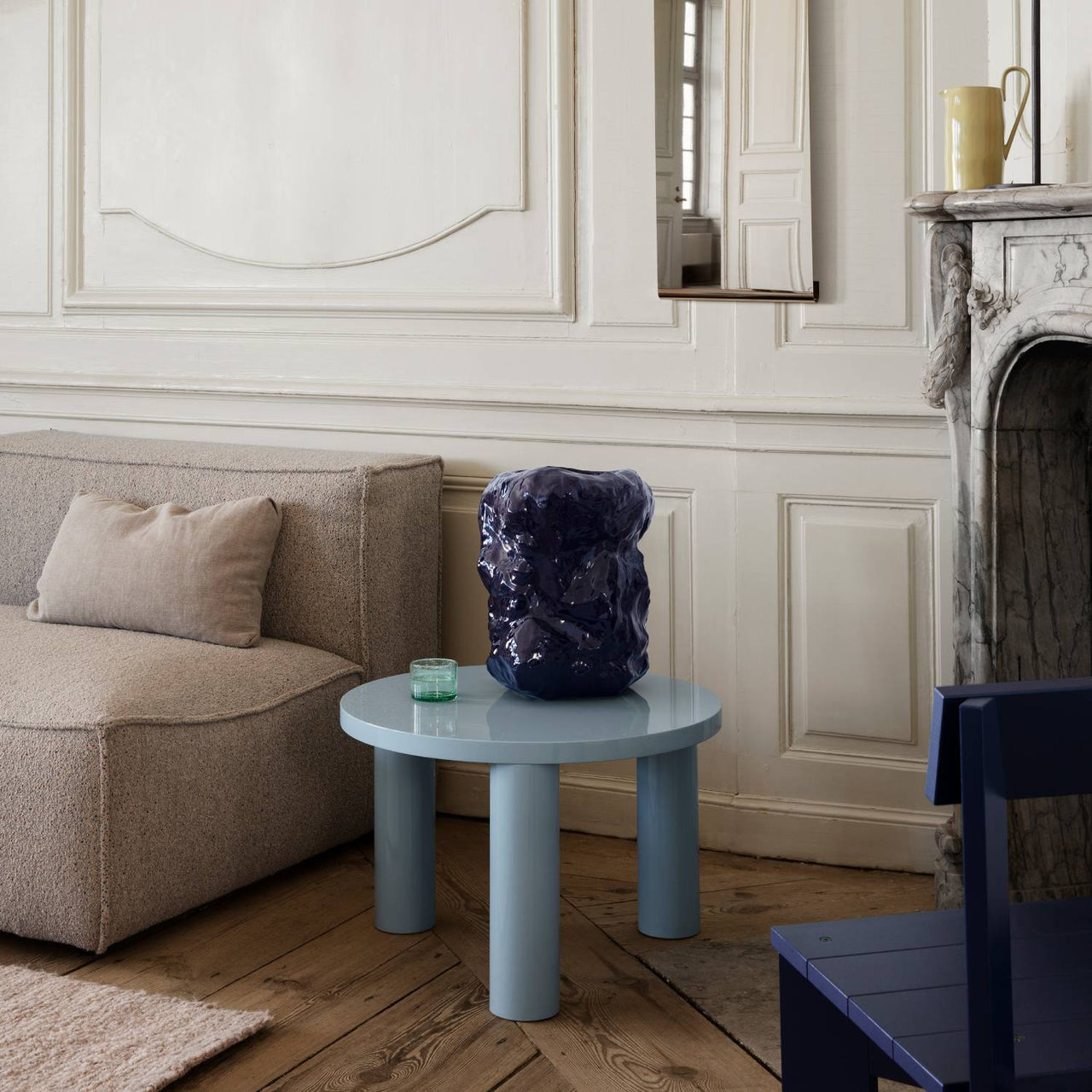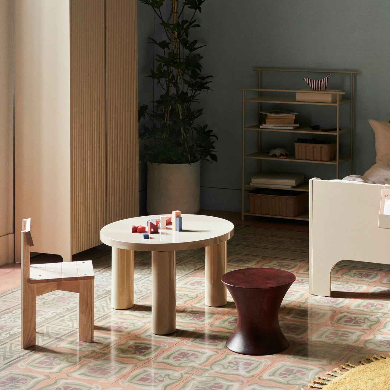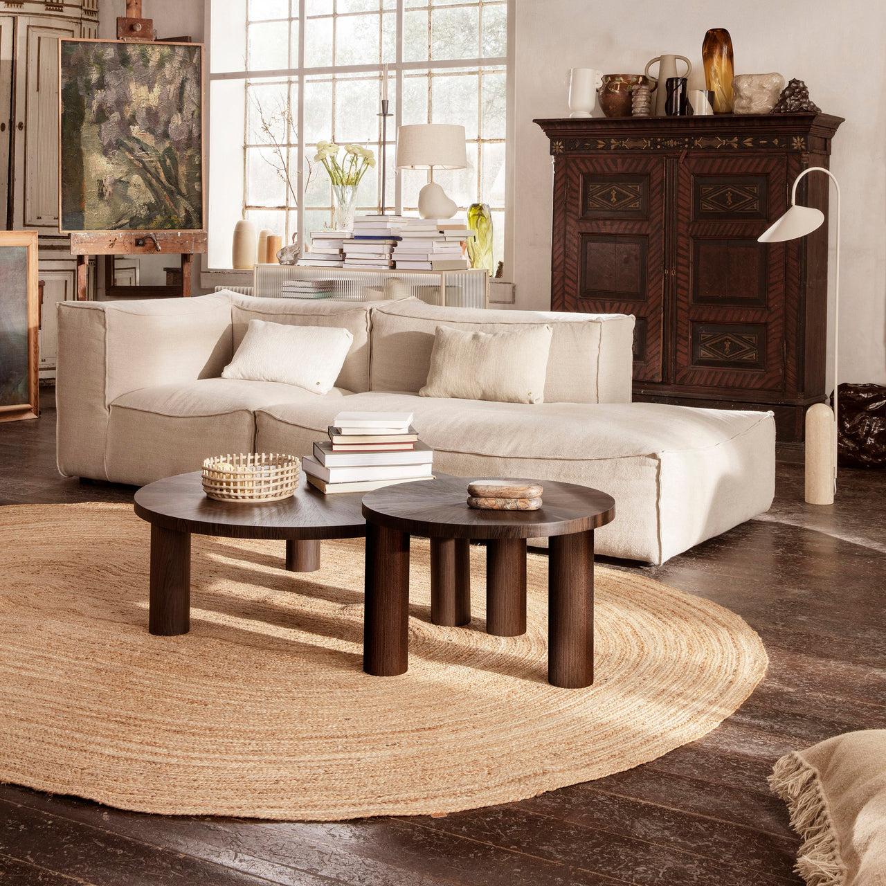 The legacy of Brutalist architecture meets Scandinavian refinement in Ferm Living's solidly proportioned wood coffee table tempered with intricate detailing. Sustainably crafted from FSC-certified timber, Post has three robust cylindrical legs and is embellished with hand-assembled inlaid marquetry. The smaller, higher model features a tabletop with a starburst pattern in spherical sectors while the larger, lower table has striped veneer marquetry legs. Each one is striking on also its own or they can be grouped in an impressive pairing.