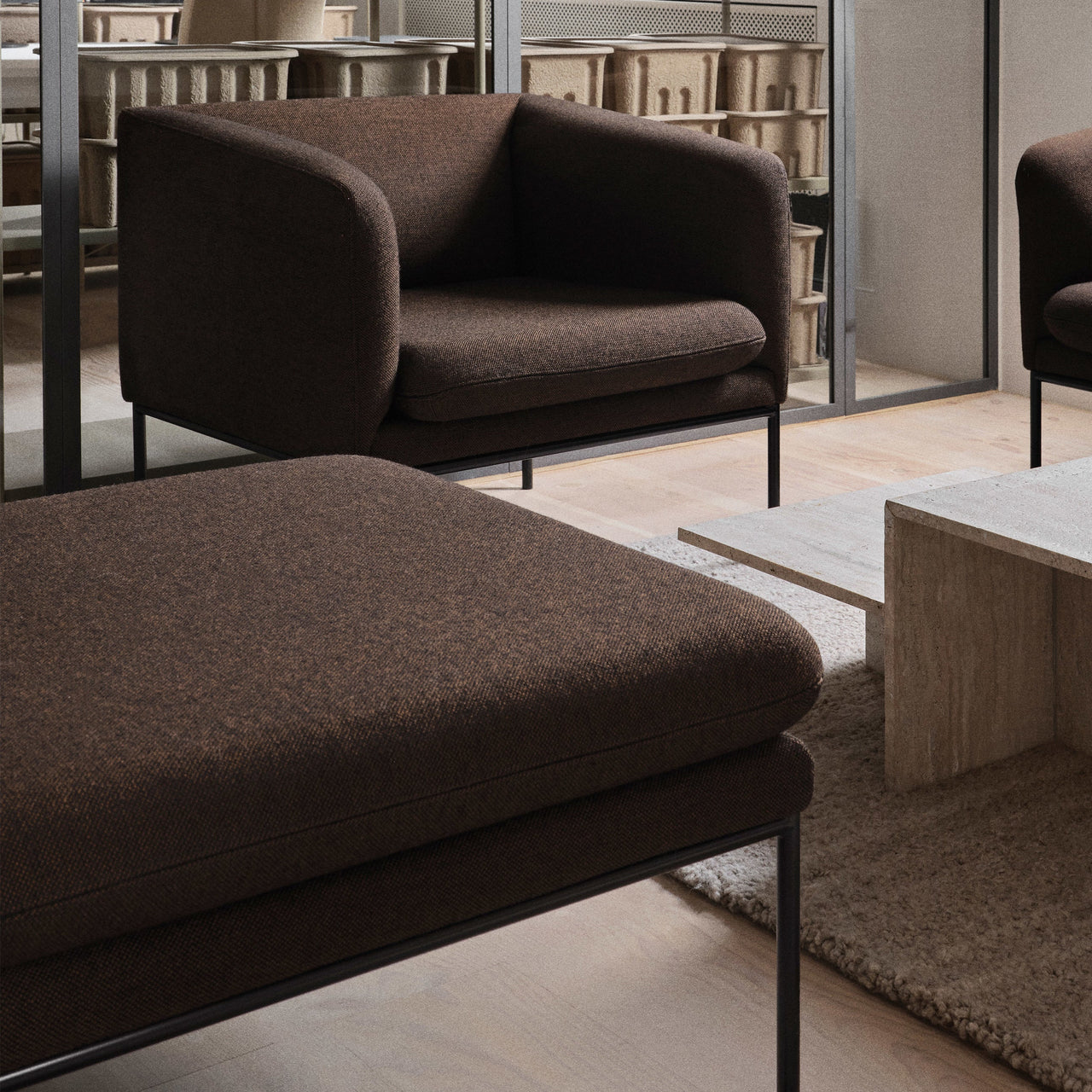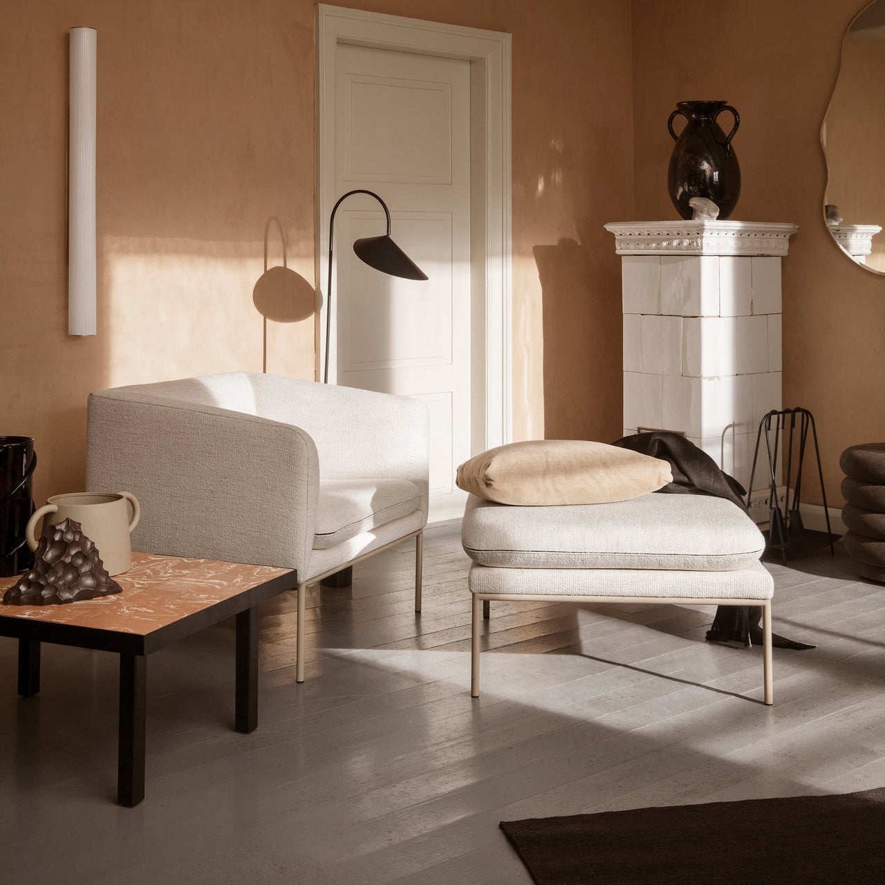 Ferm Living's multifunctional pouf contrasts its angular profile with the softness of the rounded cushion. Upholstery in a select fabric or leather of choice complements the powder-coated steel base in a choice of neutral cashmere or black shades. Featuring No-Sag spring construction and HR foam fill, the versatile piece has crisp tailoring and spare lines for a timelessly clean look.