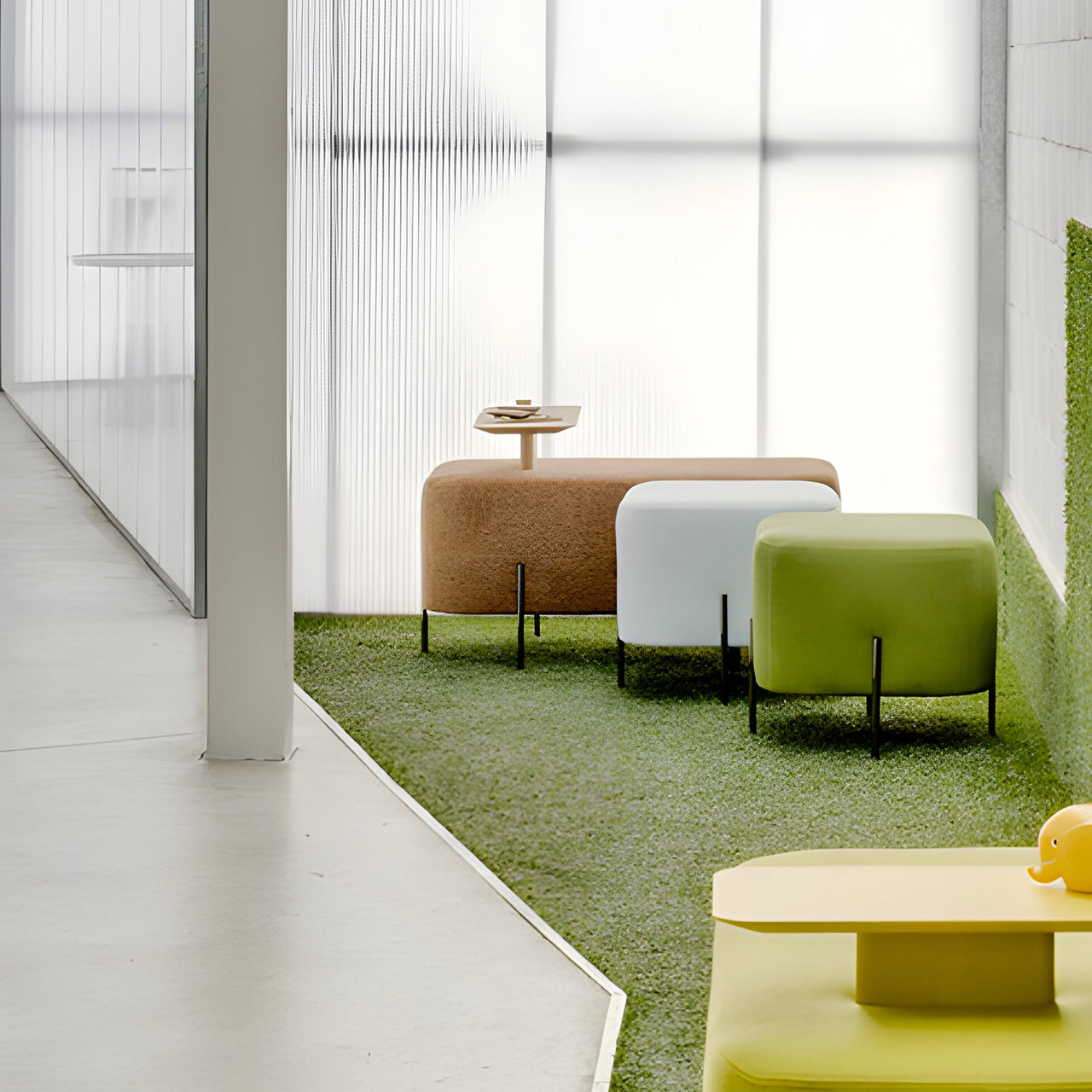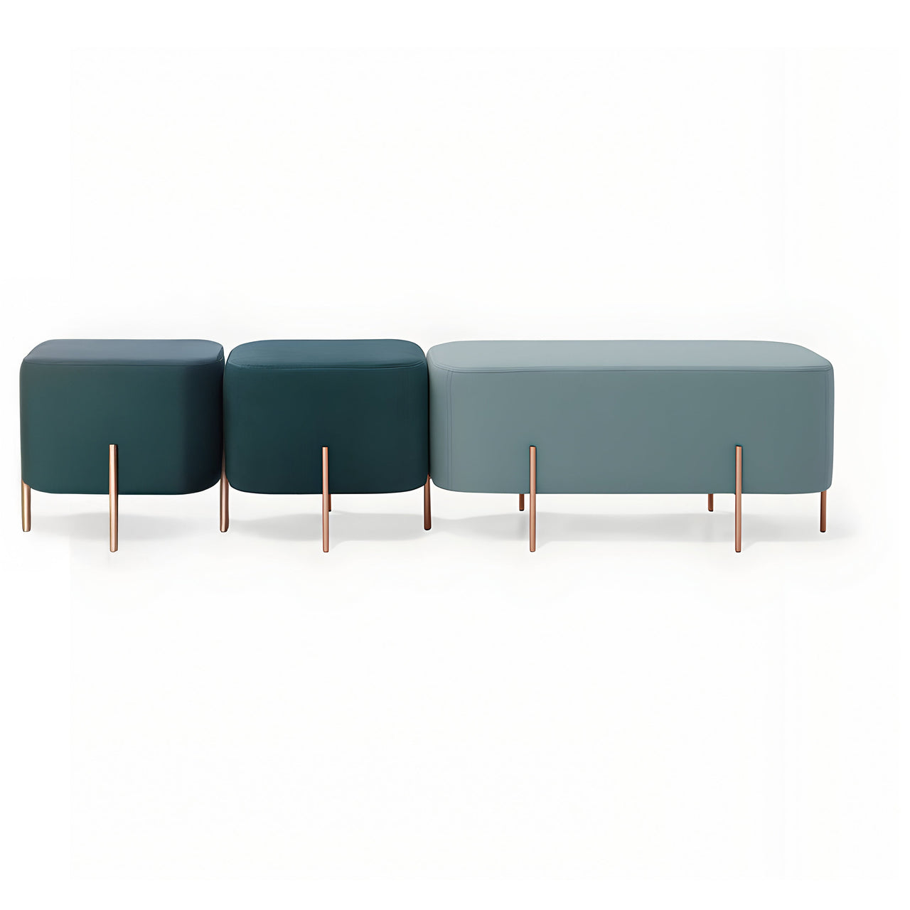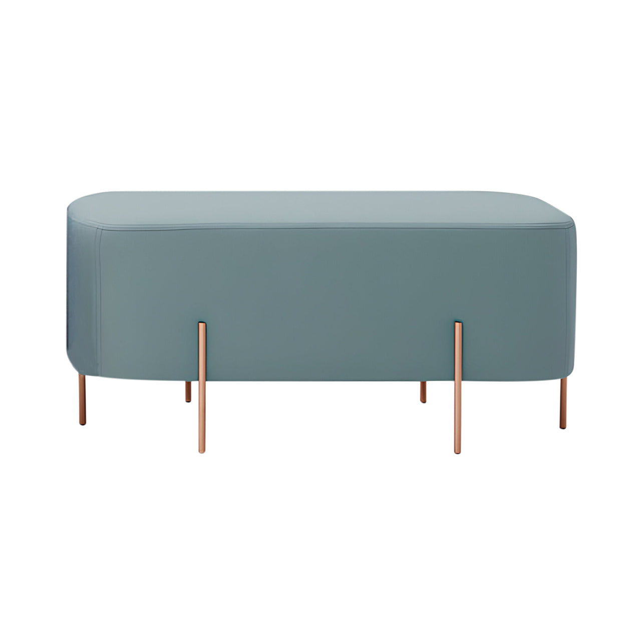 The Elephant Pouf features a simple geometric shape in two sizes with rounded edges for a soft, inviting look, with an option for an integrated oak tray. The legs come in copper, bronze, or graphite finishes. These poufs can be placed at the foot of a bed, in cafés, or grouped in hotel receptions, adapting to different seating needs.