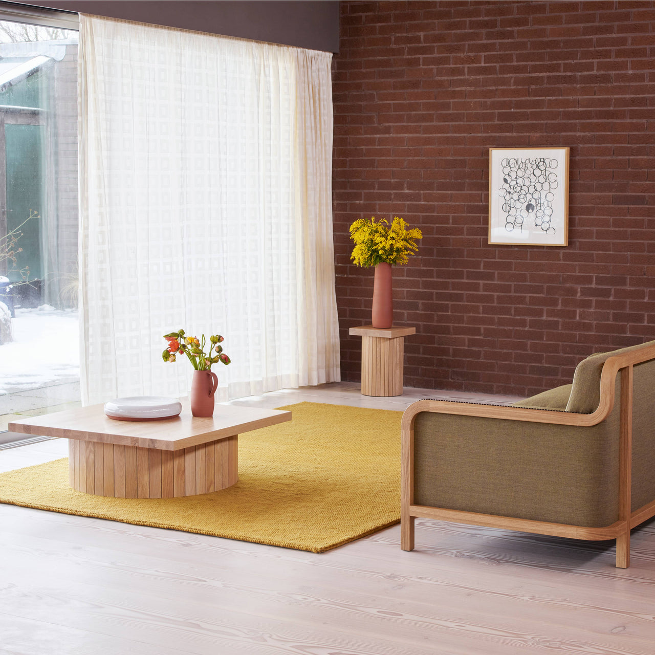 Reminiscent of wine or whiskey casks, SCP’s coffee table also has a Brutalist sensibility in its forthright motif with the repetition of a single wood plank. Designer extraordinaire Philippe Malouin makes use of the same cut of pre-sawn American white oak to fashion Barrel’s laminated top while the same lengths are sliced in half and tessellated in a circular pattern to create the base. Awarded the Design Guild Mark, the coffee table is made in Europe from solid FSC timber with an oiled finish.