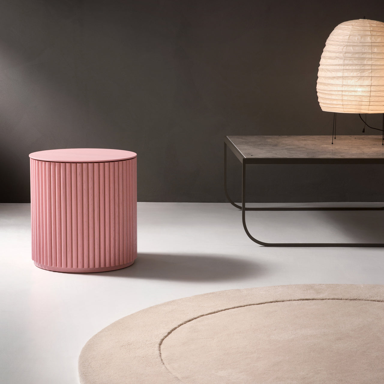 Tati’s higher coffee table hews to the collection’s signature curves and linear metal framework. Designer-architects Mats Broberg and Johan Ridderstråle deliver a versatile piece to use as a cocktail table, a lounge-y dining surface or to slide together as a dynamic duo with its lower counterpart. Stockholm-based Asplund offers a wealth of enticing tabletop choices—in several wood varieties and genuine limestone or marble selections—to complement the range of lacquered metal frame colors.
