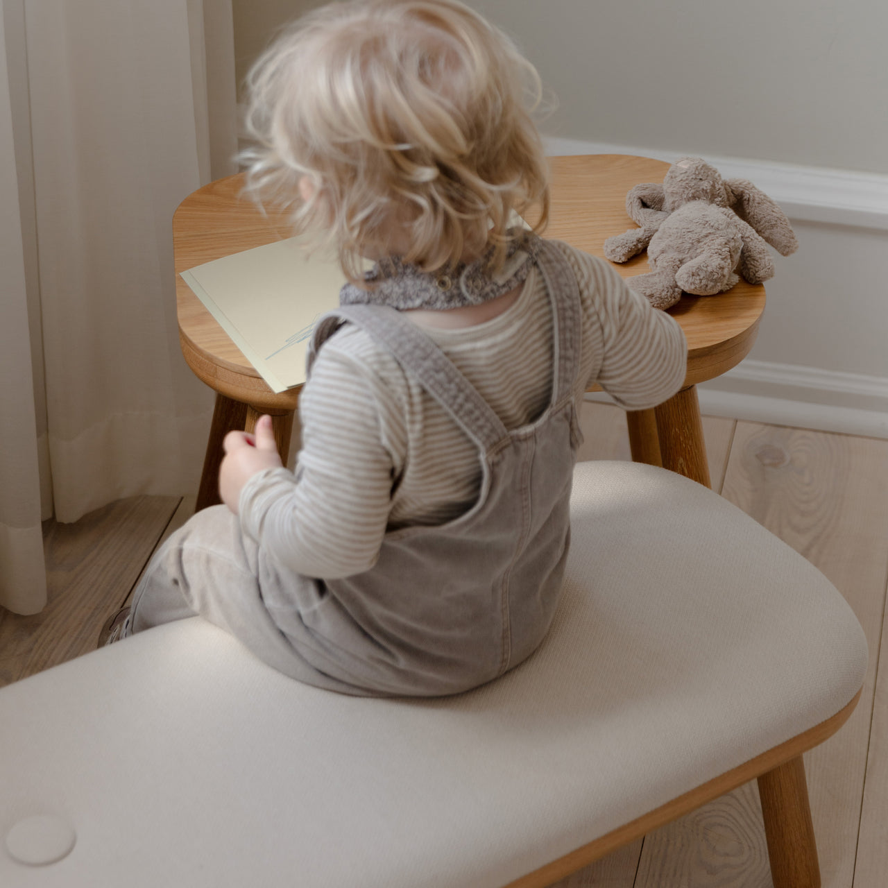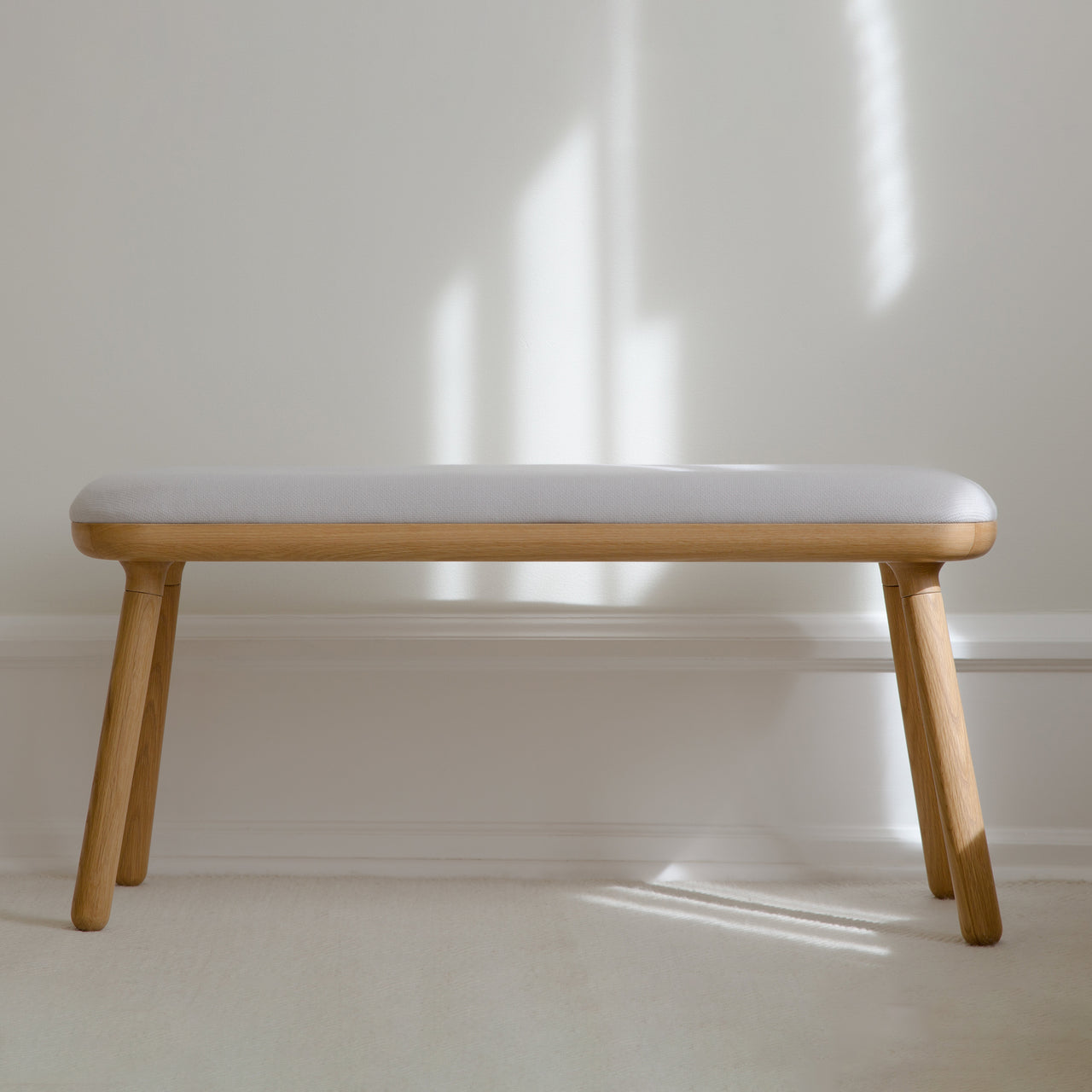 The Paff Bench offers practical seating for a range of spaces, including children's rooms and entryways. Its solid oak base ensures durability, while the upholstered seat, made from 100% recycled Horizons textile in four standard colors, provides comfort. Available in both low and tall versions, it accommodates both adults and children.