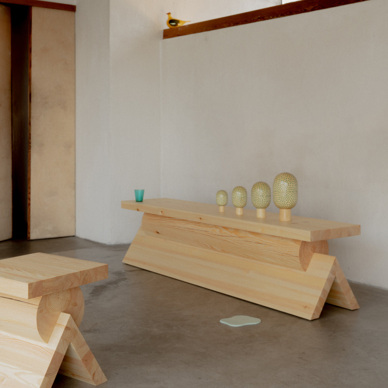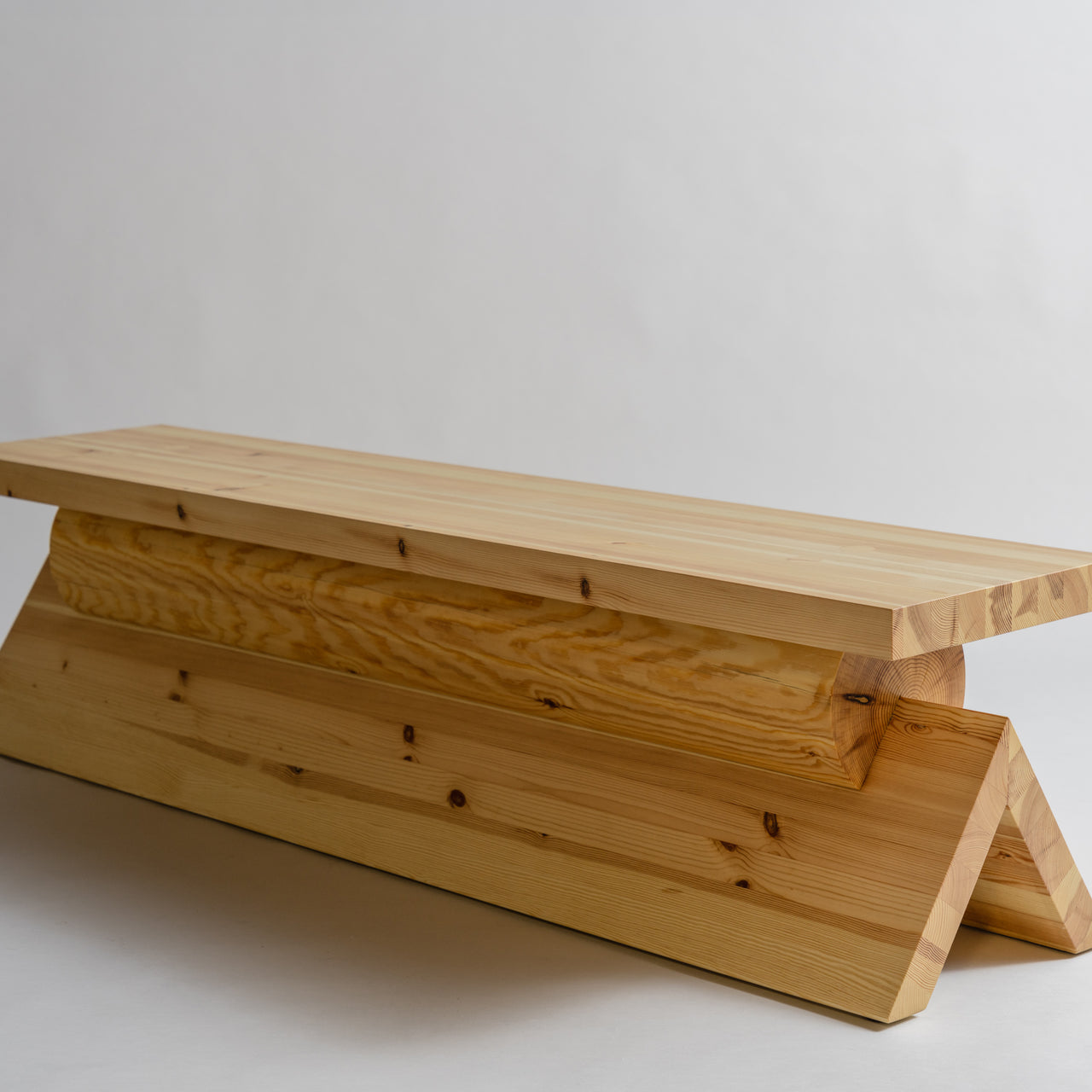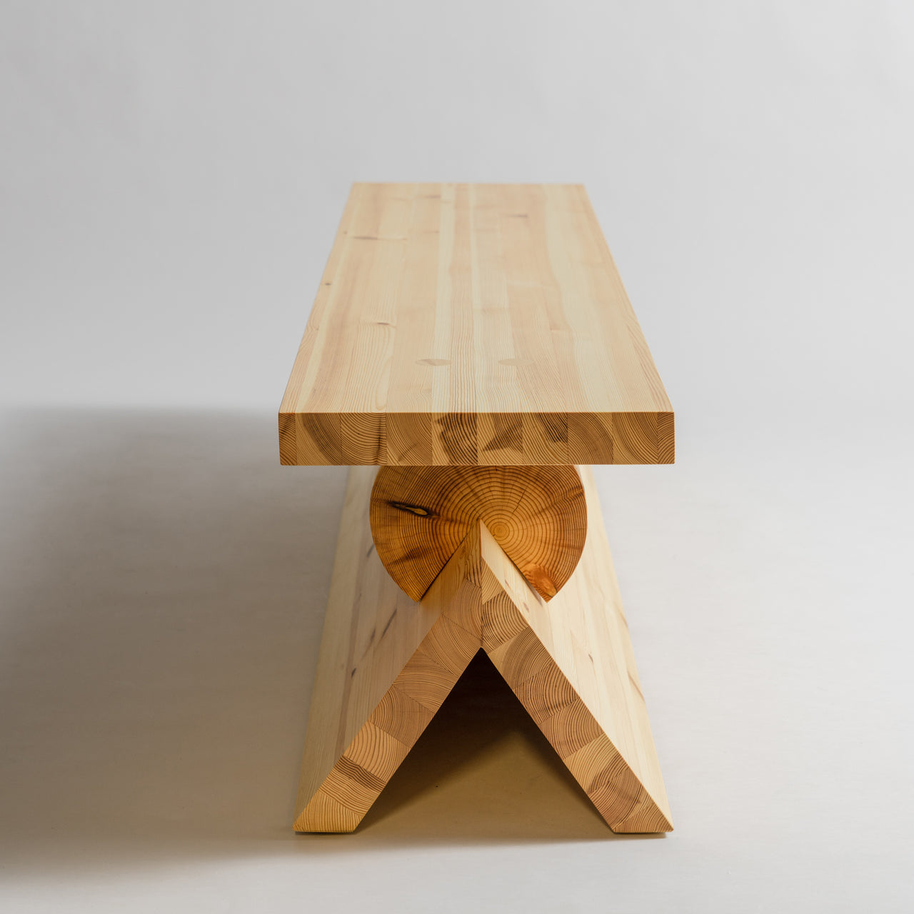 The 006 AA Bench, designed by Kwangho Lee, has a full pine log running through the middle, supported by a slatted seat and inverted V-shaped legs. Though the structure appears simple, it requires considerable carpentry expertise to join the hefty elements. Over time, the wood’s natural oils and resins will cause it to develop a warm honey tone, with dents and scratches adding character.