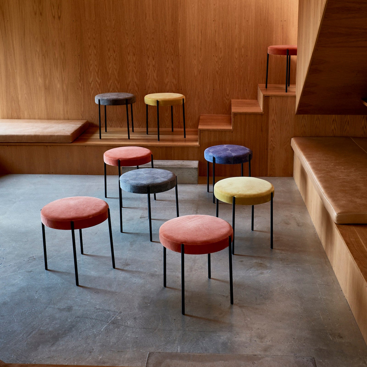 Series 430 by Danish designer Verner Panton includes a handsome and versatile stool variation. The circa 1967 seating incorporates a round upholstered cushion for comfort as well as smart appeal. A slimline black-finished steel frame frame is durable yet gives the piece an airy compact footprint.