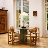The Epic Outdoor Dining Table draws inspiration from Greek columns and Roman architecture. Crafted in Italy from travertine stone, the table highlights the material's natural beauty and unique patina. Its monolithic design features a circular tabletop paired with a hexagonal base, creating a bold focal point for outdoor spaces. Each table displays distinct veining and striations, making every piece one-of-a-kind.