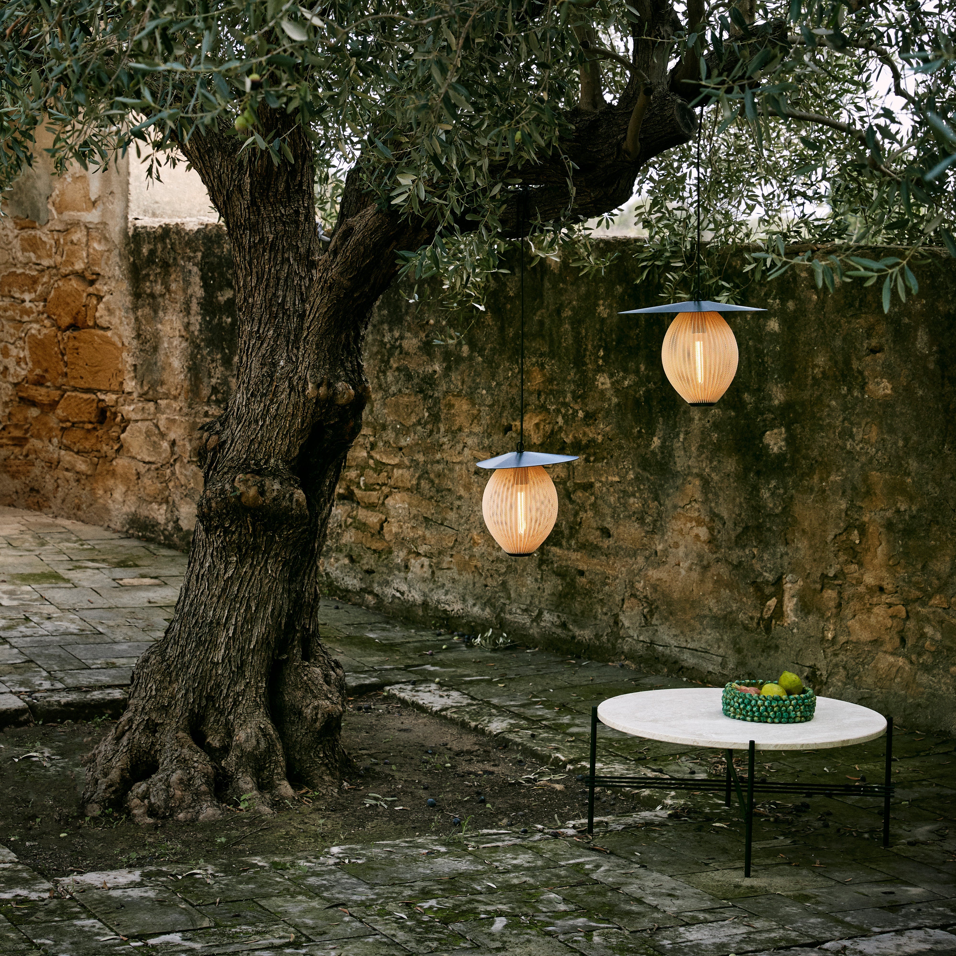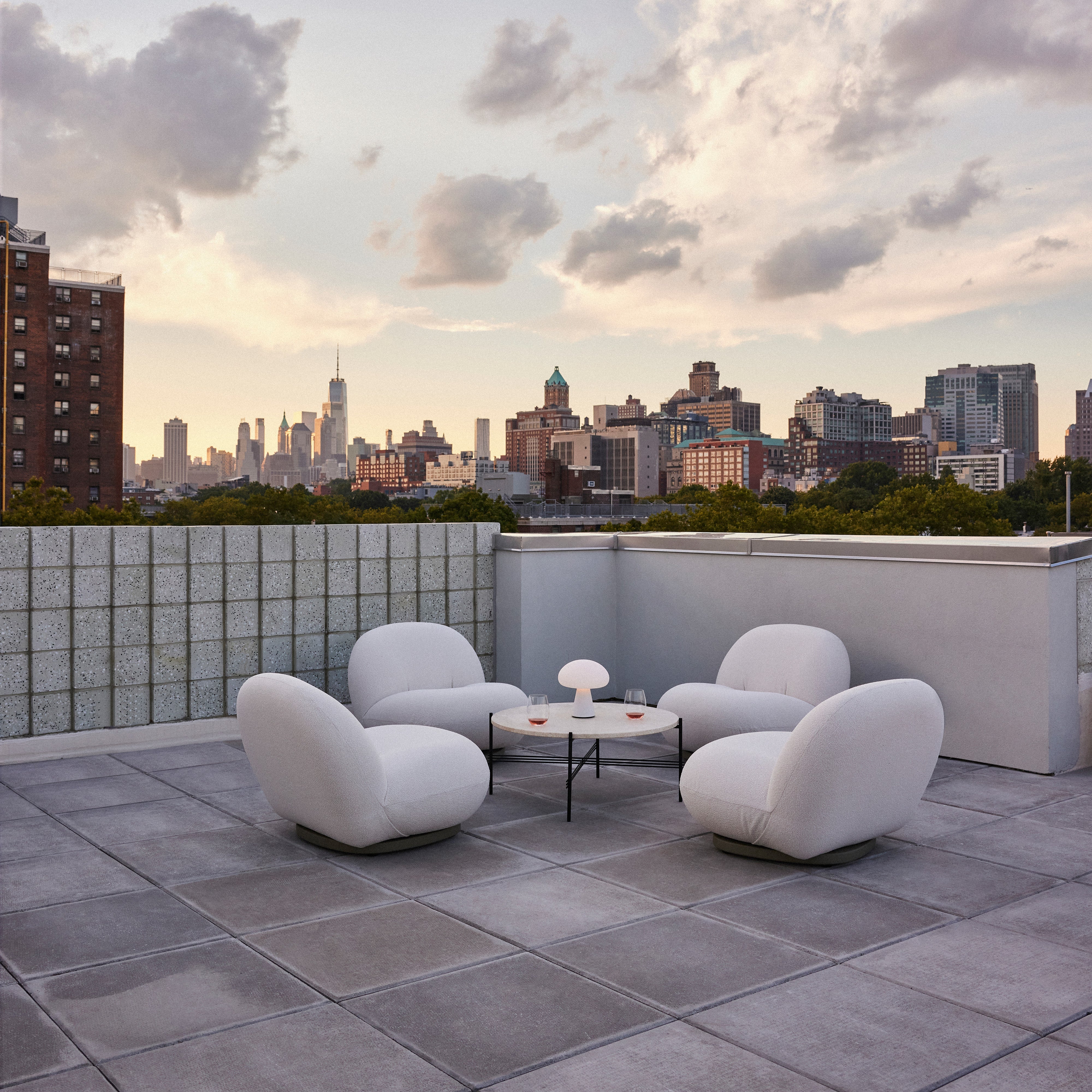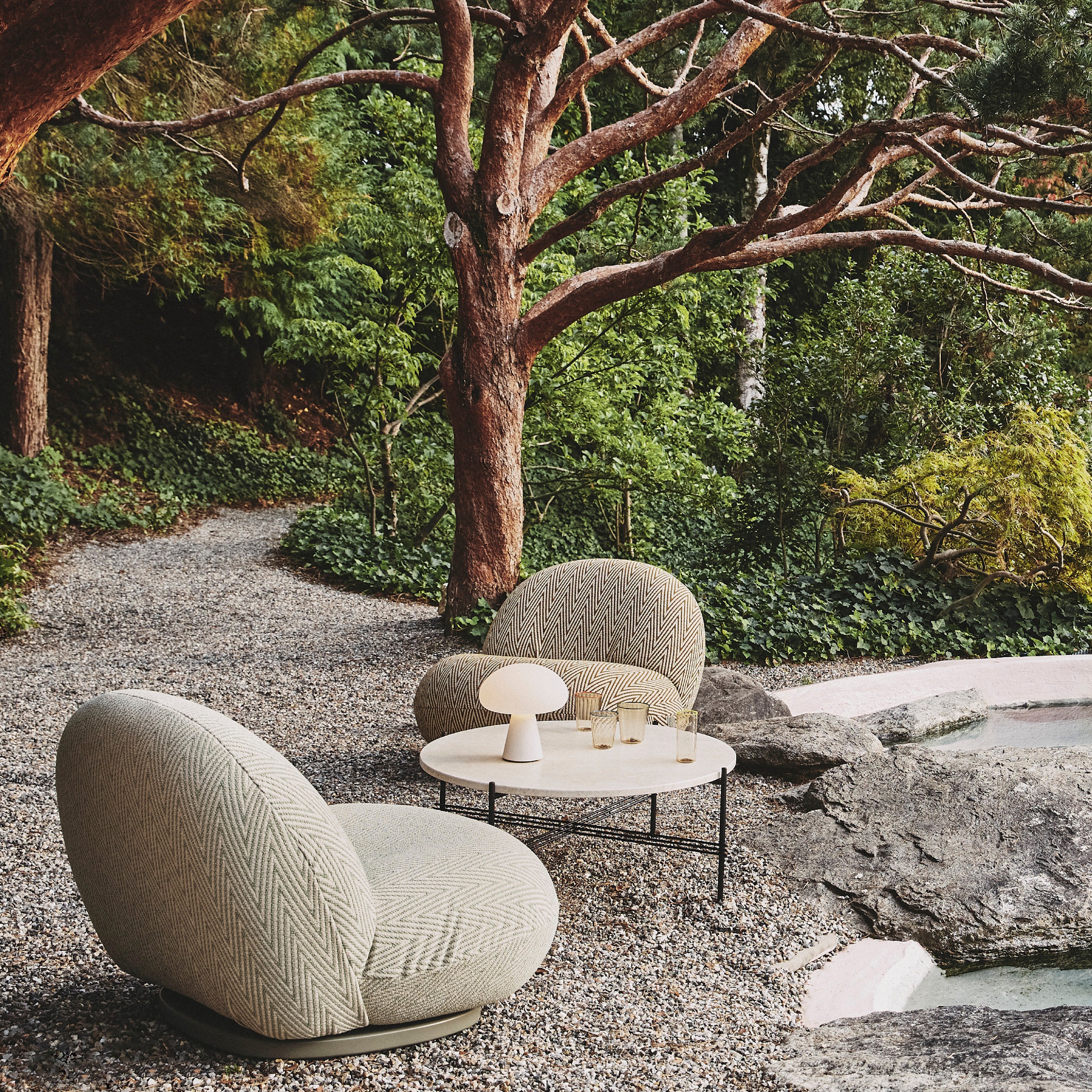 With a luxurious tabletop in white travertine and a base in back powder-coated stainless steel, Gubi goes alfresco with a coffee table from its TS range. The use of a matched-color marble and cement solution to fill the naturally occurring crevasses in the beautifully veined stone results in a durable surface able to withstand the elements—and gain a beautiful patina over time. GamFratesi's understated design easily mixes with seating and other pieces from the outdoor collection.