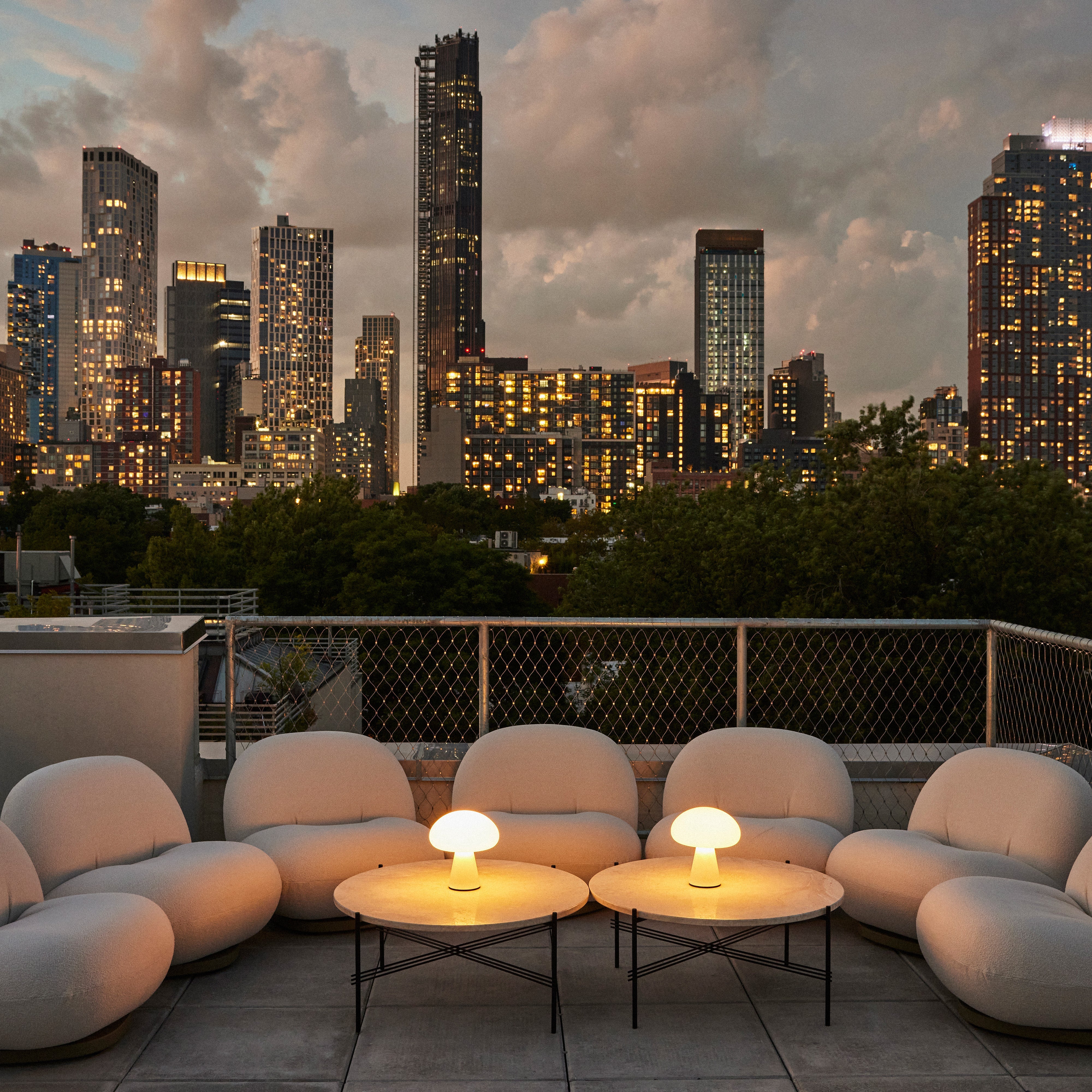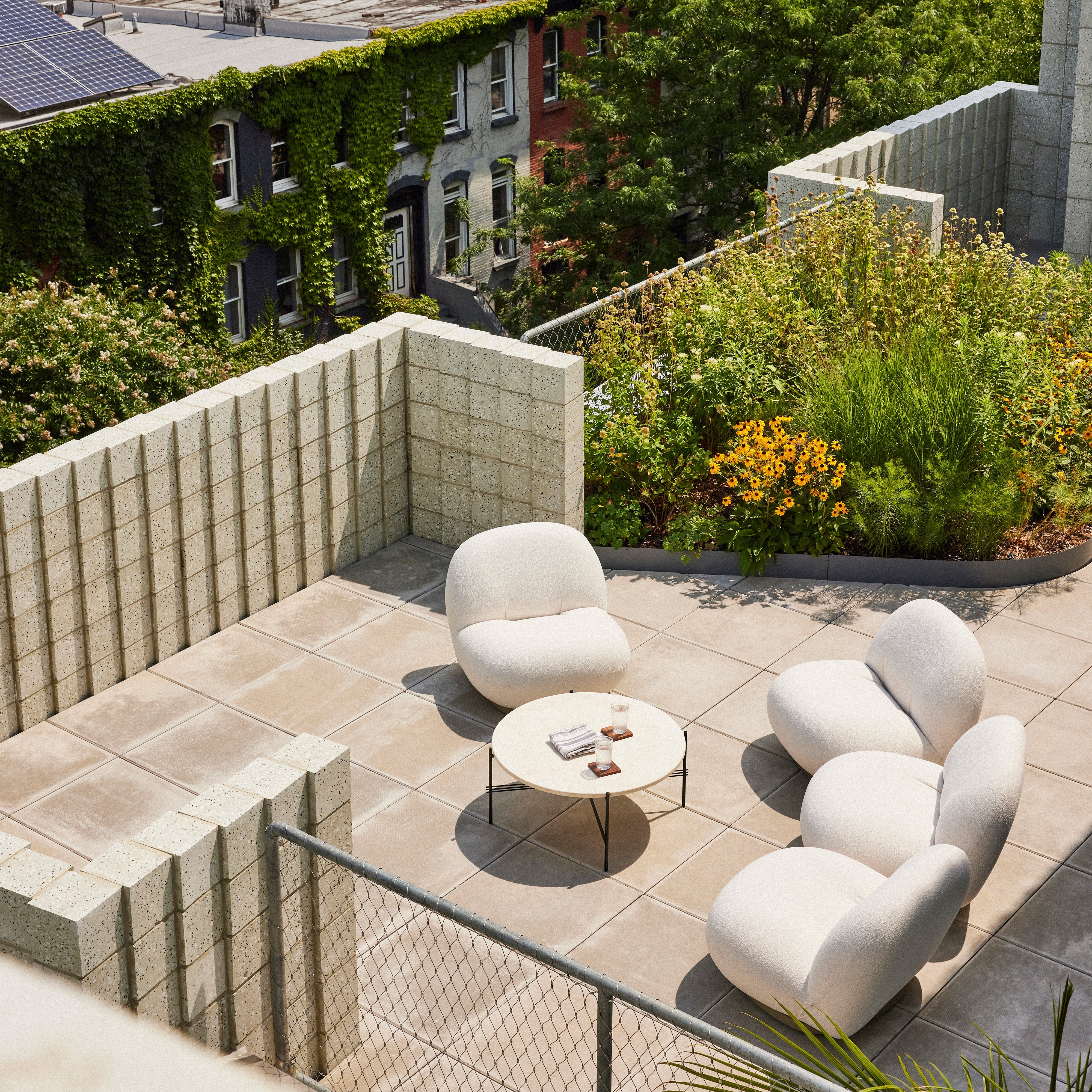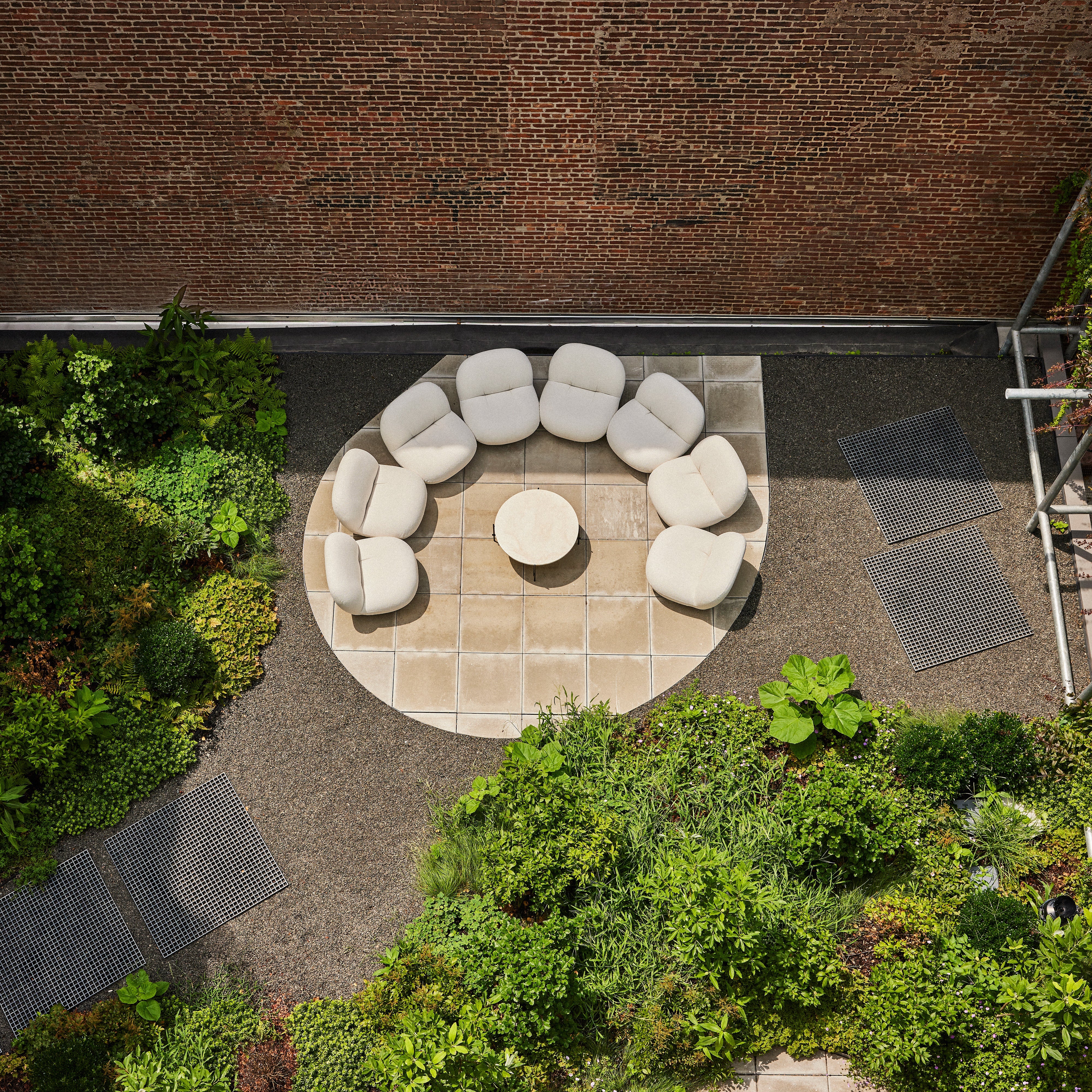 With a luxurious tabletop in white travertine and a base in back powder-coated stainless steel, Gubi goes alfresco with a coffee table from its TS range. The use of a matched-color marble and cement solution to fill the naturally occurring crevasses in the beautifully veined stone results in a durable surface able to withstand the elements—and gain a beautiful patina over time. GamFratesi's understated design easily mixes with seating and other pieces from the outdoor collection.