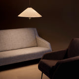 Soft ambient light filters through a tapered cotton‑canvas shade, casting a warm glow downward and a gentle radiance around the fixture. Paavo Tynell’s signature brass accents—including a decorative element beneath the fabric diffuser—introduce a quiet elegance that balances simplicity with detail.