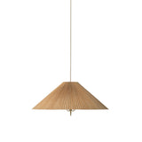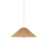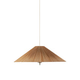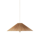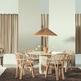 Light filters through hand-sewn bamboo slats that shape the conical shade, gently diffused by a linen liner to create ambient warmth and a subtle upward glow. Polished brass details accent the natural materials with understated elegance. A fabric diffuser beneath the bulb softens the light, complemented by a decorative brass flourish.